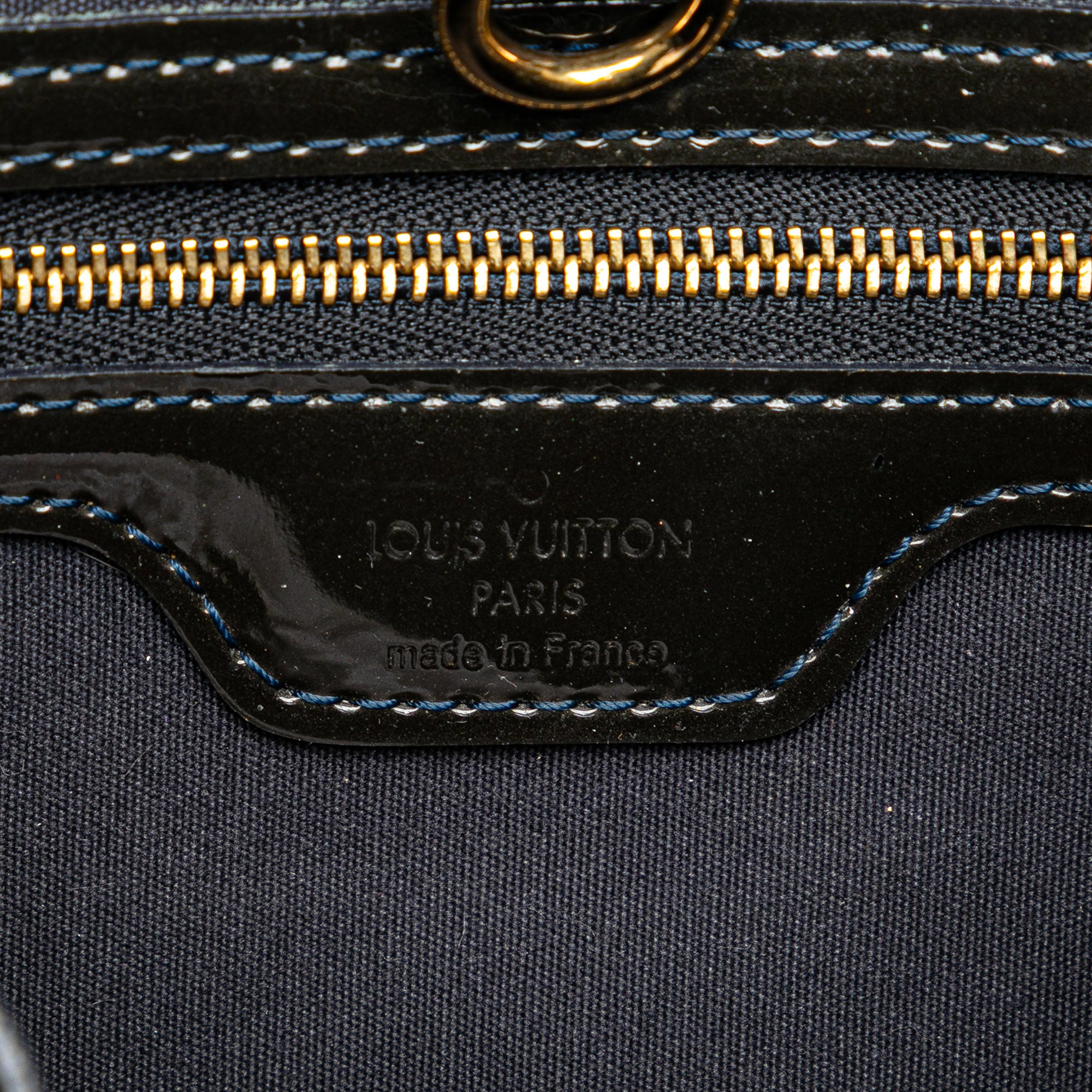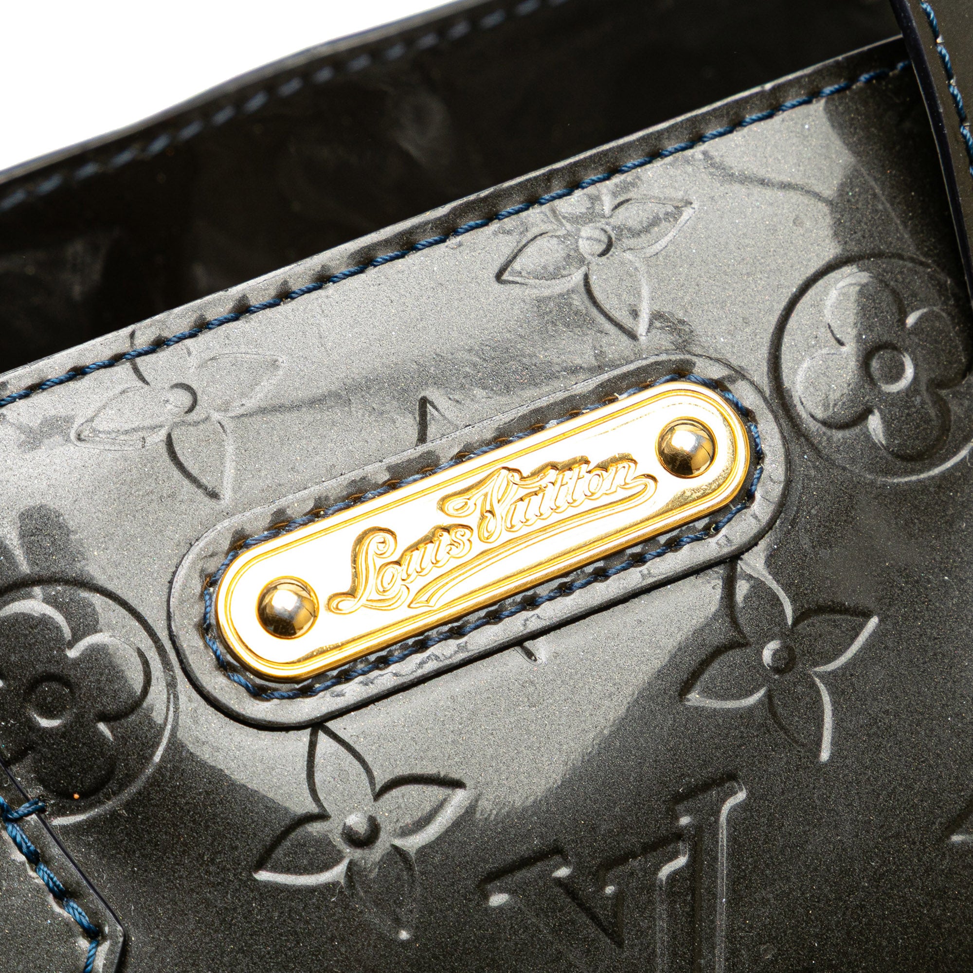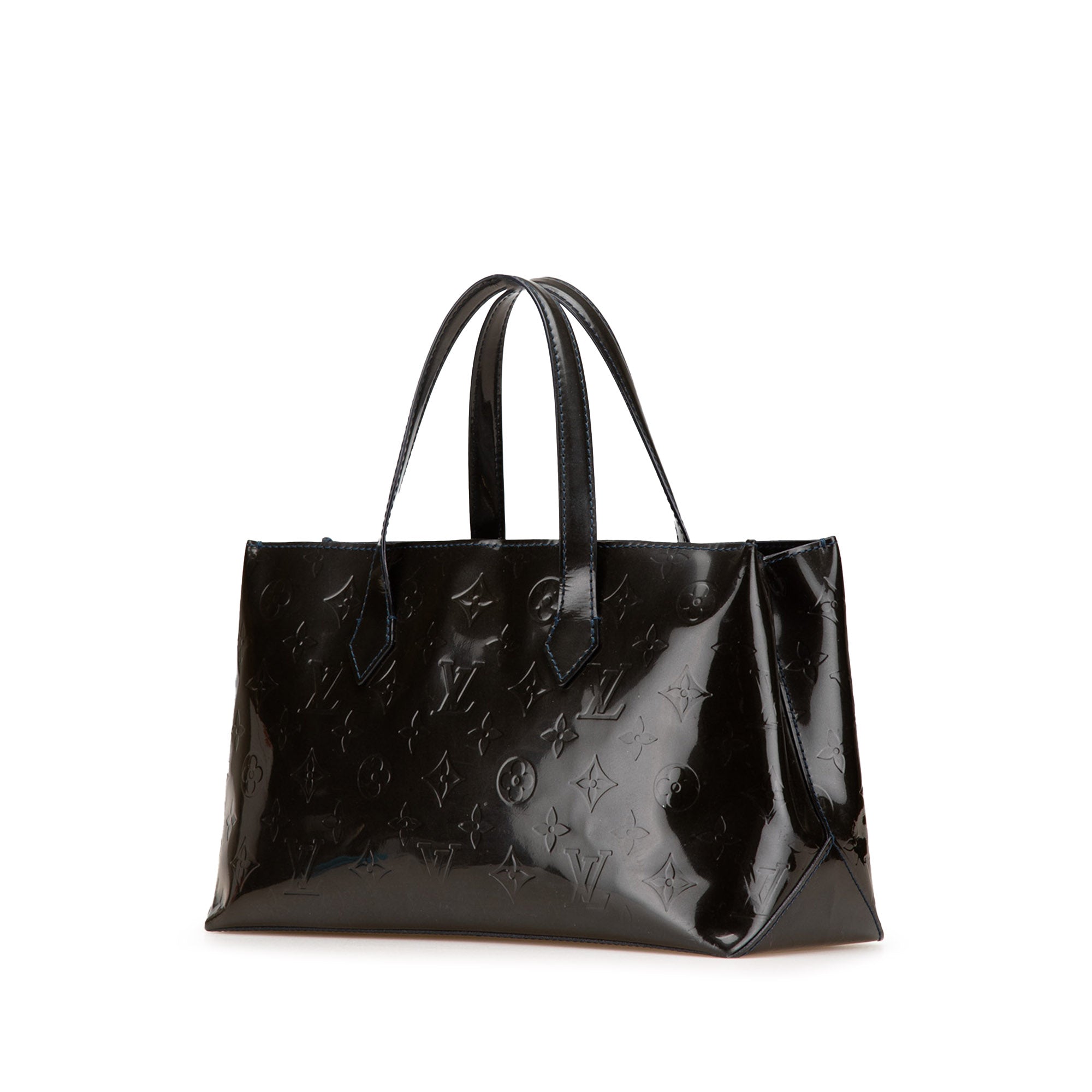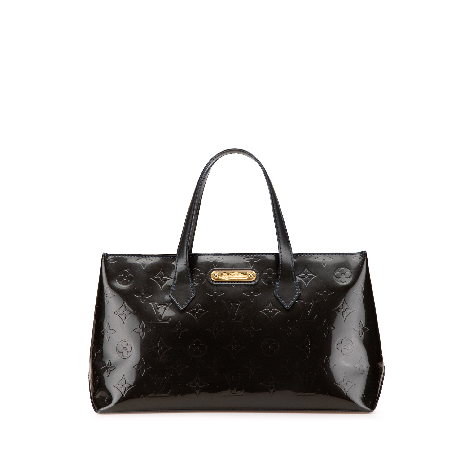 The Wilshire PM features a monogram vernis leather body, flat leather handles, an open top with lobster clasp closure, and an interior zip pocket. Retail Price: 845.00