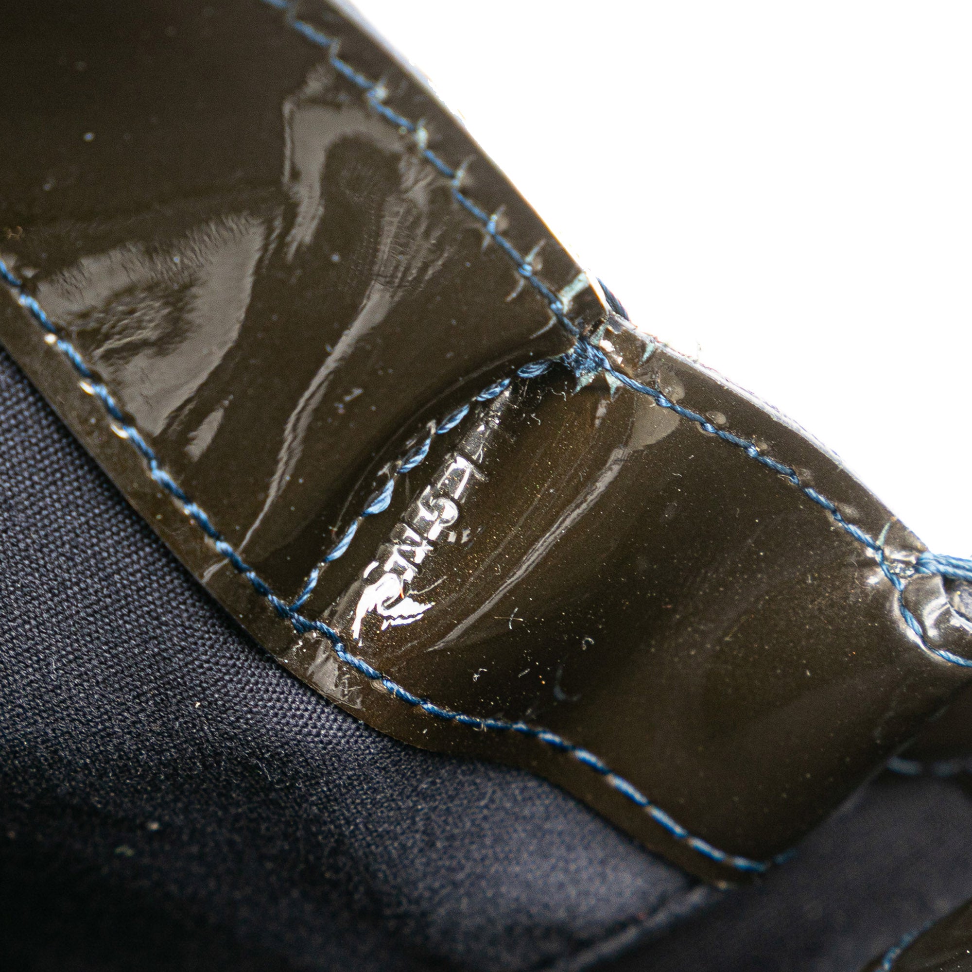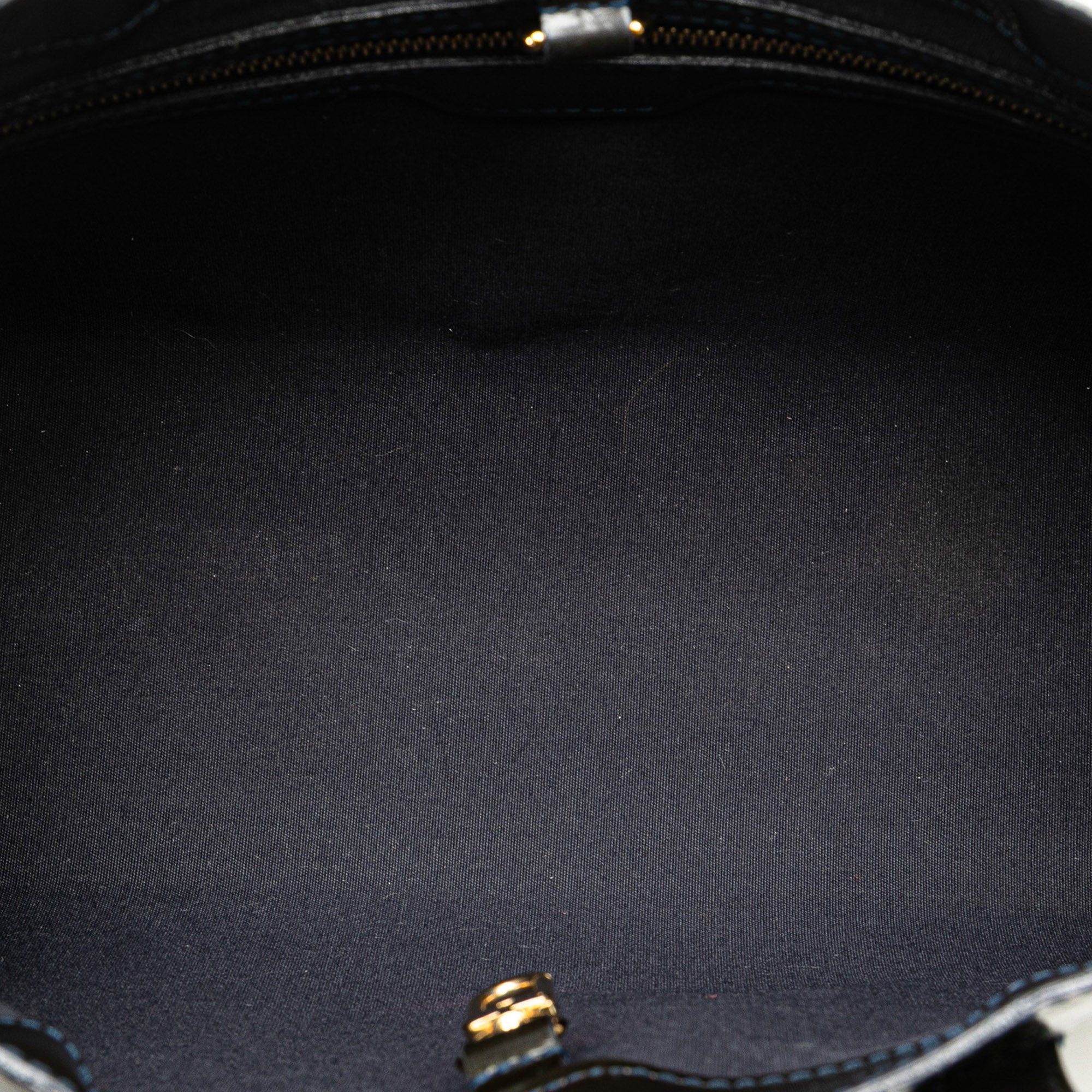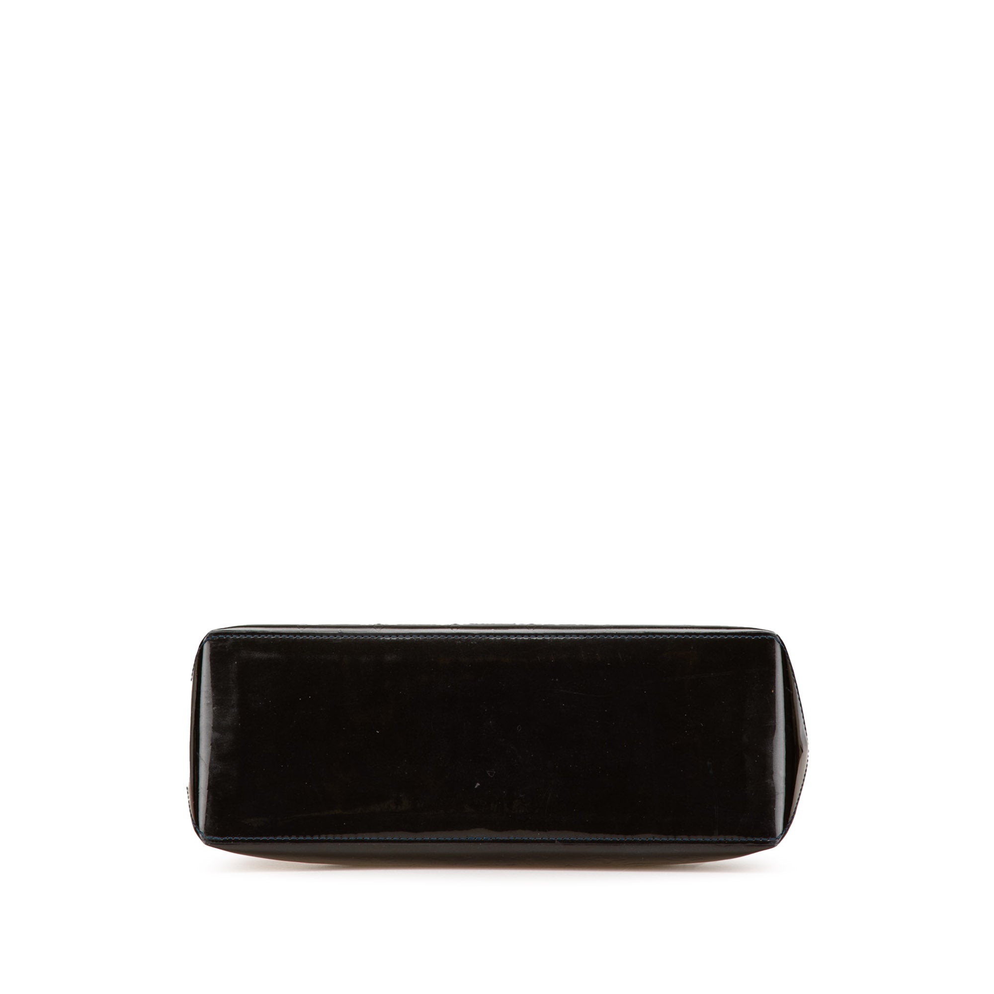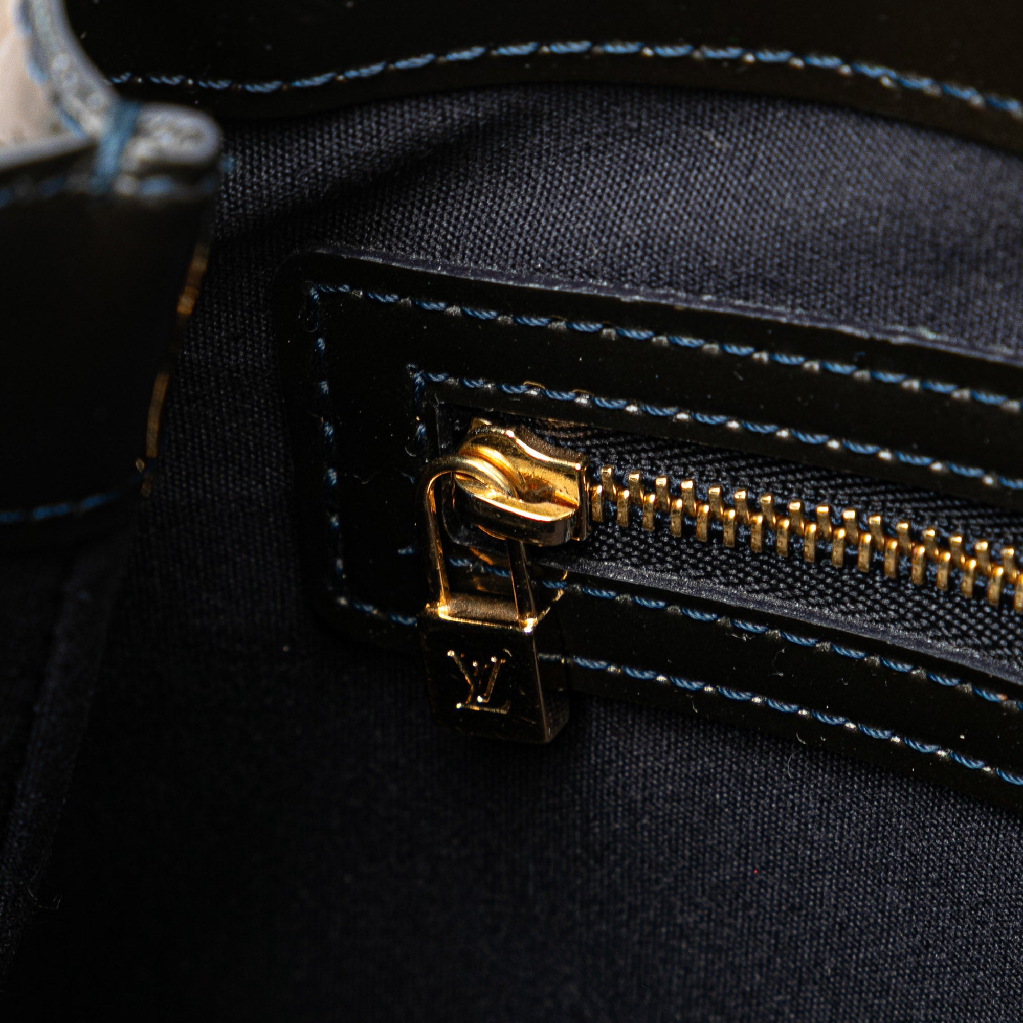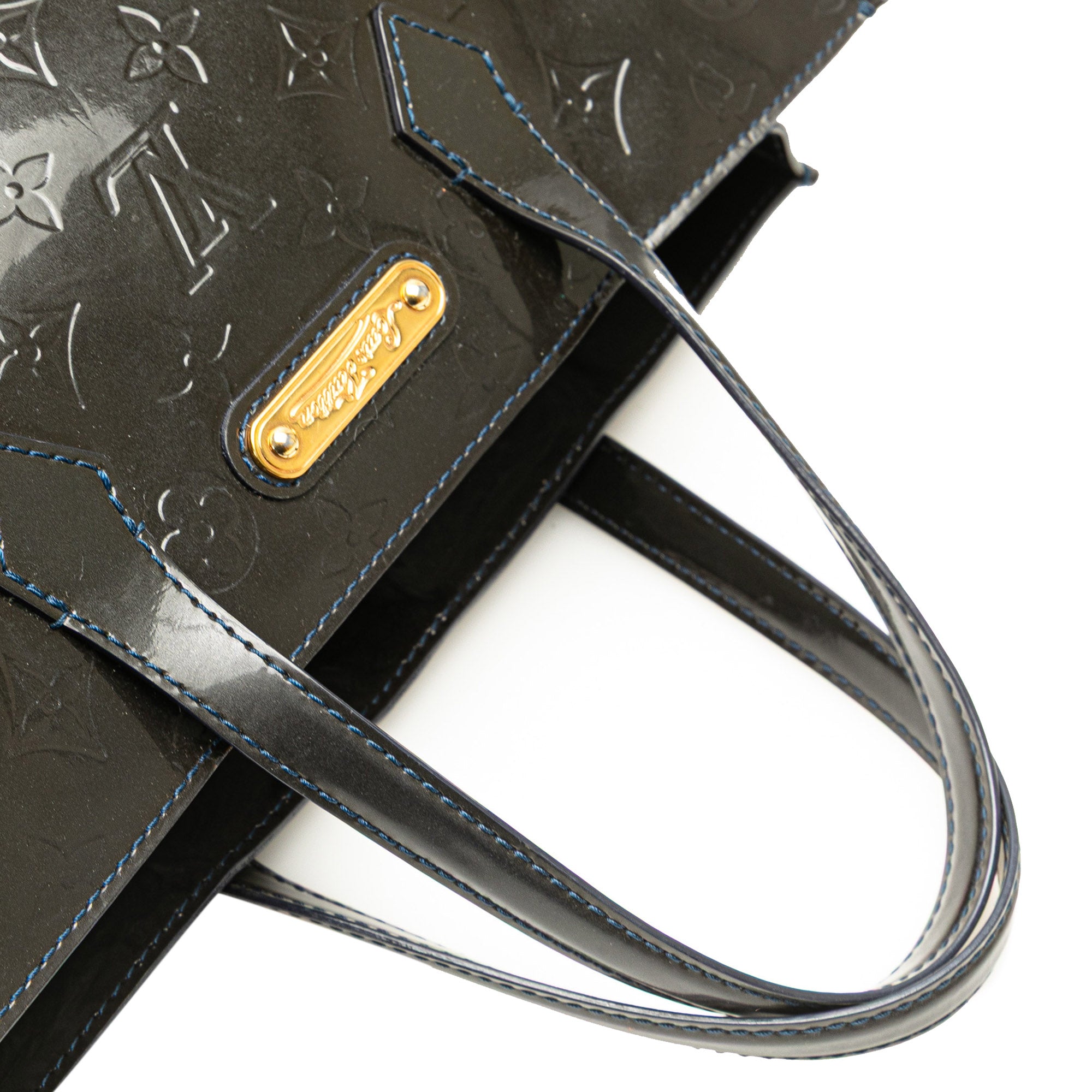 The Wilshire PM features a monogram vernis leather body, flat leather handles, an open top with lobster clasp closure, and an interior zip pocket. Retail Price: 845.00