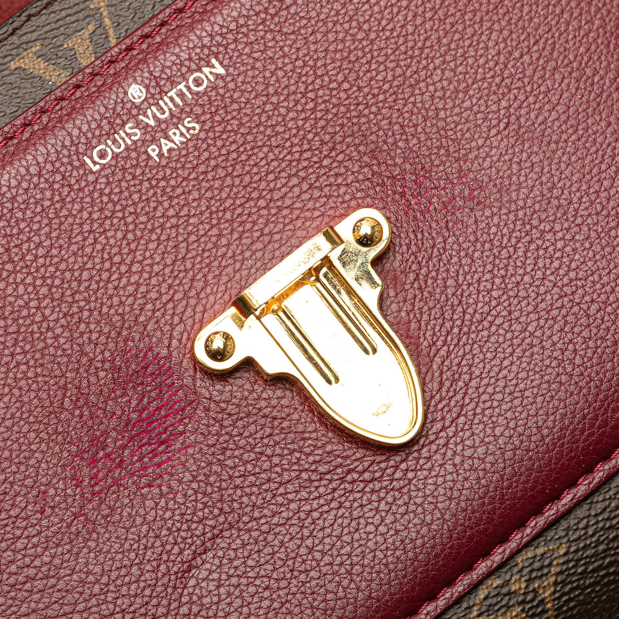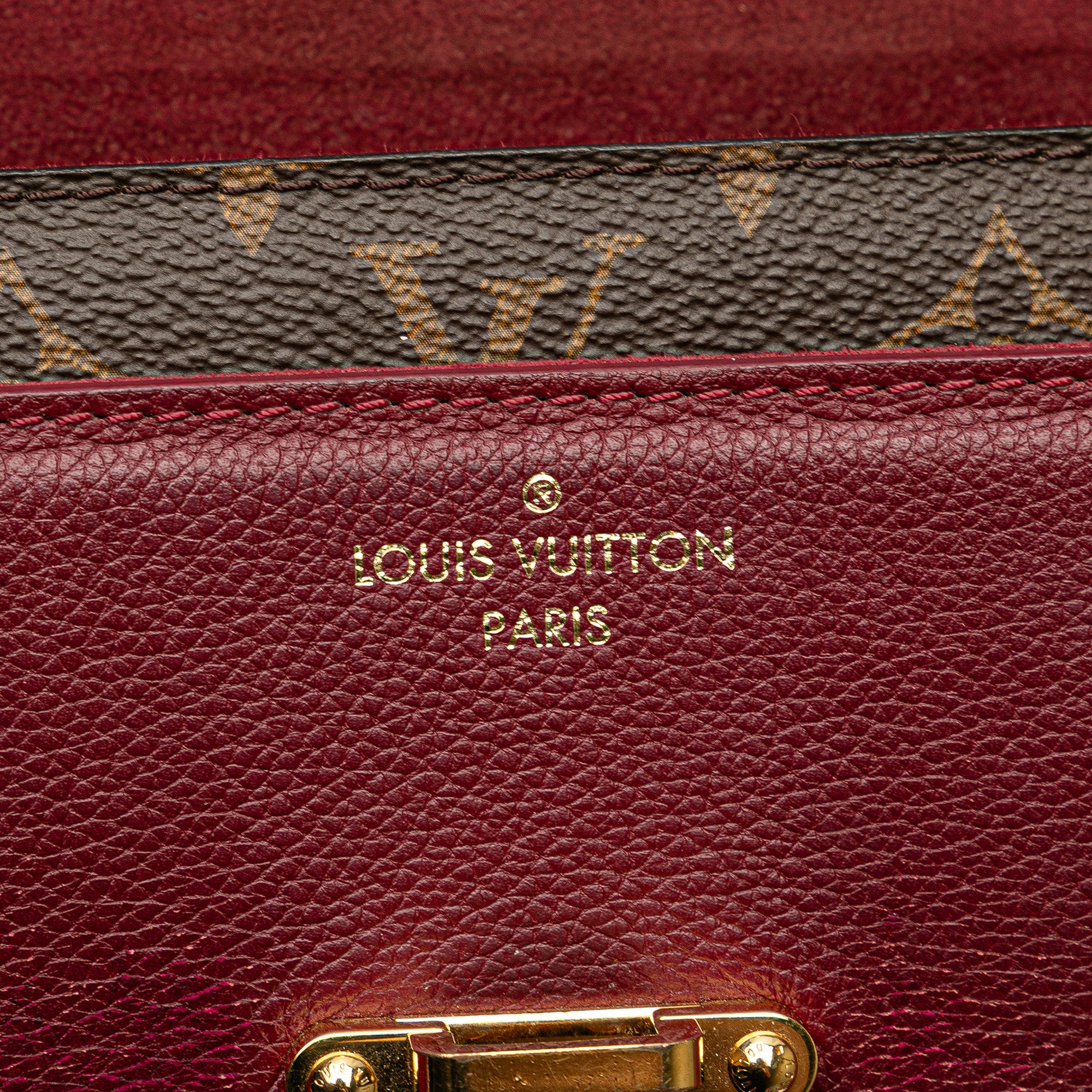The Victoire features a monogram canvas body with leather trim, a chain shoulder strap, a front flap with gold-tone metal push lock closure, and an interior zip pocket. Retail Price: 2830.00