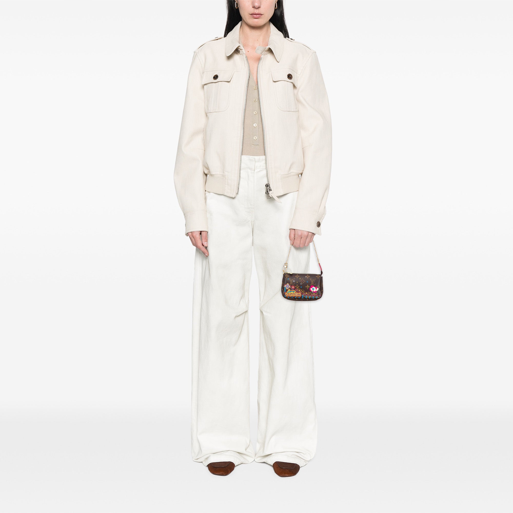 The Mini Pochette Accessoires features a monogram canvas body, a gold-tone chain handle, and a top zip closure. Retail Price: 1560.00