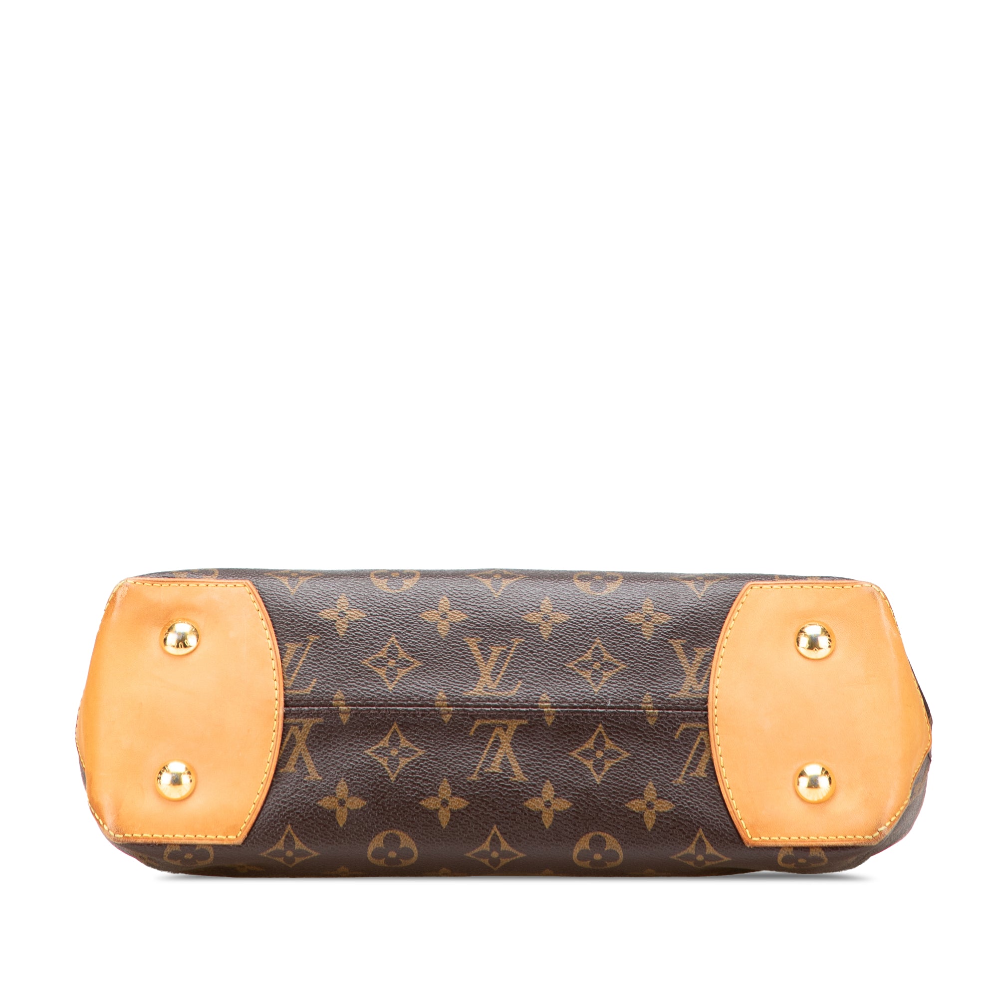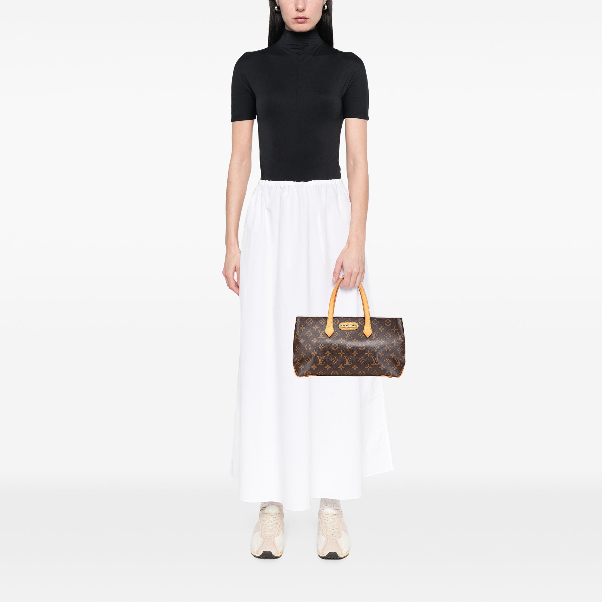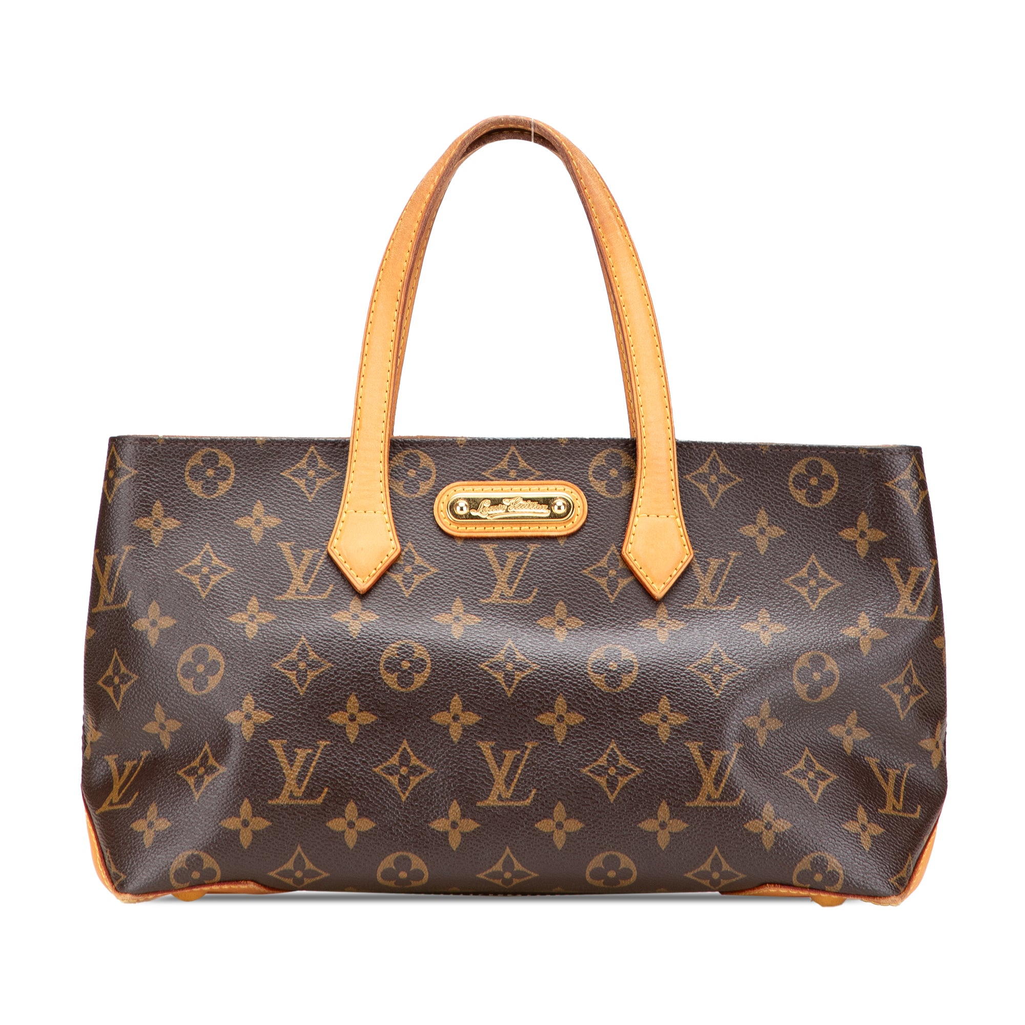 The Wilshire features a monogram canvas body with vachetta leather trim, flat vachetta leather straps, an open top with clasp closure, and an interior zip pocket. Retail Price: 1080.00