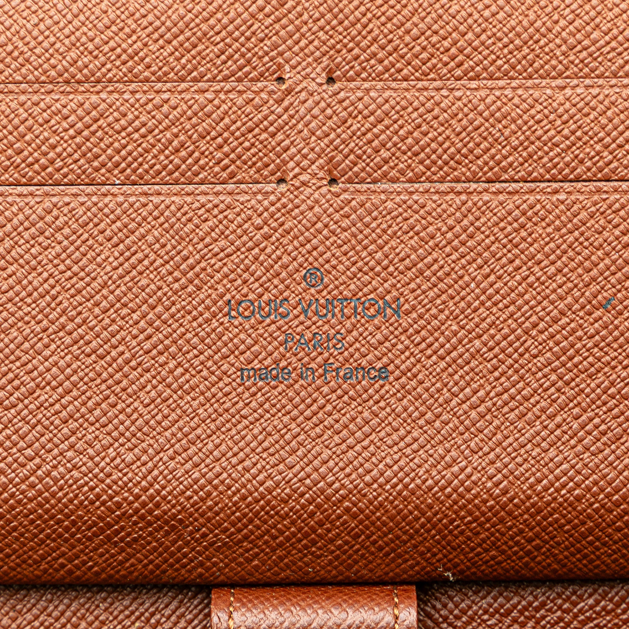 This organizer wallet features a monogram canvas body, a zip around closure, and interior zip and slip compartments. Retail Price: 1000.00