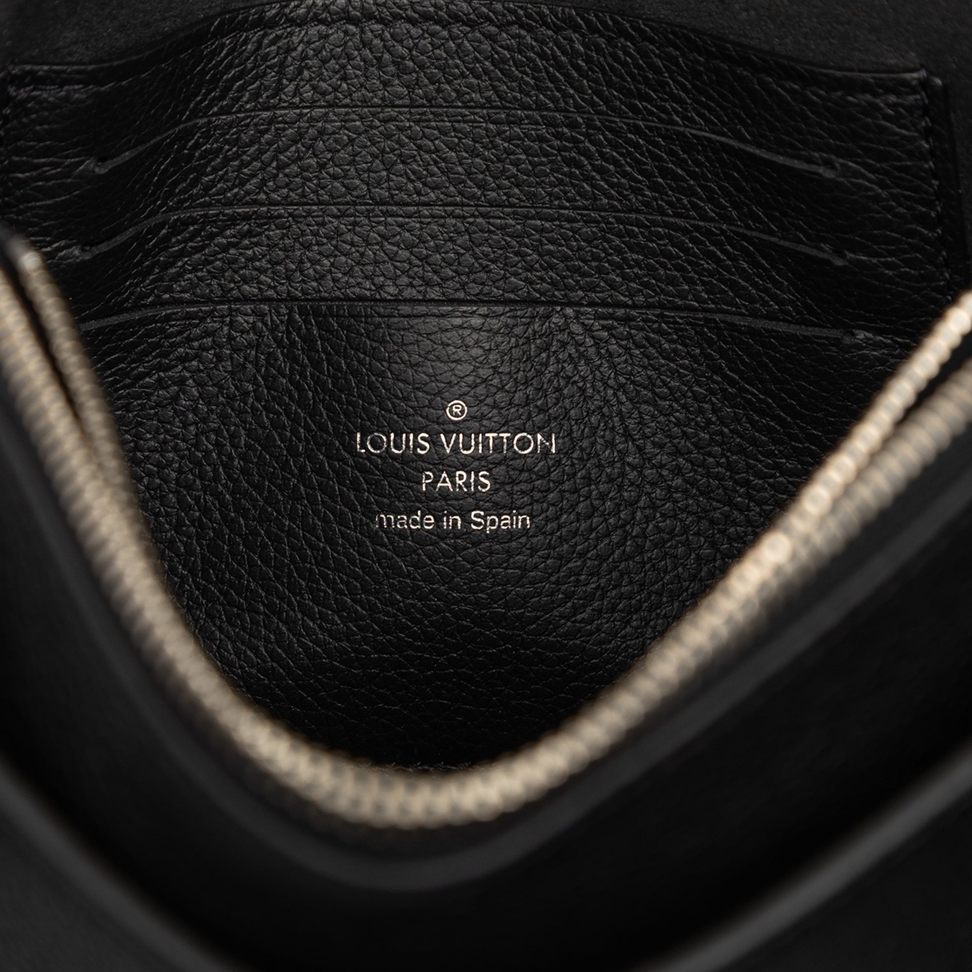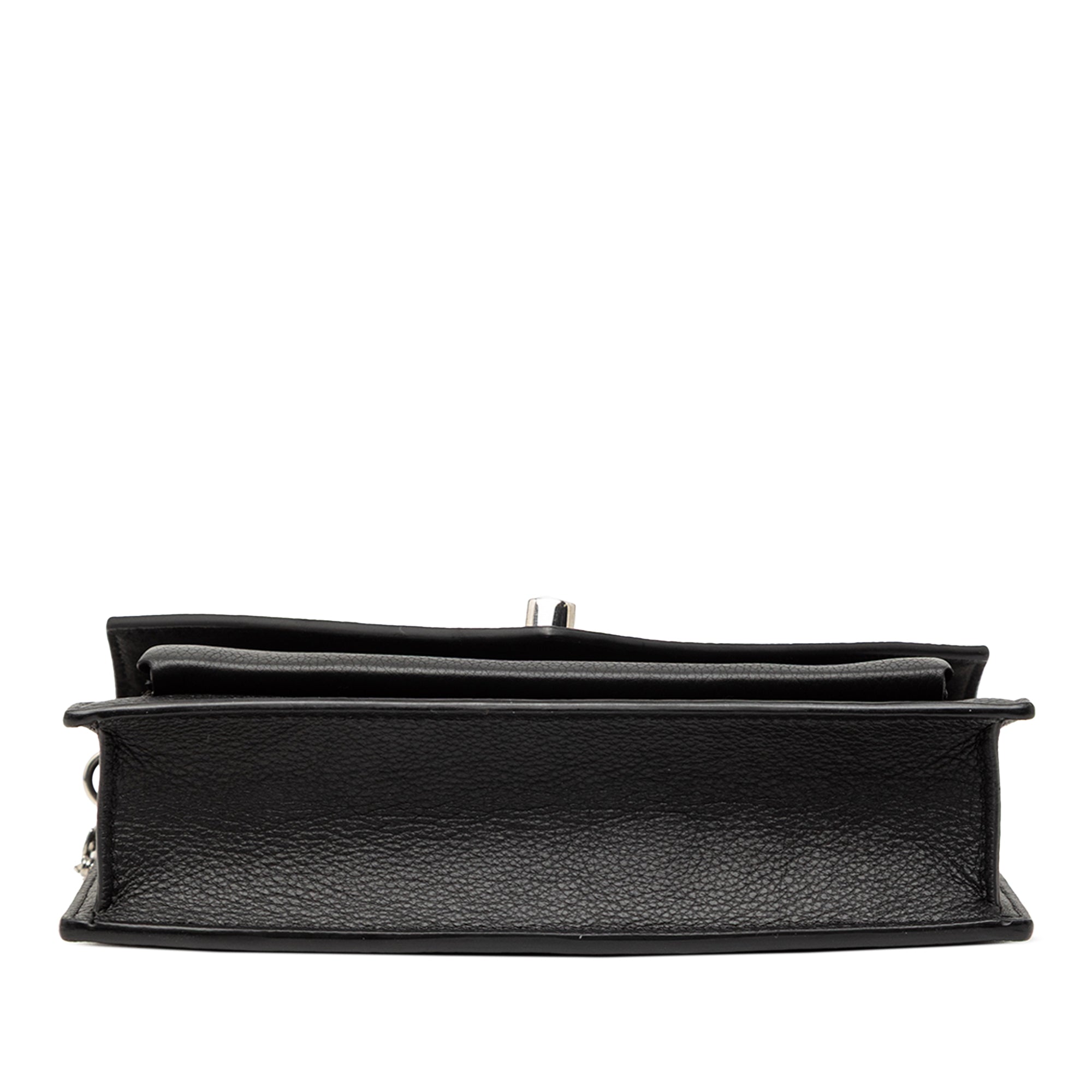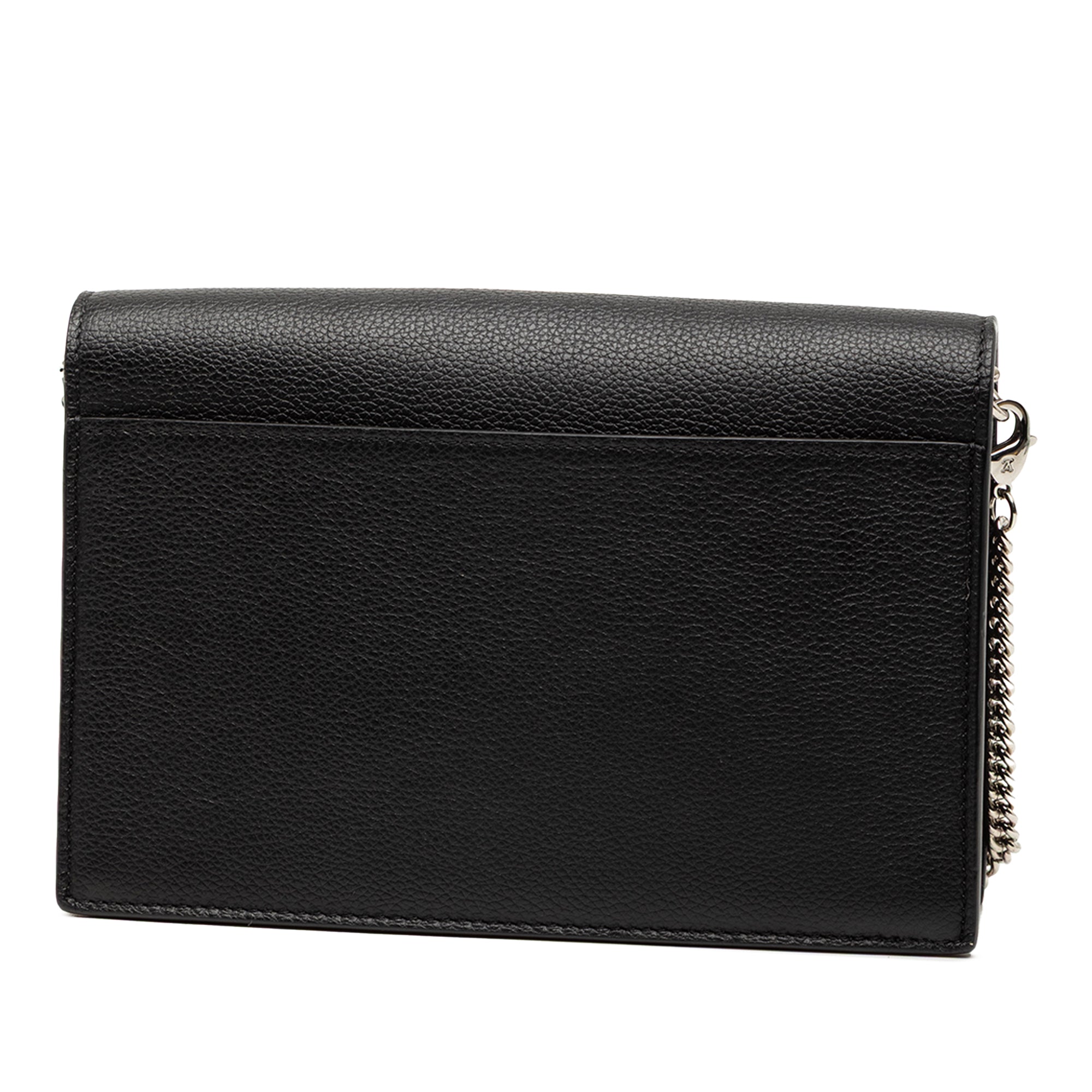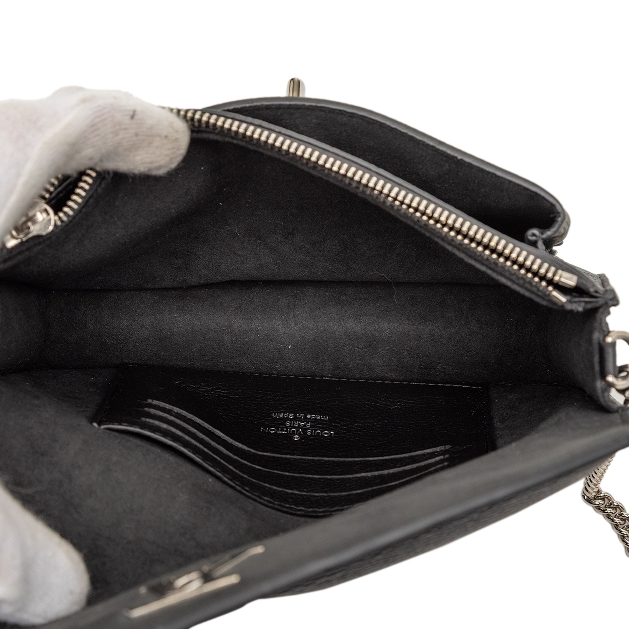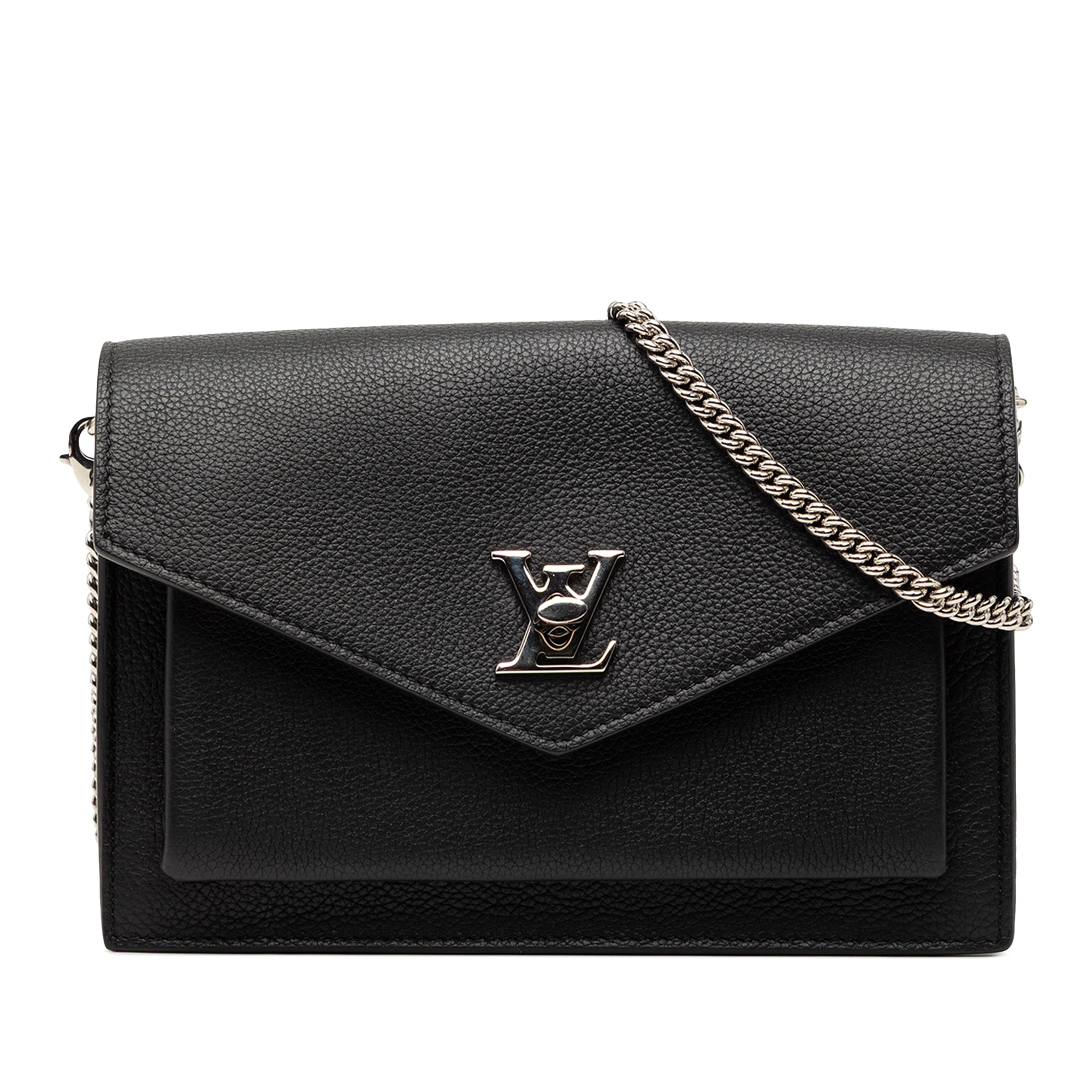 The MyLockMe Pochette features a leather body, a removable chain shoulder strap, a front flap with twist lock closure, an exterior front slip pocket, and interior zip and slip pockets. Retail Price: 2140.00