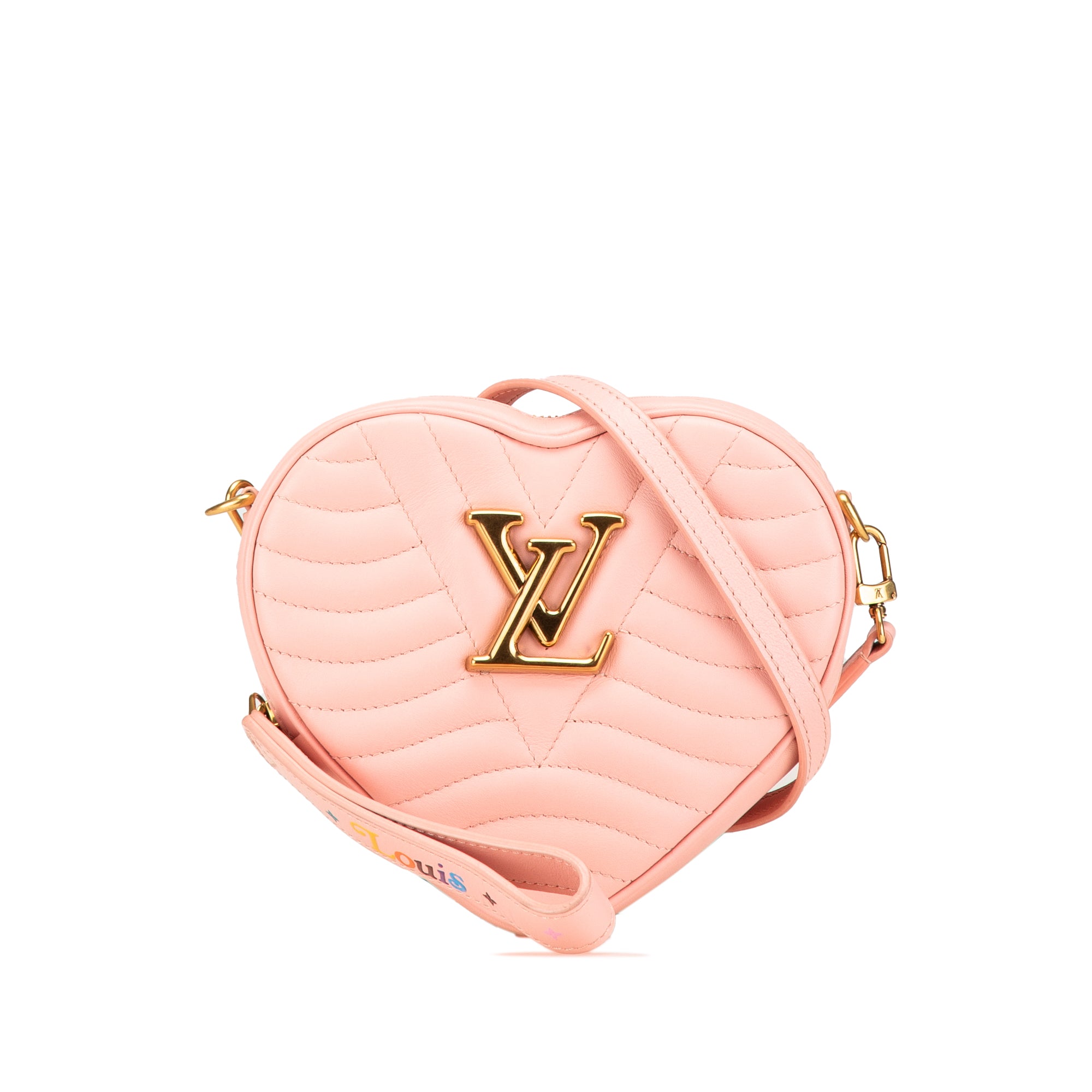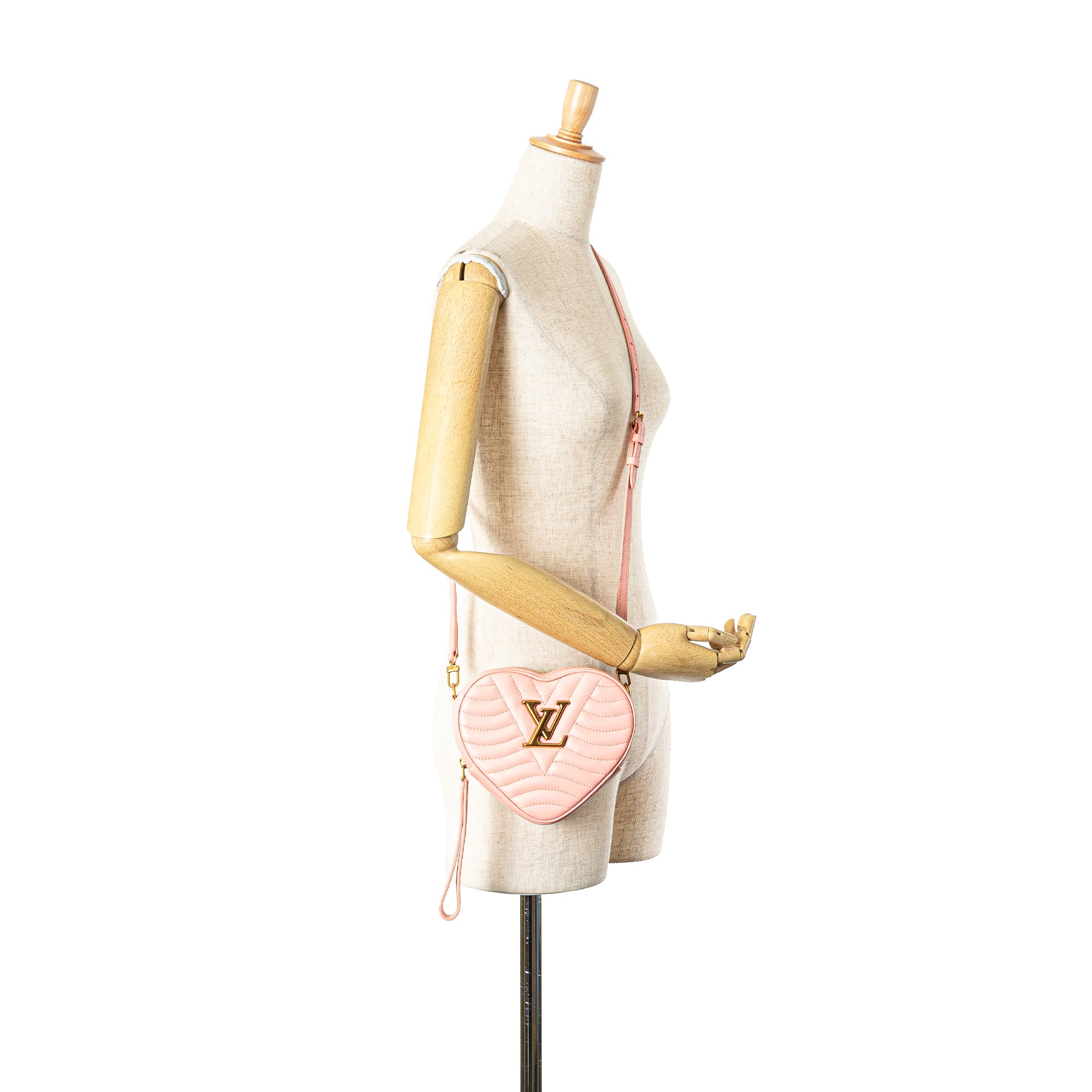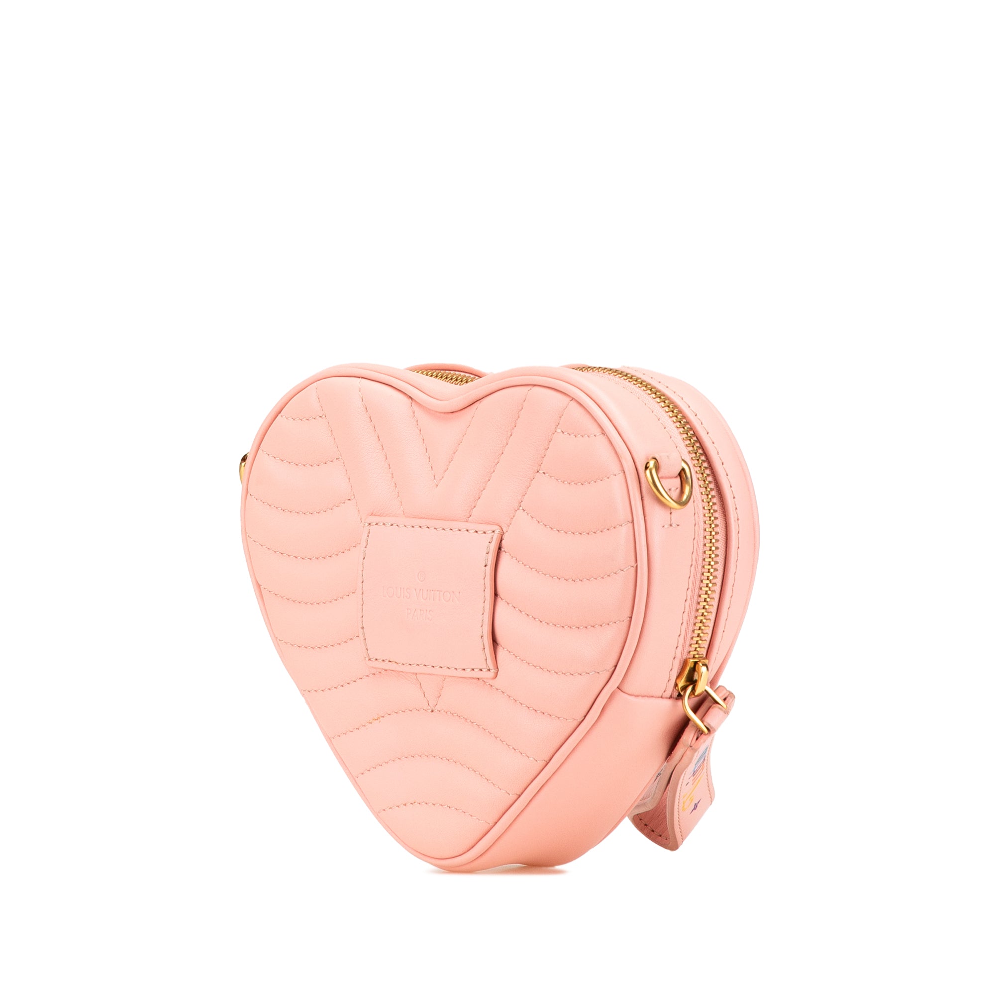 The New Wave Heart bag features a quilted leather body, a detachable flat leather strap, a top zip closure, and an interior slip pocket. Retail Price: 2570.00
