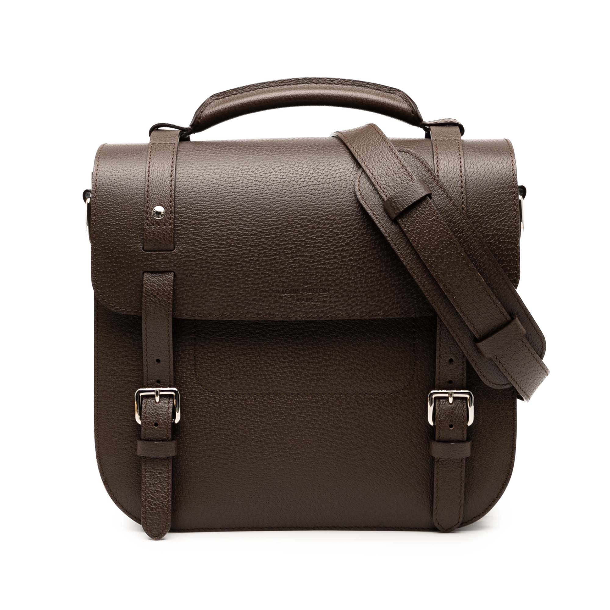 This satchel features a pigskin leather body, a rolled leather top handle, detachable flat leather strap, front flap with dual buckle strap closure, an exterior back slip pocket, and interior zip and slip pockets. Inclusion: Dust bag. Retail Price: 3250.00