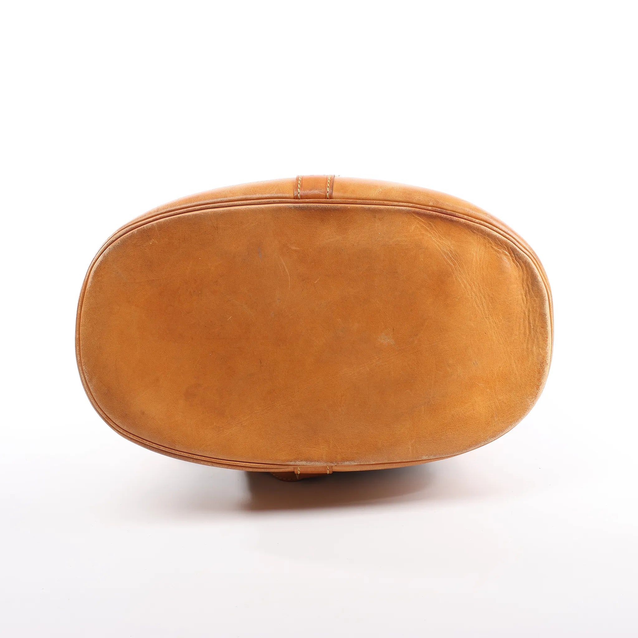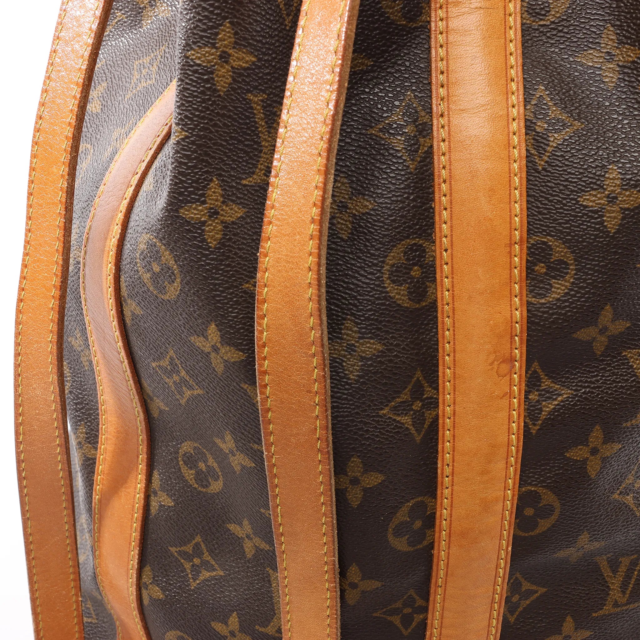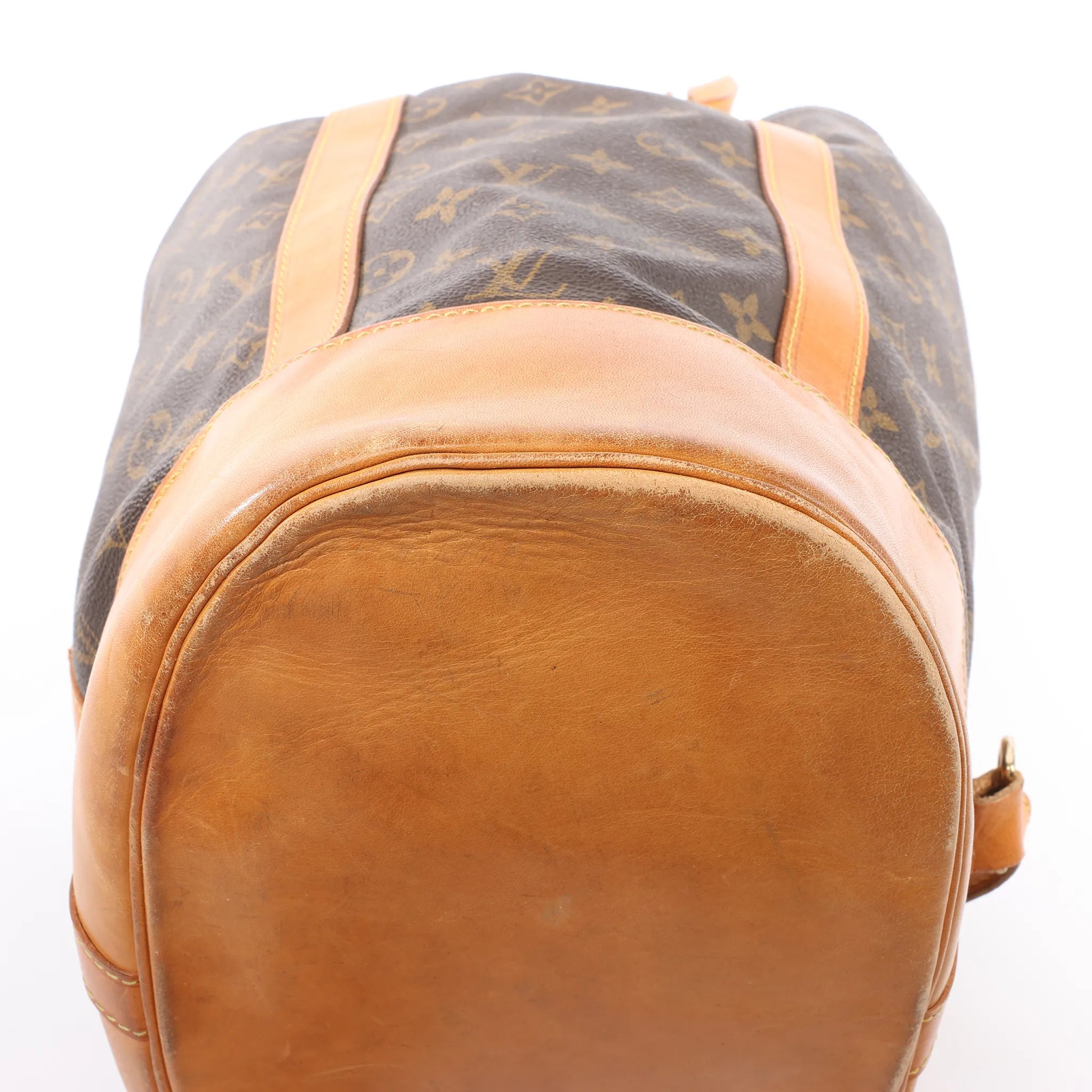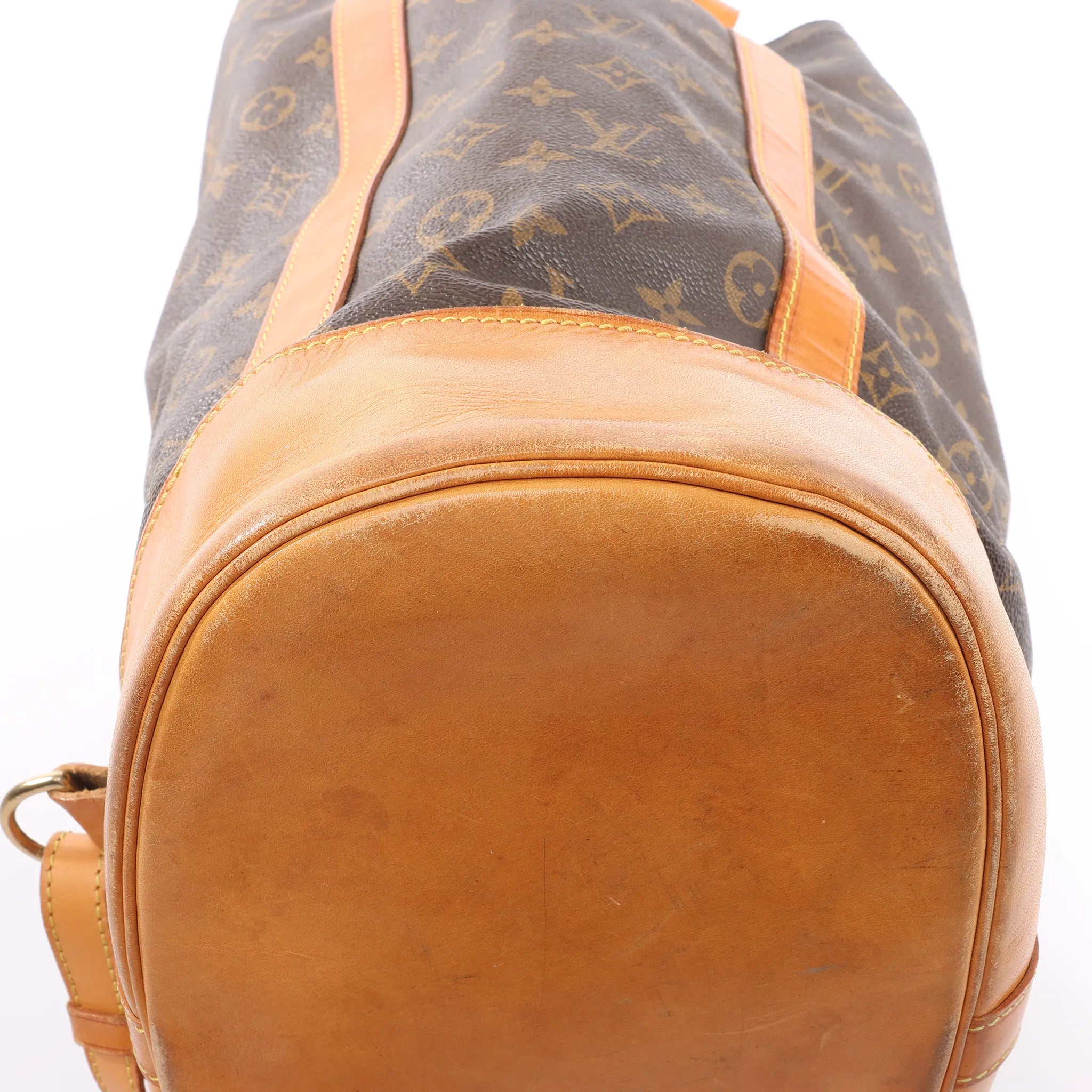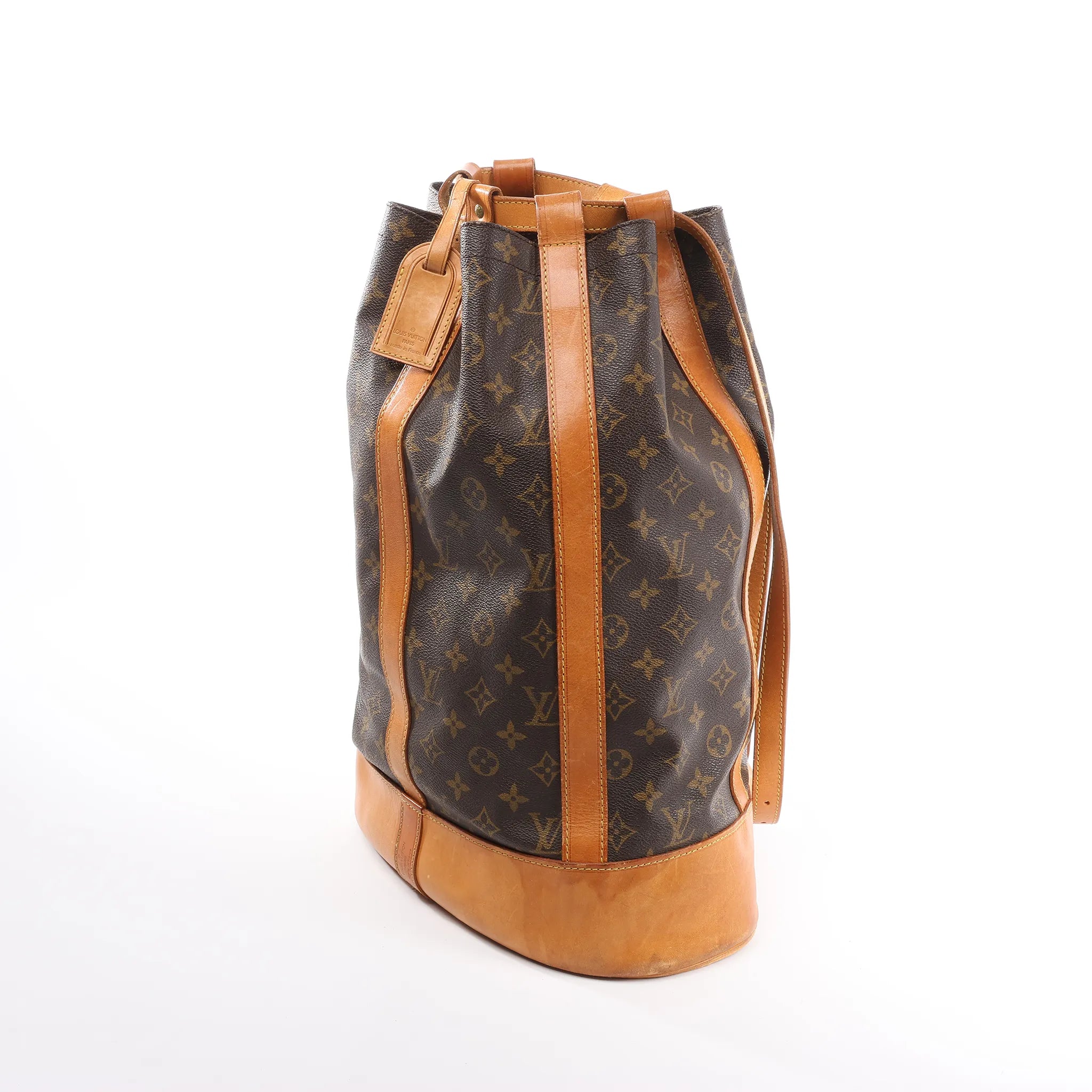 Louis Vuitton Randonnée GM (M42244) in brown Monogram canvas with vachetta leather trim—a classic bucket-style shoulder bag with a roomy interior, drawstring top, and an adjustable strap for easy everyday carry.