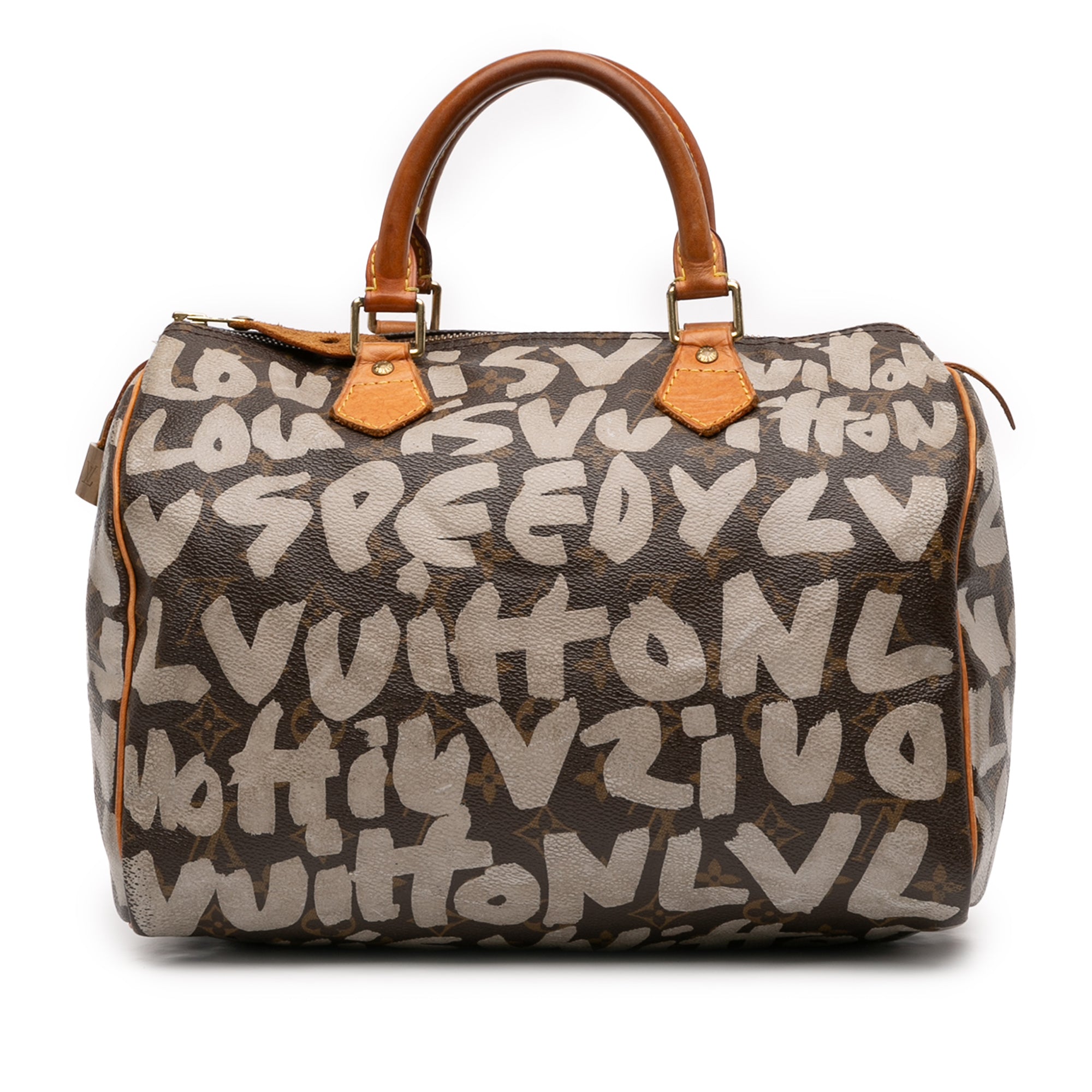 The Graffiti Speedy 30 features a printed monogram canvas body with vachetta leather trim, rolled vachetta leather handles, a top zip closure, and an interior slip pocket. Retail Price: 3690.00