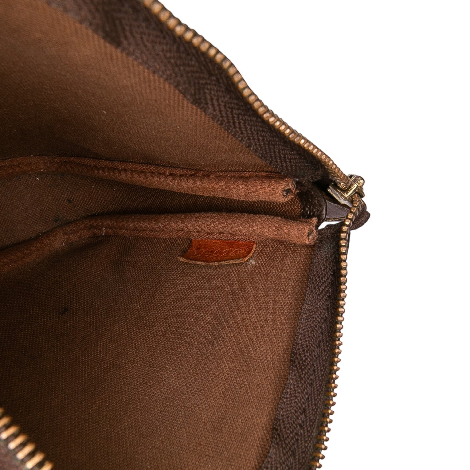 The Pochette Accessoires features a monogram canvas body, a detachable flat vachetta strap, and a top zip closure. Retail Price: 2700.00