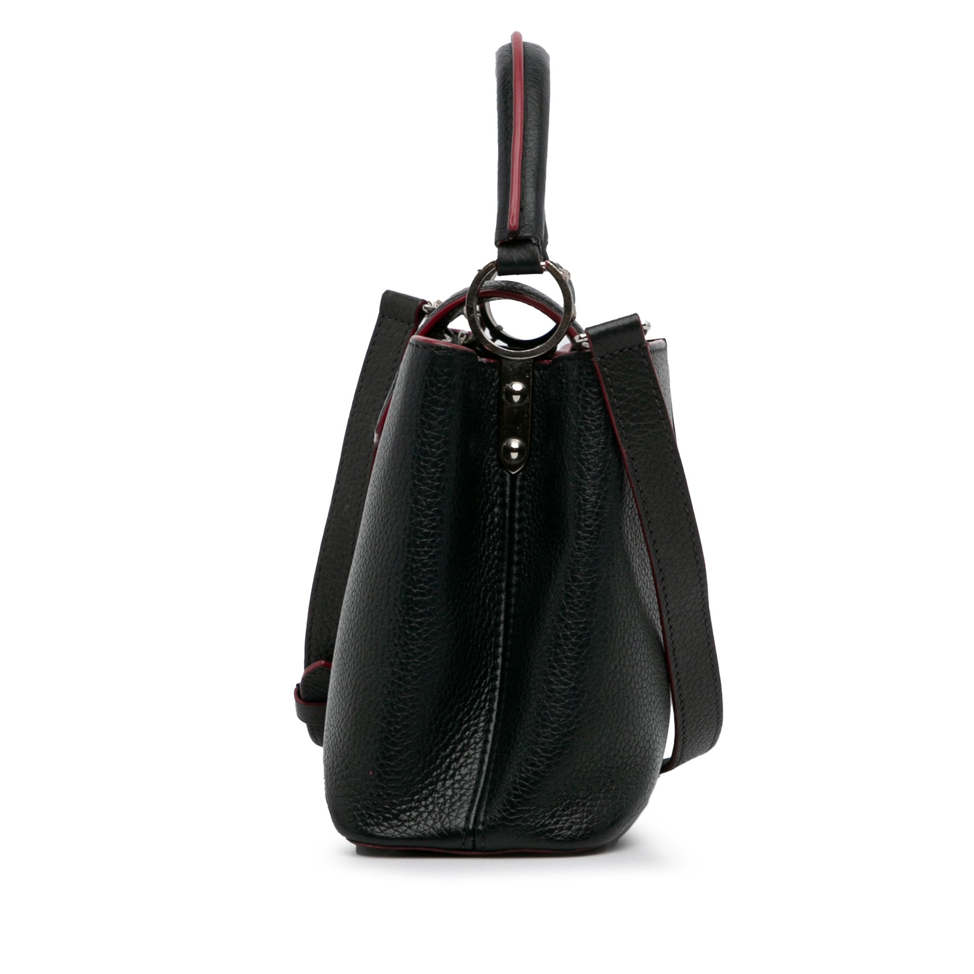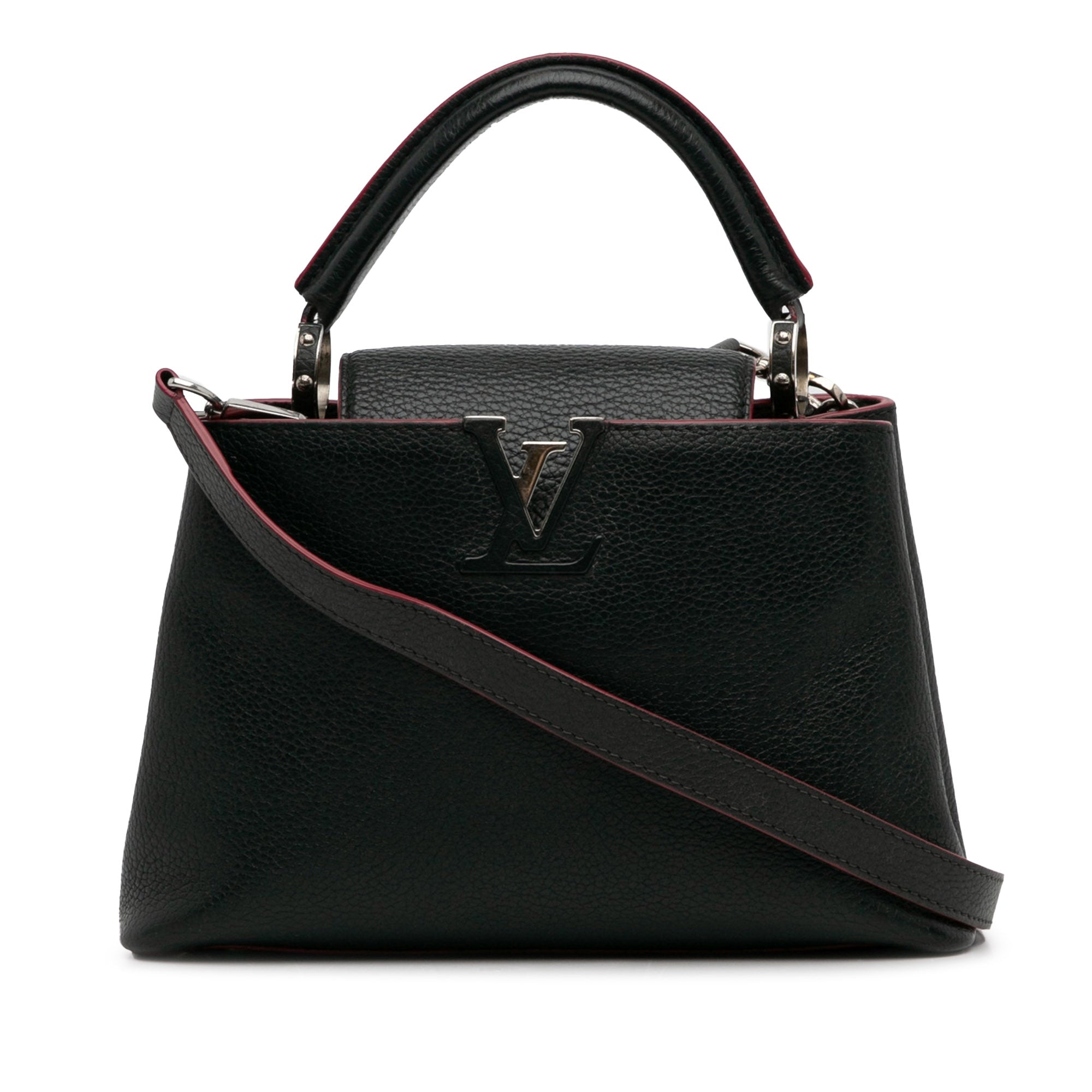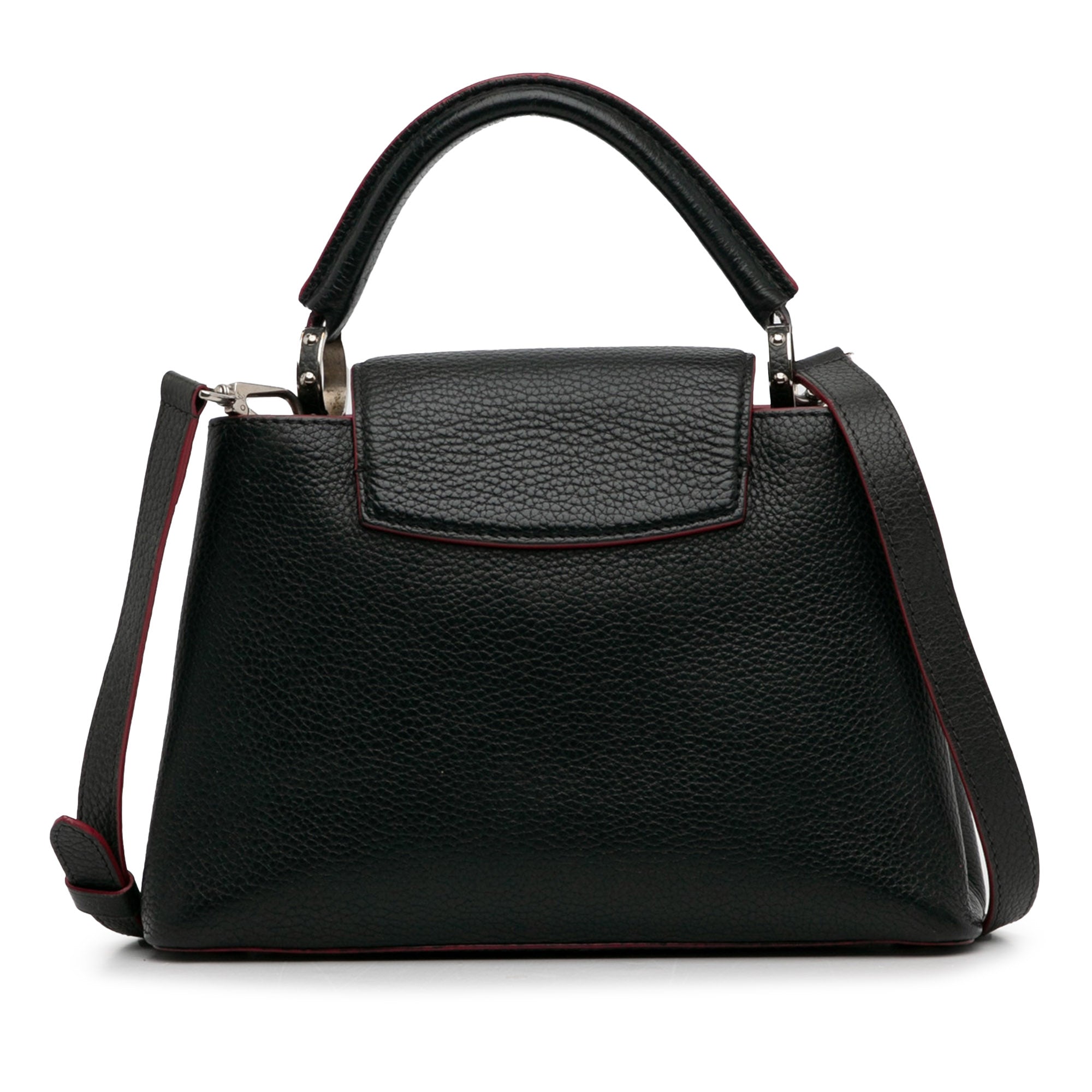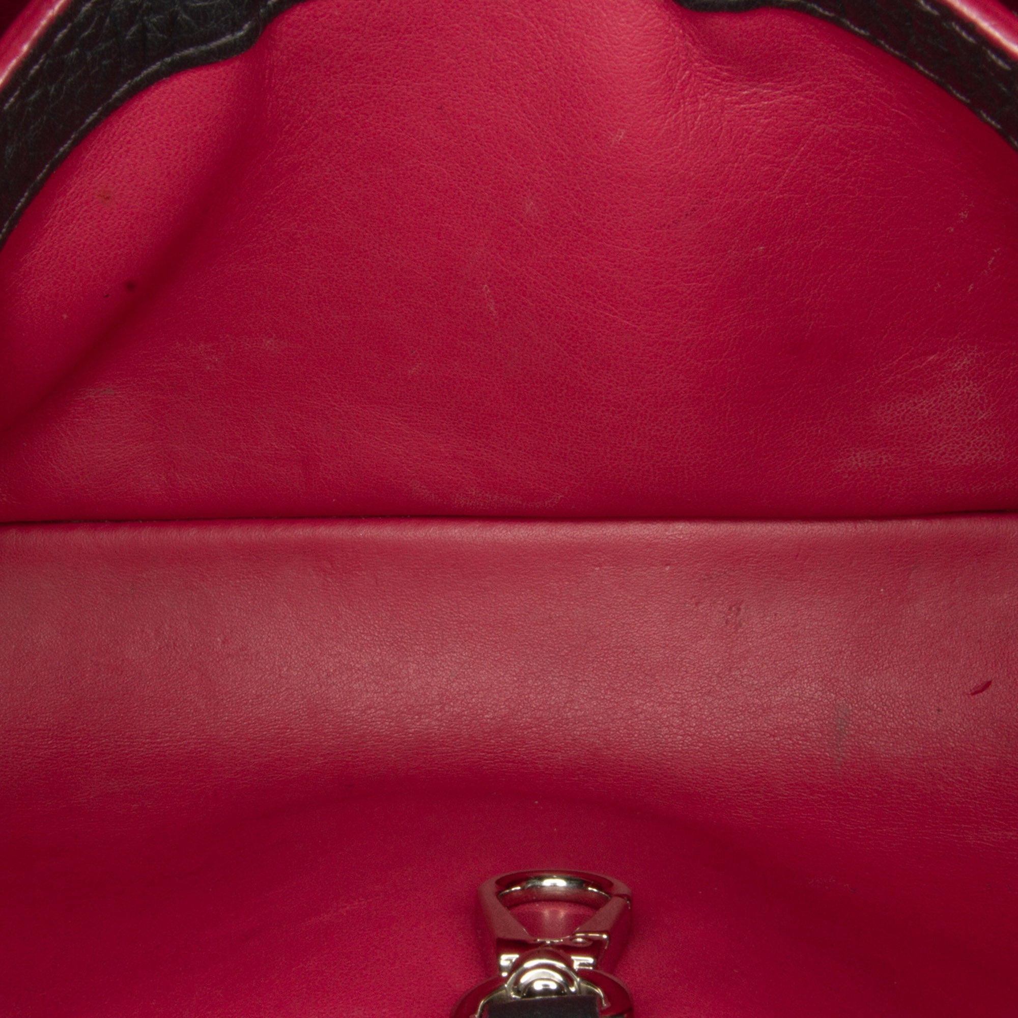 The Capucines BB features a leather body, a rolled leather handle, a detachable flat shoulder strap, an open top with a flap and snap button closure, and an interior zip pocket. Retail Price: 6750.00