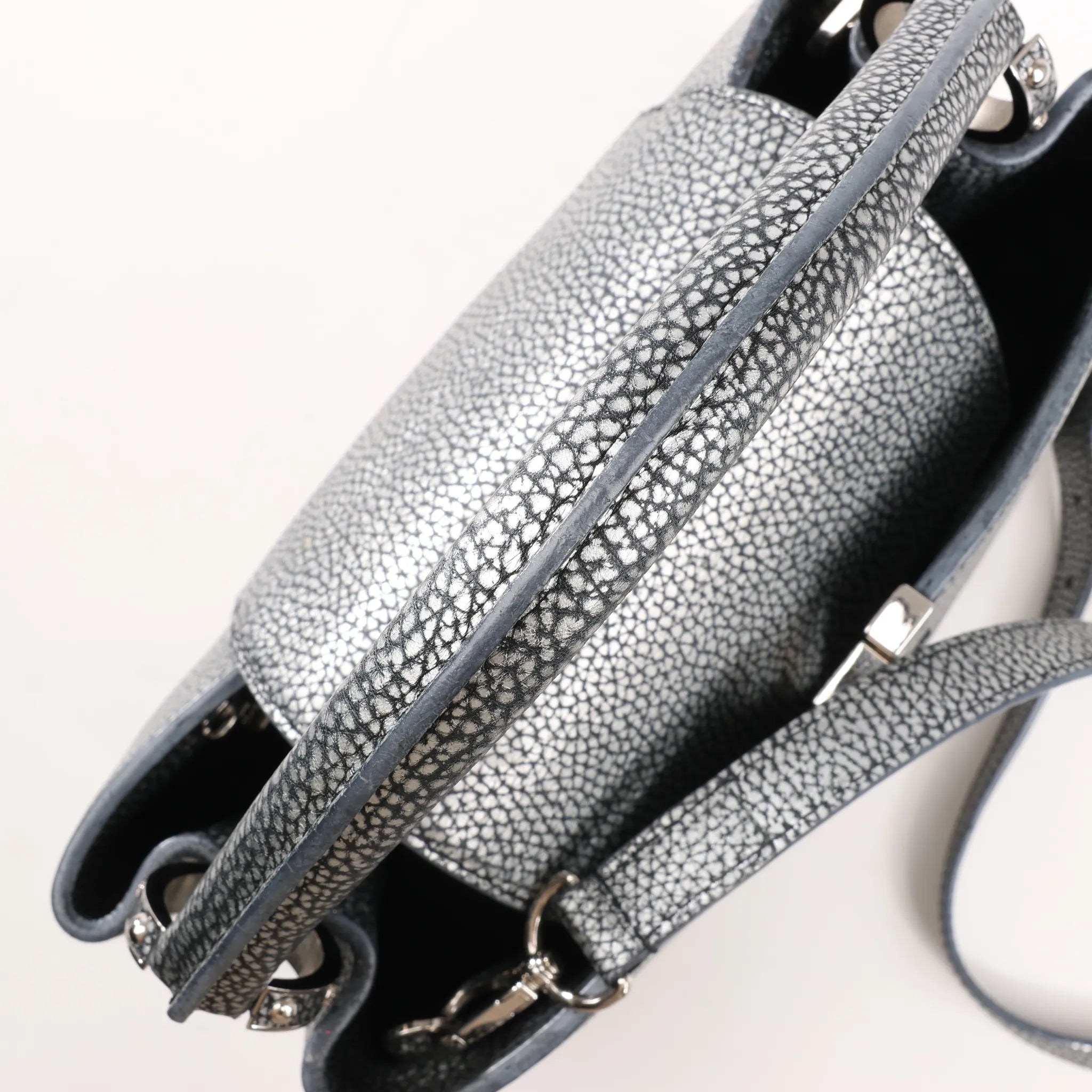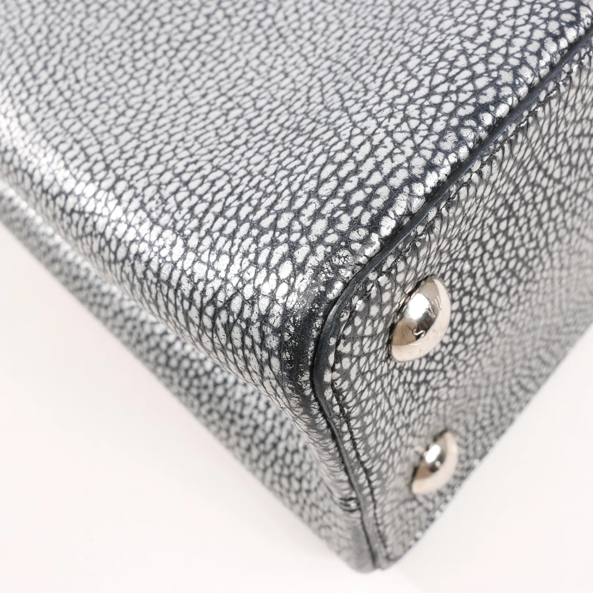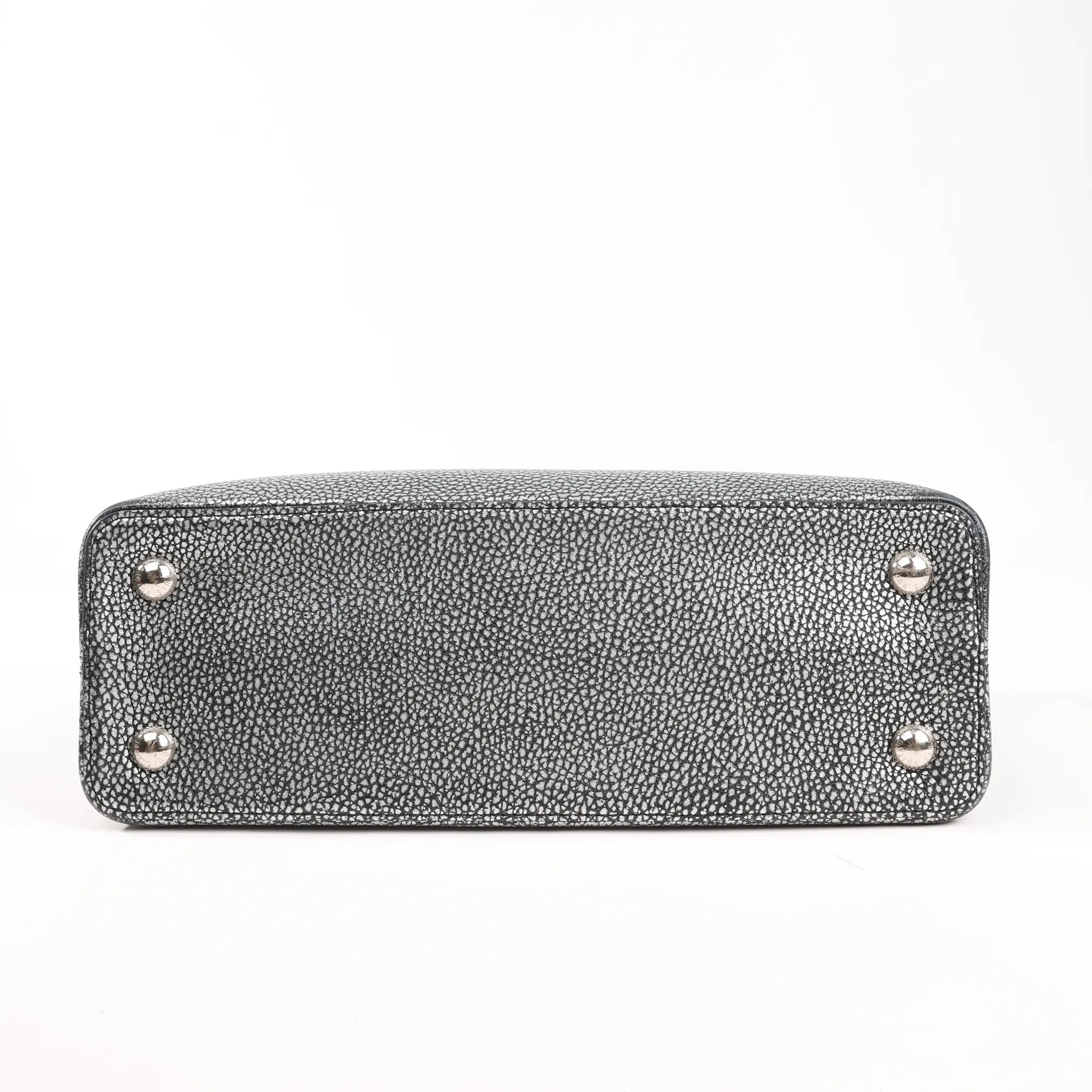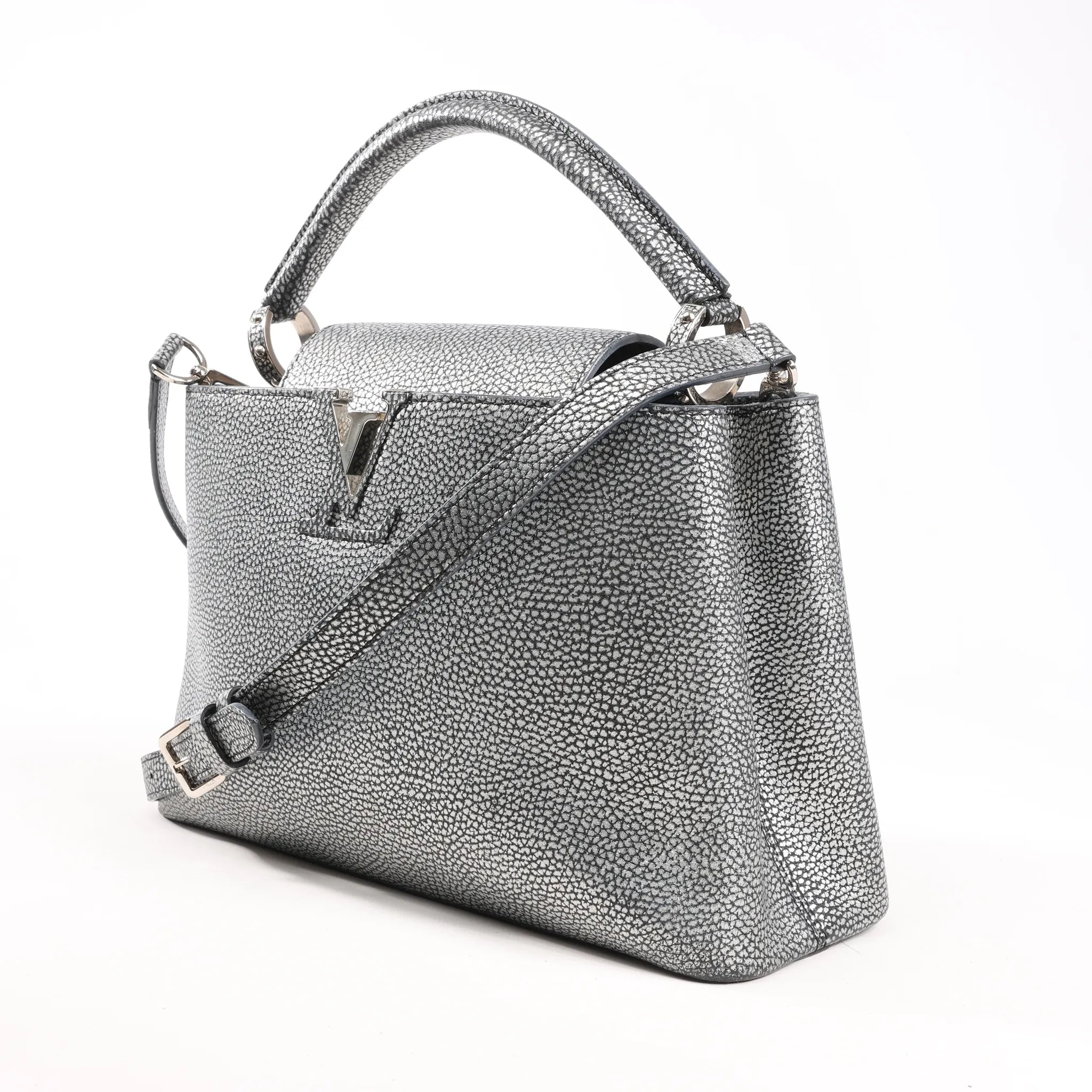 The Louis Vuitton Capucines PM in silver Taurillon leather radiates modern elegance with its structured silhouette, top handle, and versatile 2Way design—luxury redefined in metallic shine.