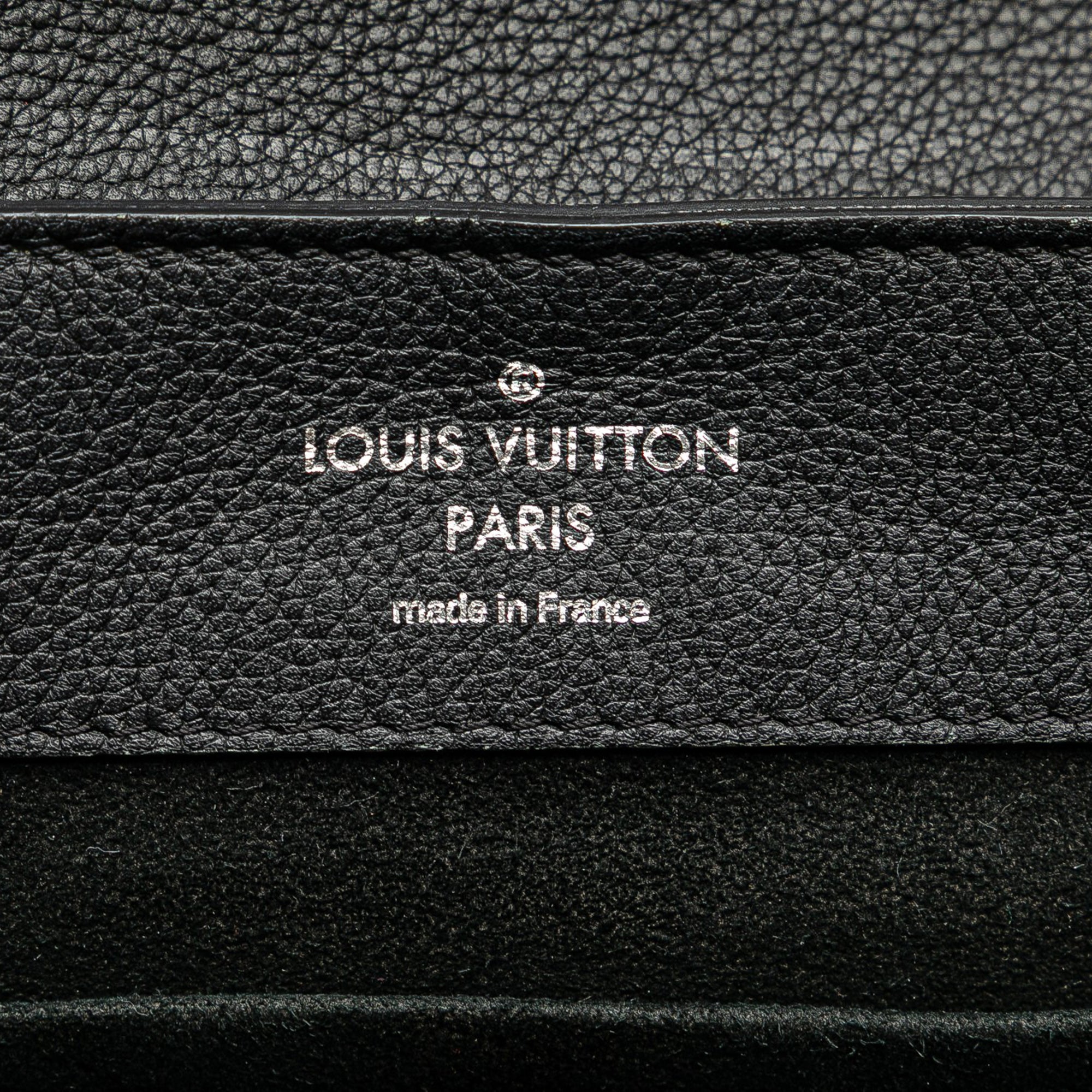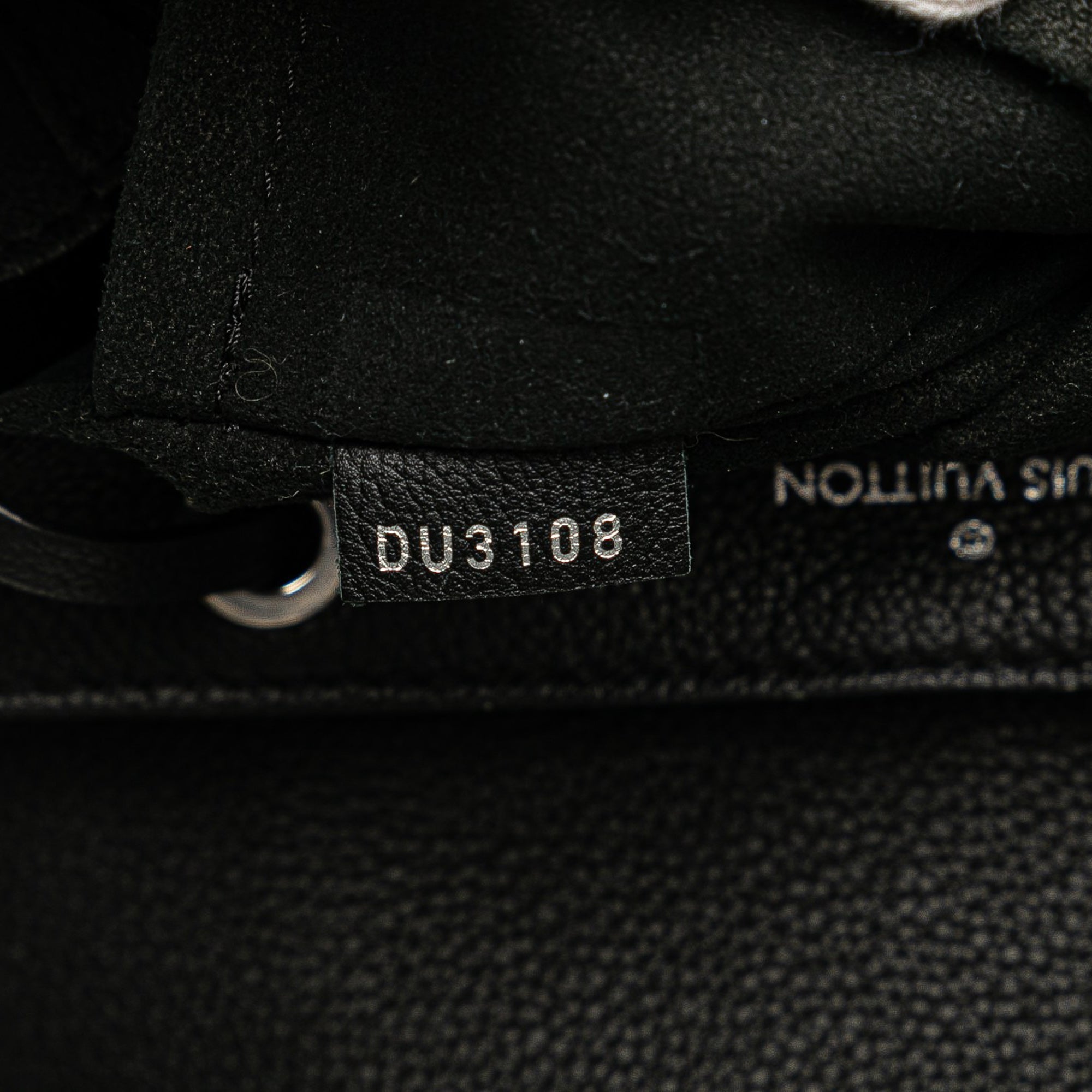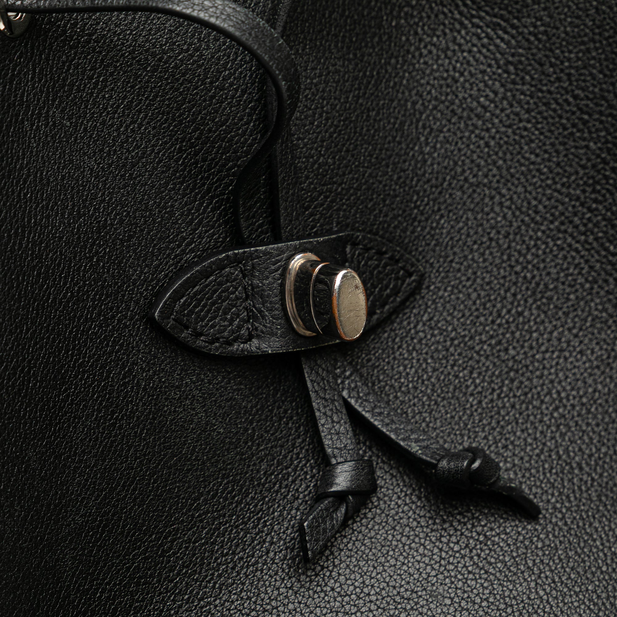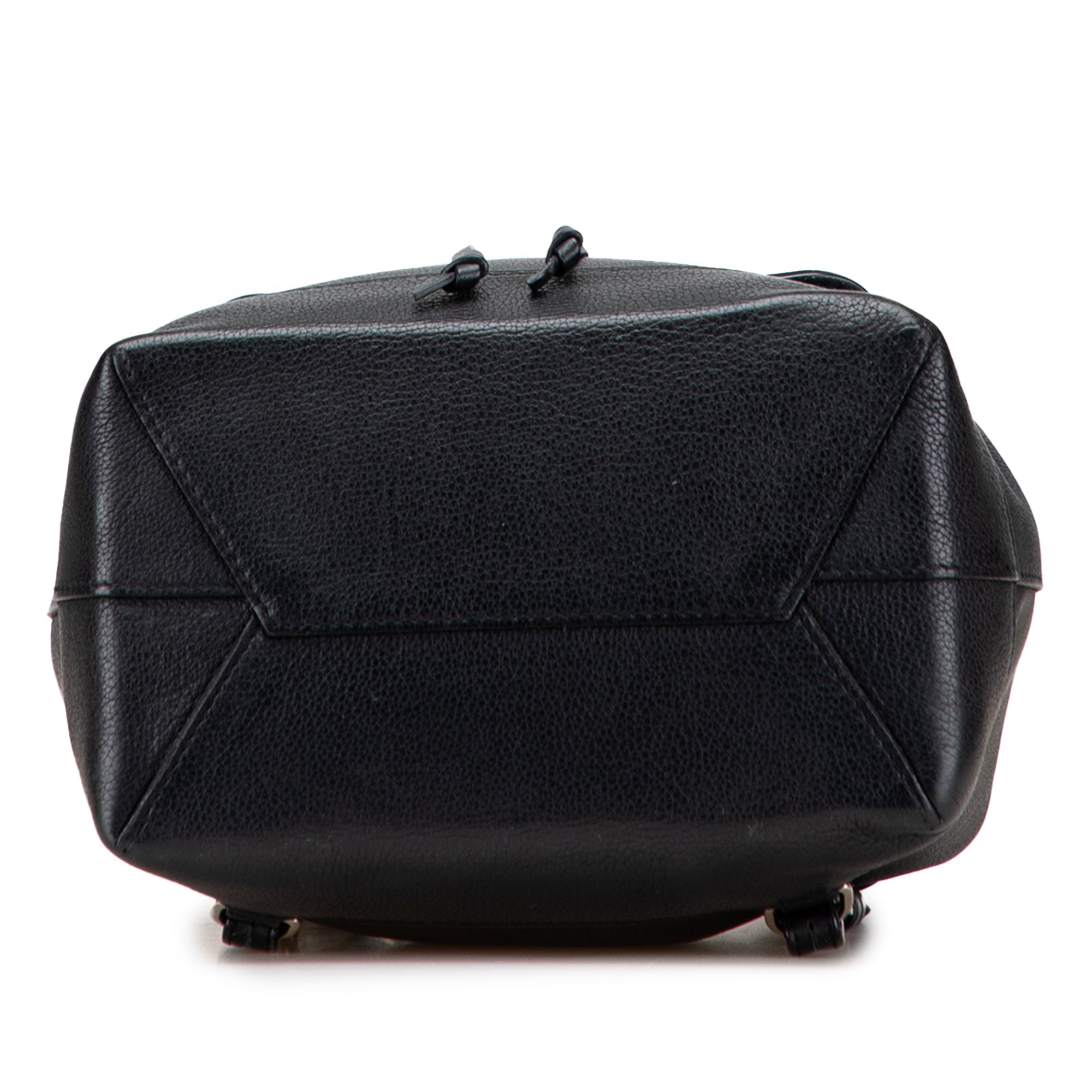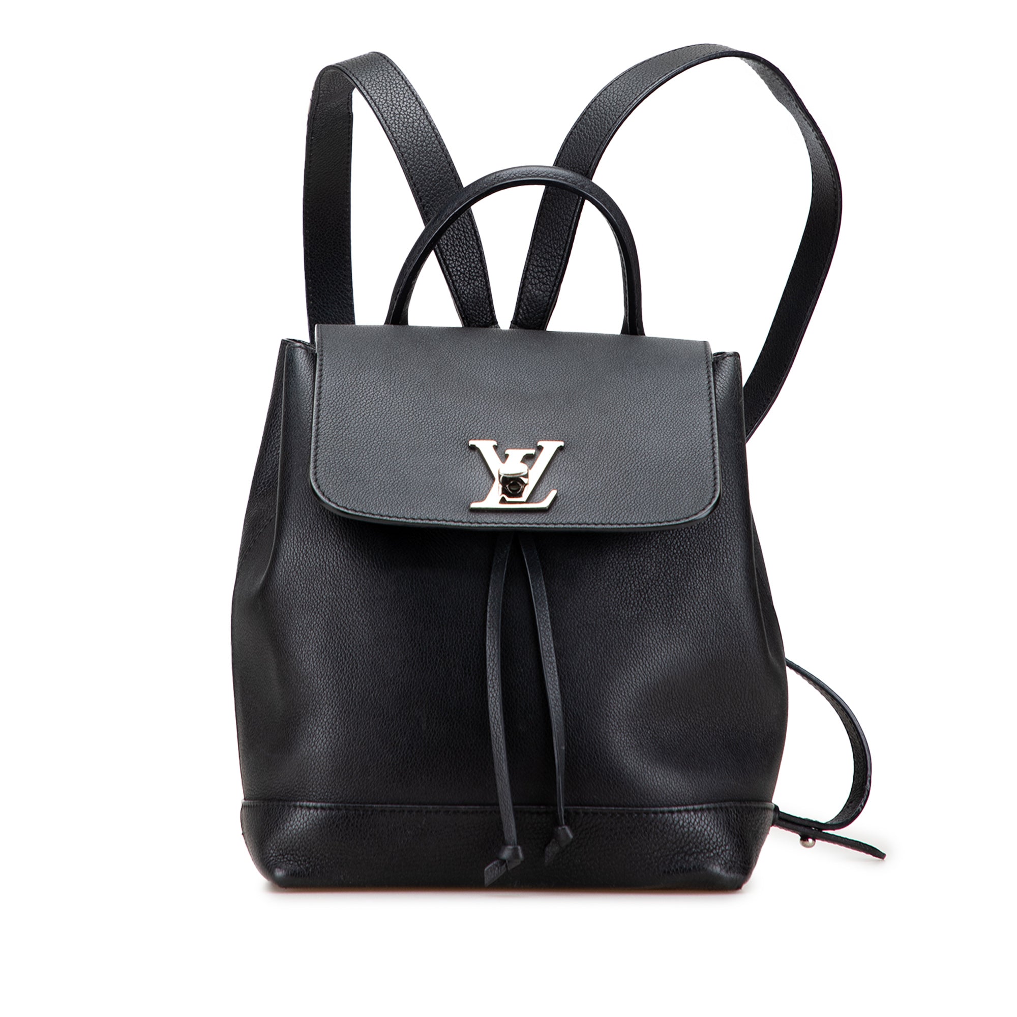 The Lockme backpack features a leather body, a rolled top handle, adjustable flat back straps, a top flap with a silver-tone turn lock closure, a drawstring closure, and an interior slip pocket. Retail Price: 2897.00