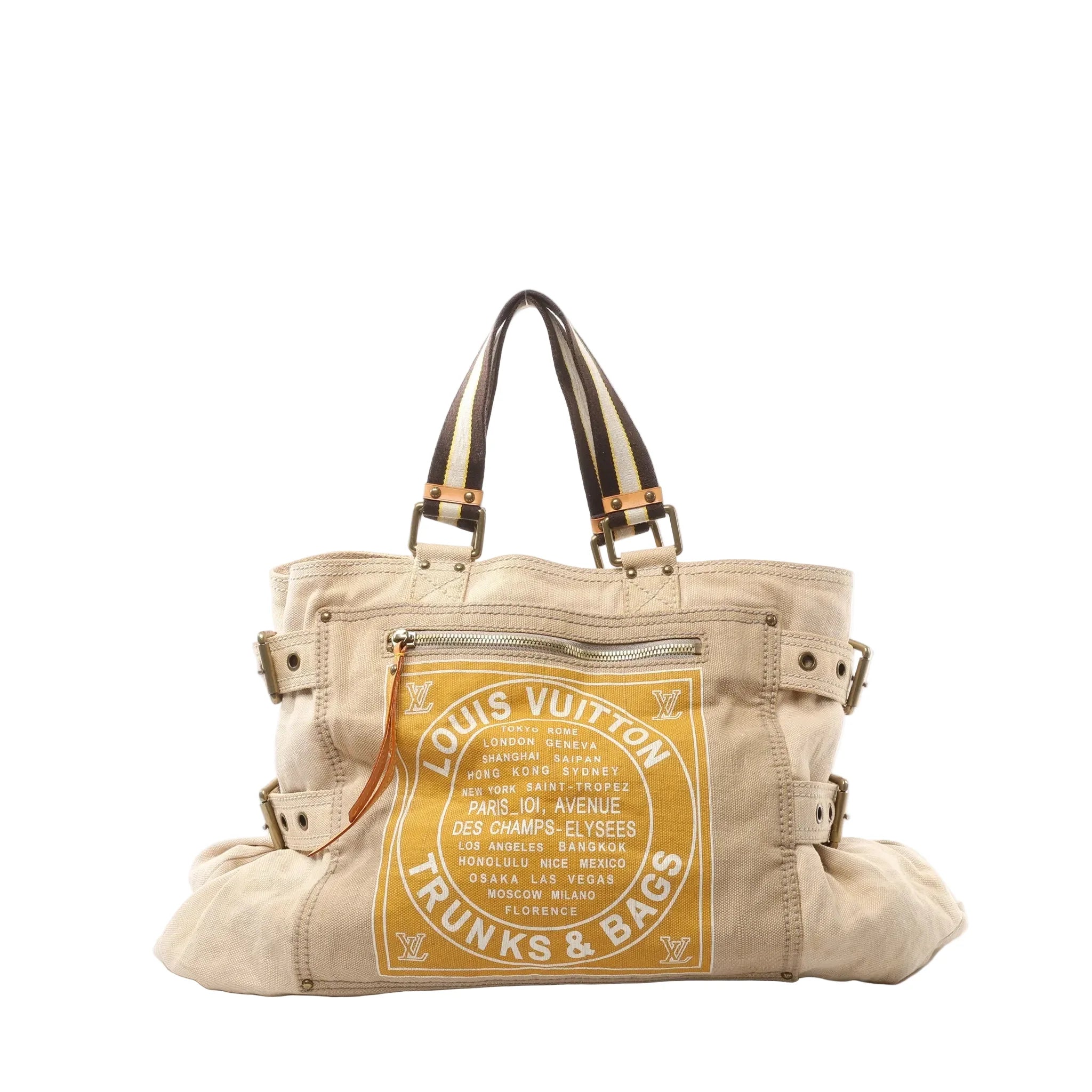 Louis Vuitton Toile Globe GM Limited Edition cloth handbag in beige (M95110)—a rare, travel-inspired canvas tote with bold “Trunks & Bags” graphic, roomy carryall shape, and statement striped top handles.