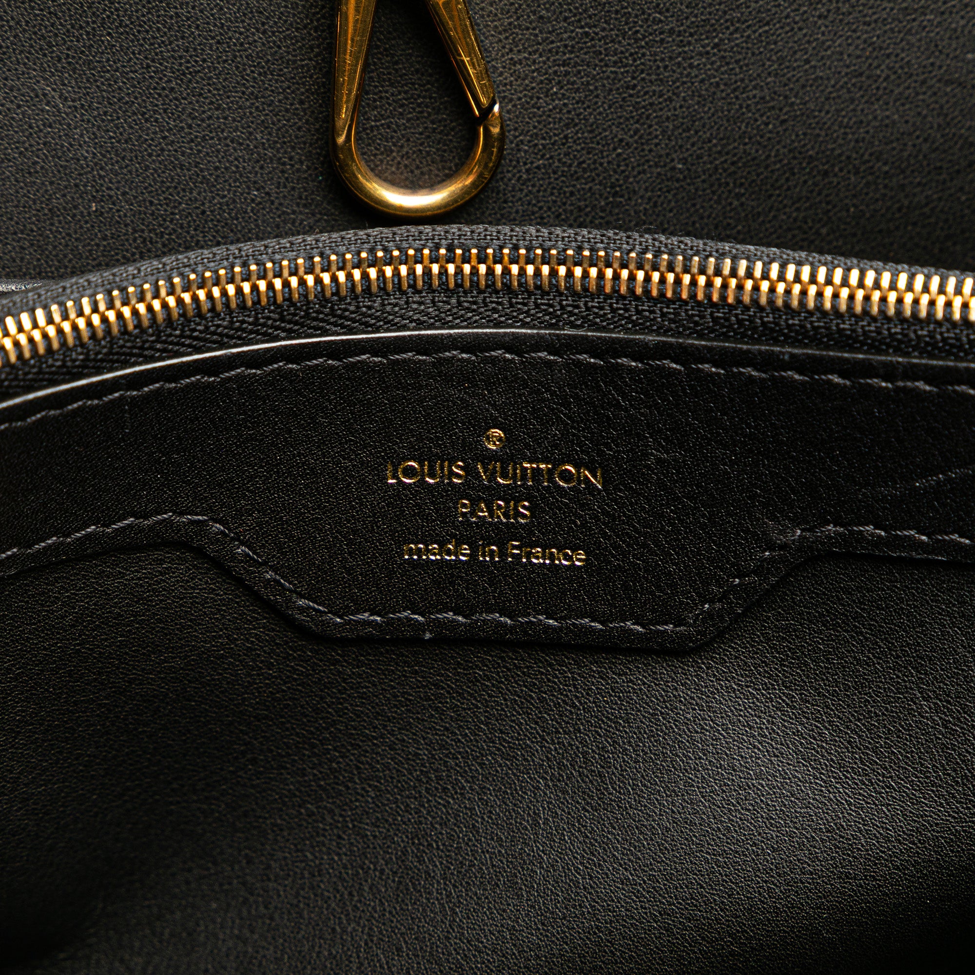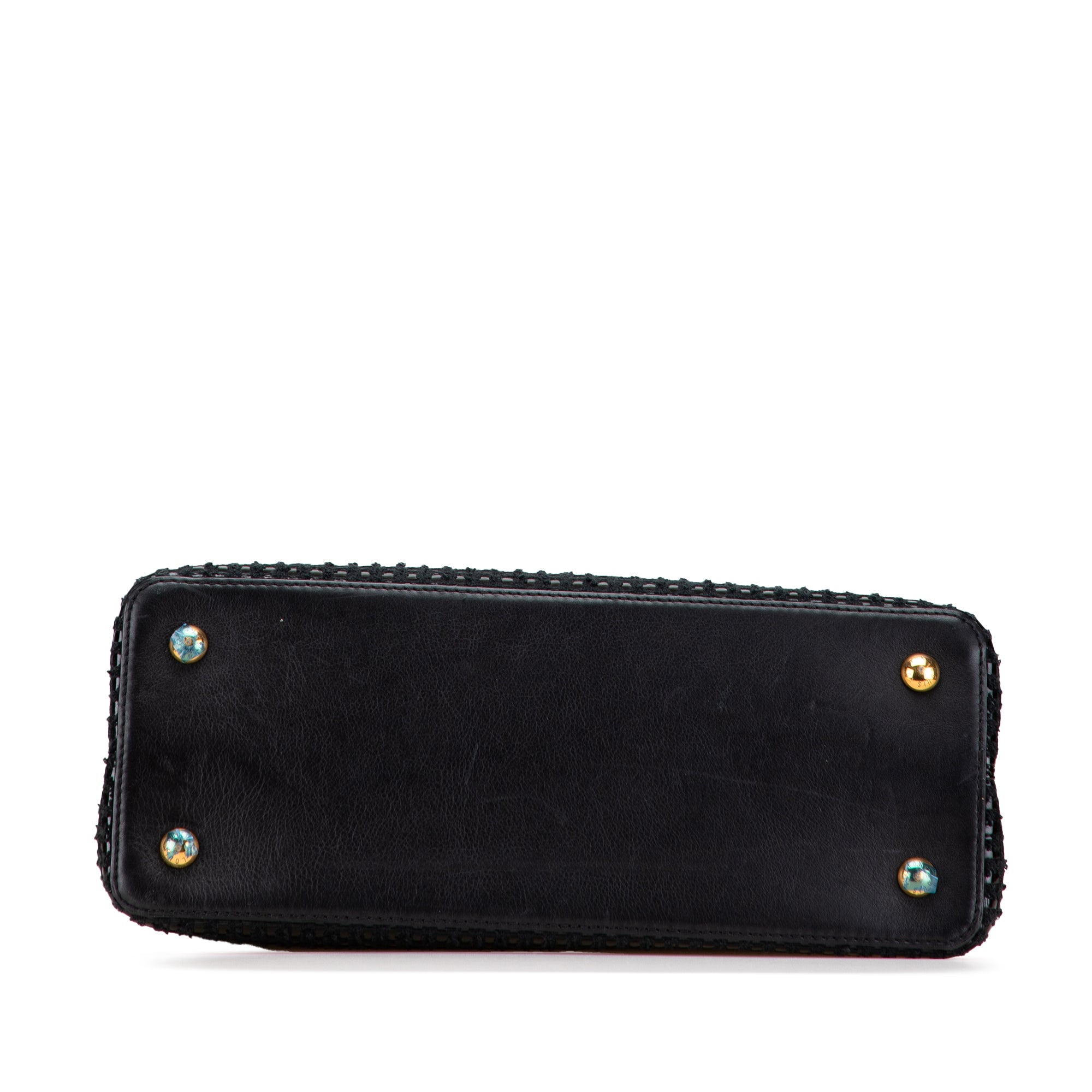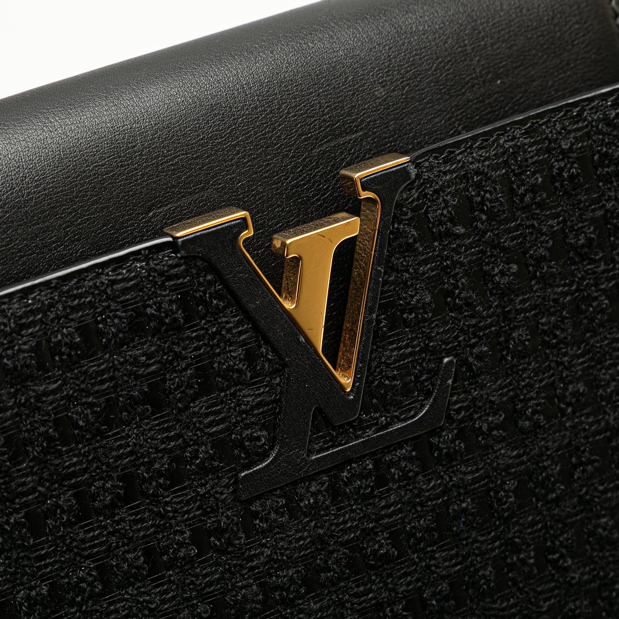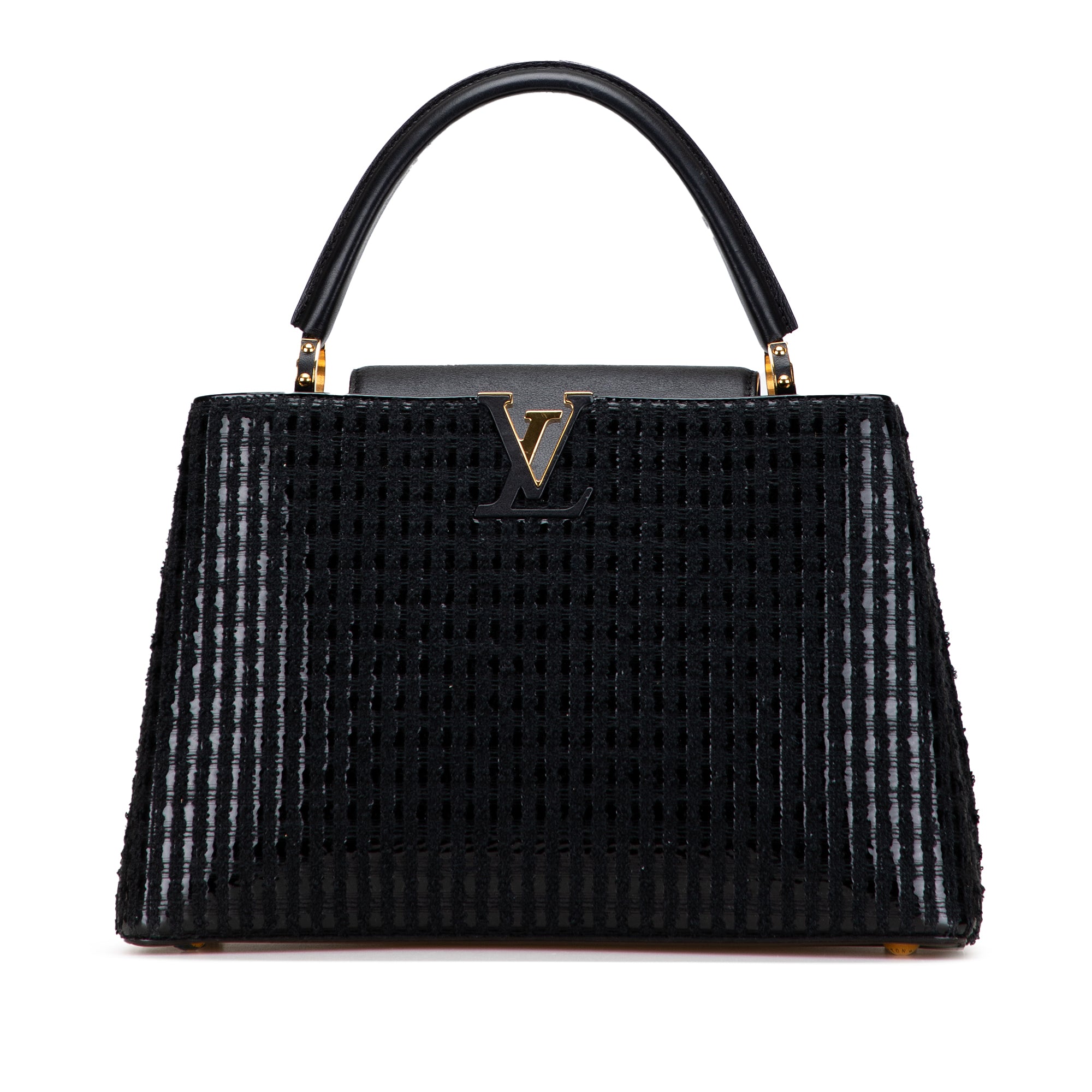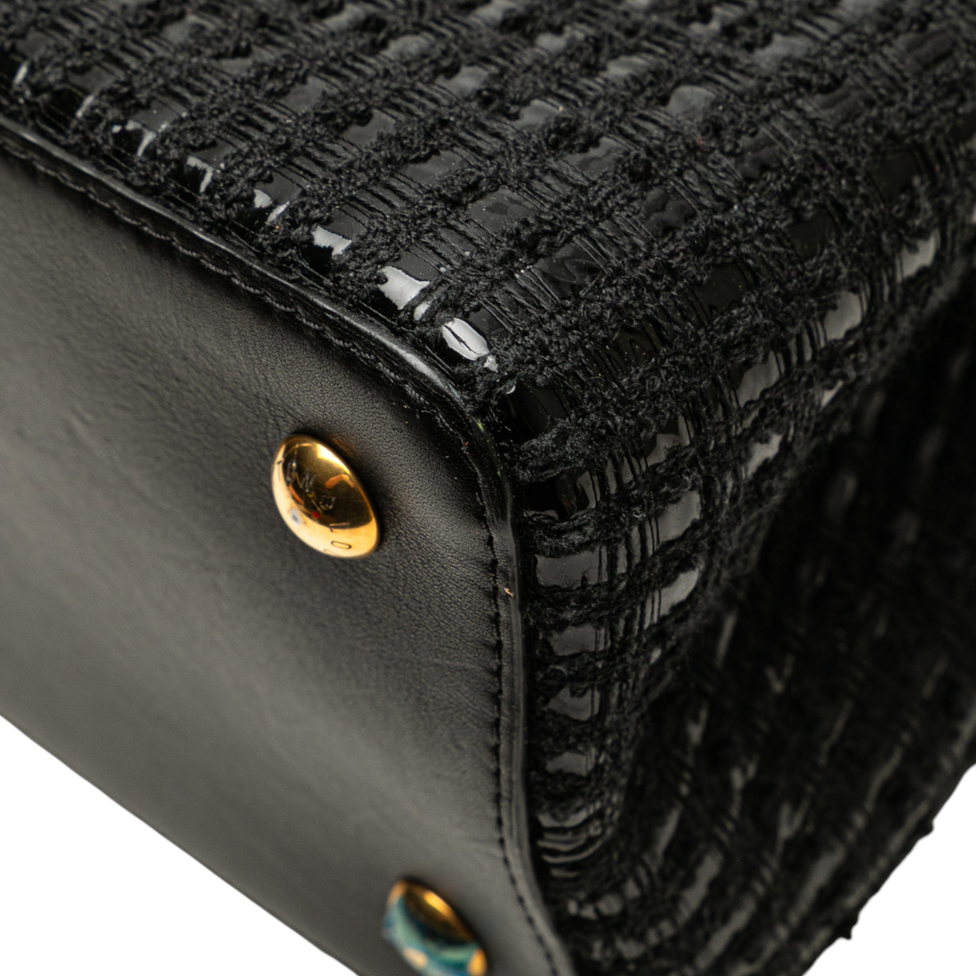 The Capucines MM features a tweed body, a flat leather top handle, a top flap with tuck-in closure, and interior zip and slip pockets. Retail Price: 5000.00