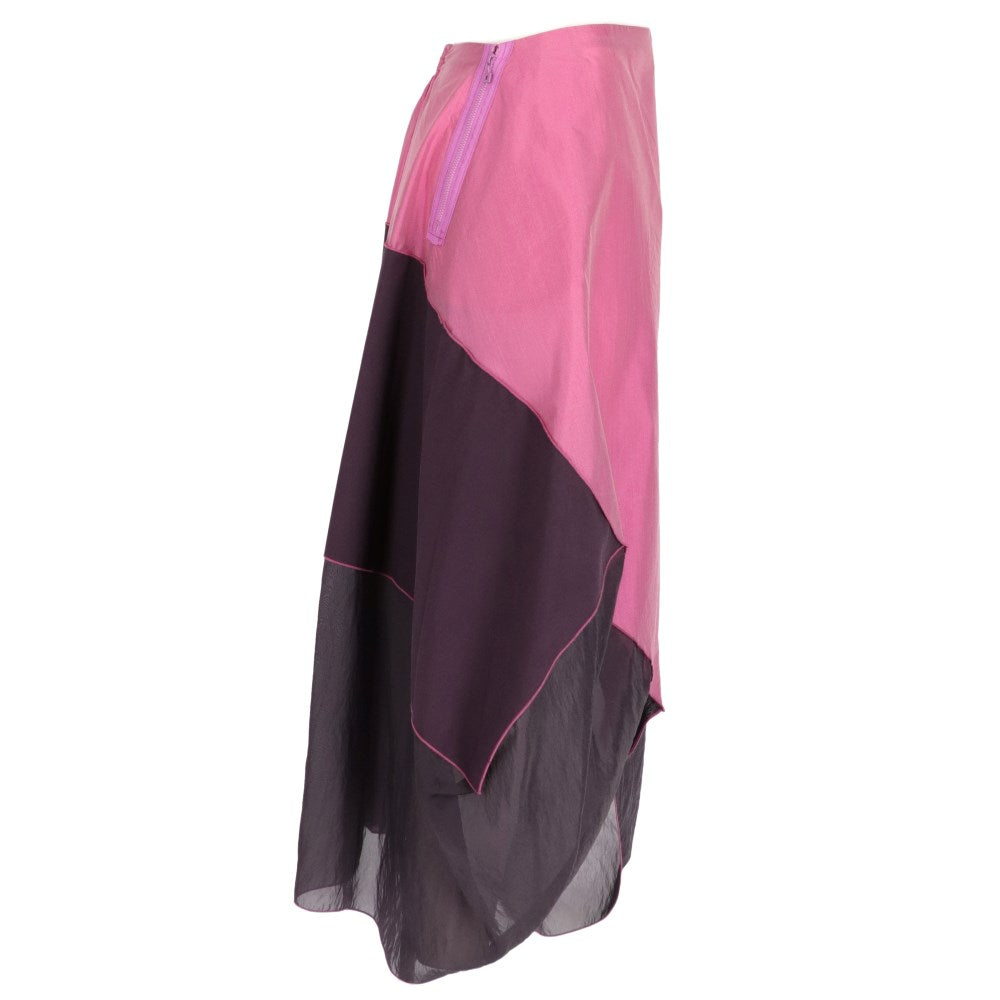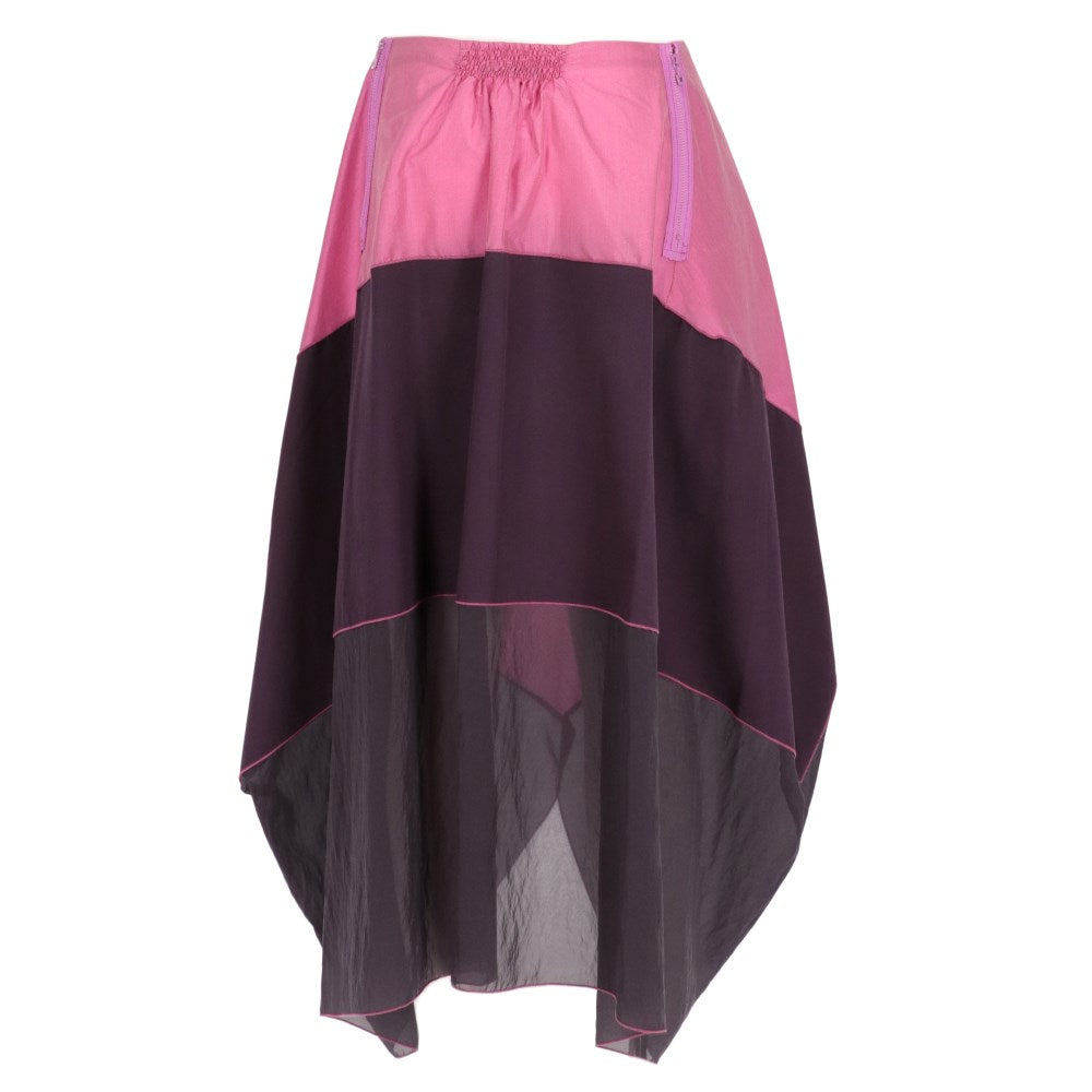 Marithè Francois Girbaud, 2000s lilac skirt. Balloon model, back ruffles, symmetrical back zips, semi-transparent bottom with asymmetrical hem.