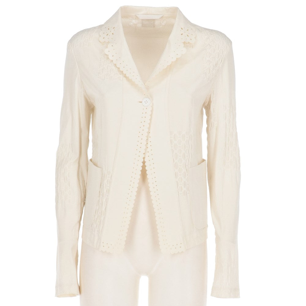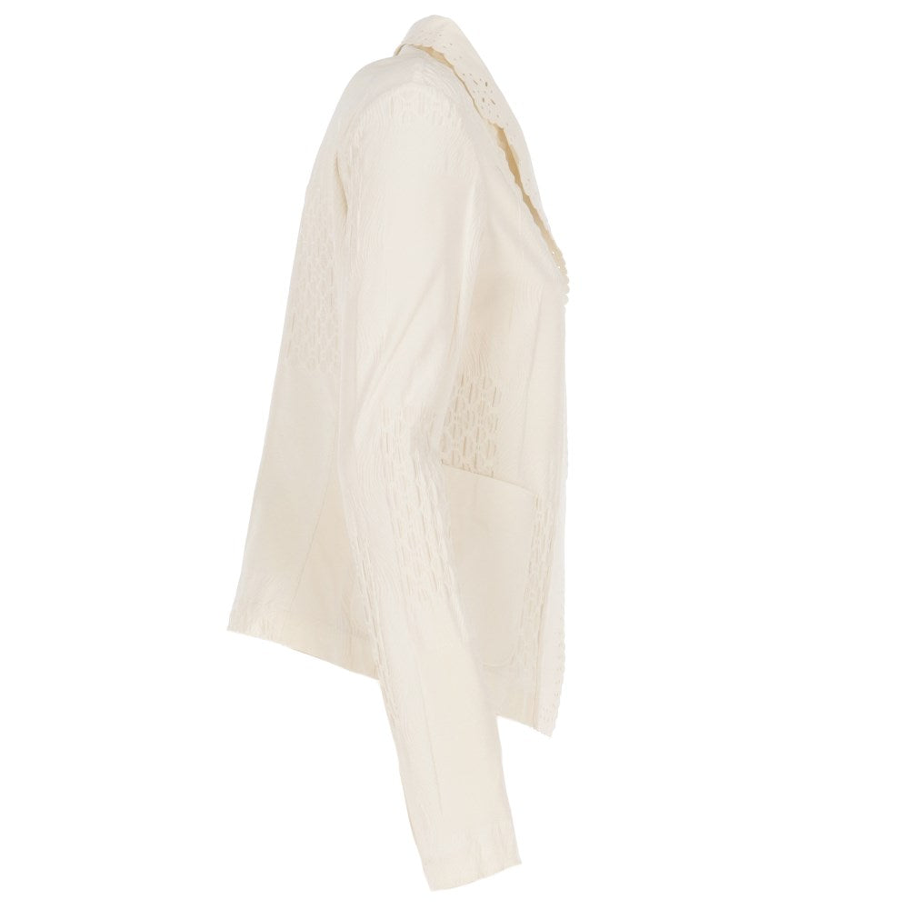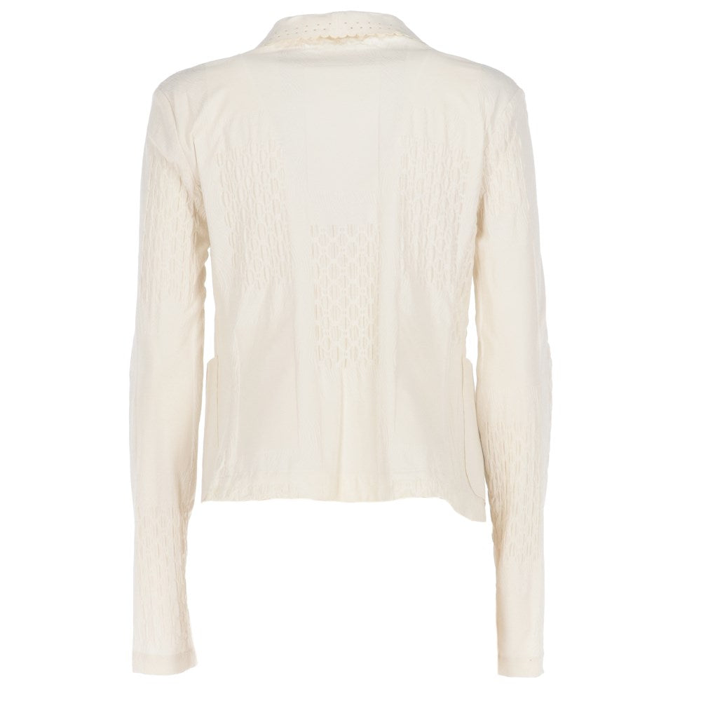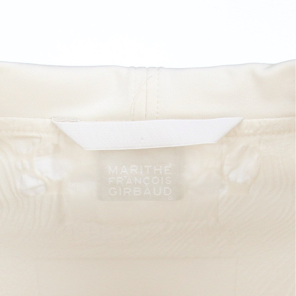 Marithé + François Girbaud white nylon 2000s jacket. Ruffled sleeves, openwork neckline. Button closure on the front, patch pockets.