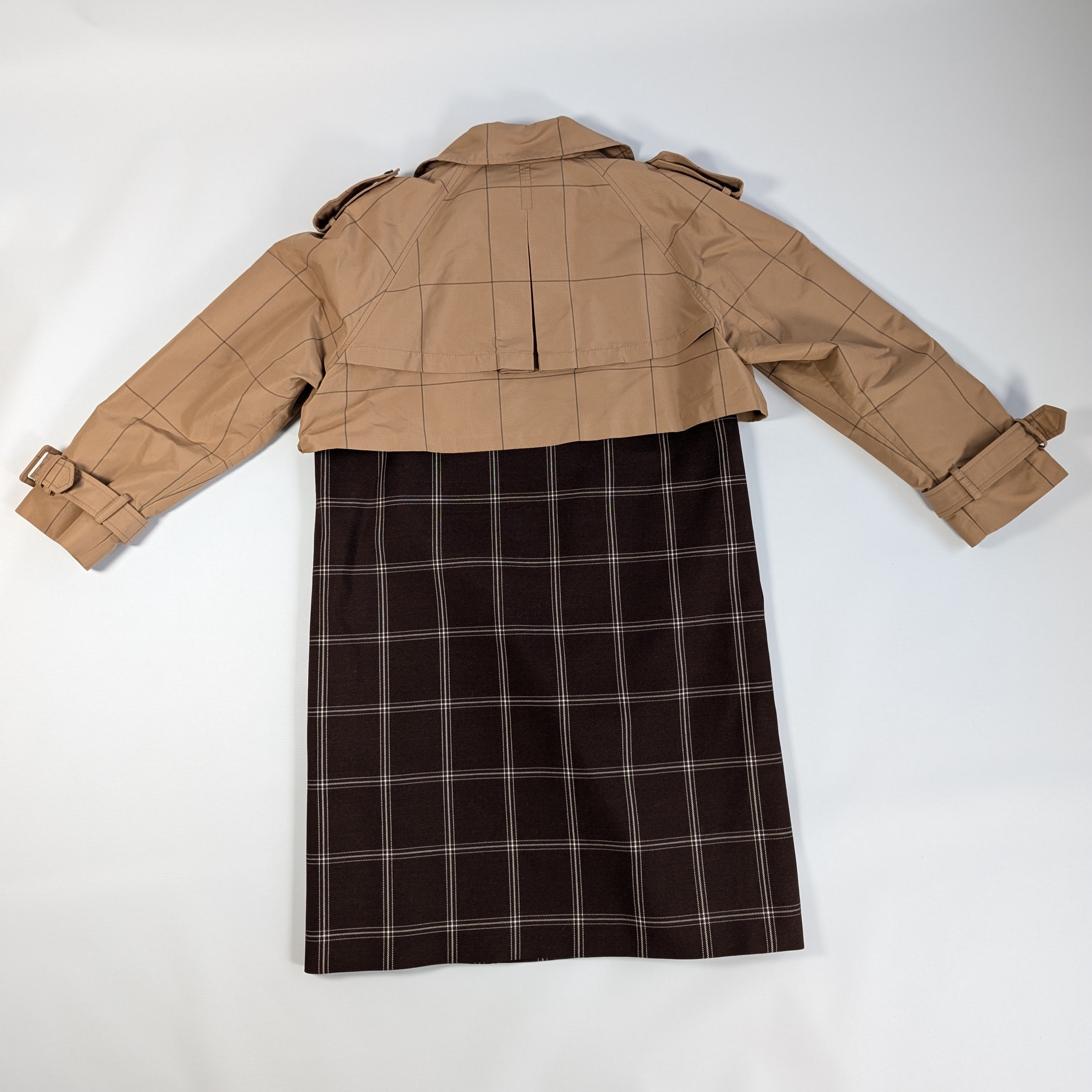 This Marni trench coat combines a beige checkered top with a contrasting dark checkered bottom. Featuring double-breasted buttons and adjustable belt cuffs, it blends classic trench styling with a modern twist. Made in Italy, size 38.