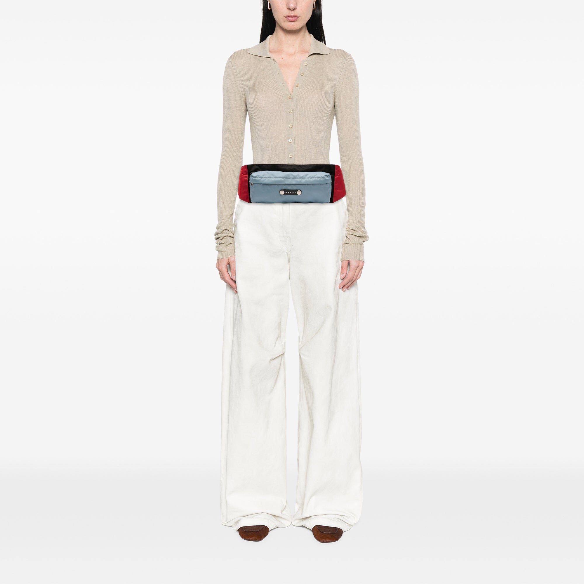 This belt bag features a nylon body, an adjustable flat canvas waist strap with buckle closure, front zip main compartment, and an exterior front zip pocket. Retail Price: 699.00