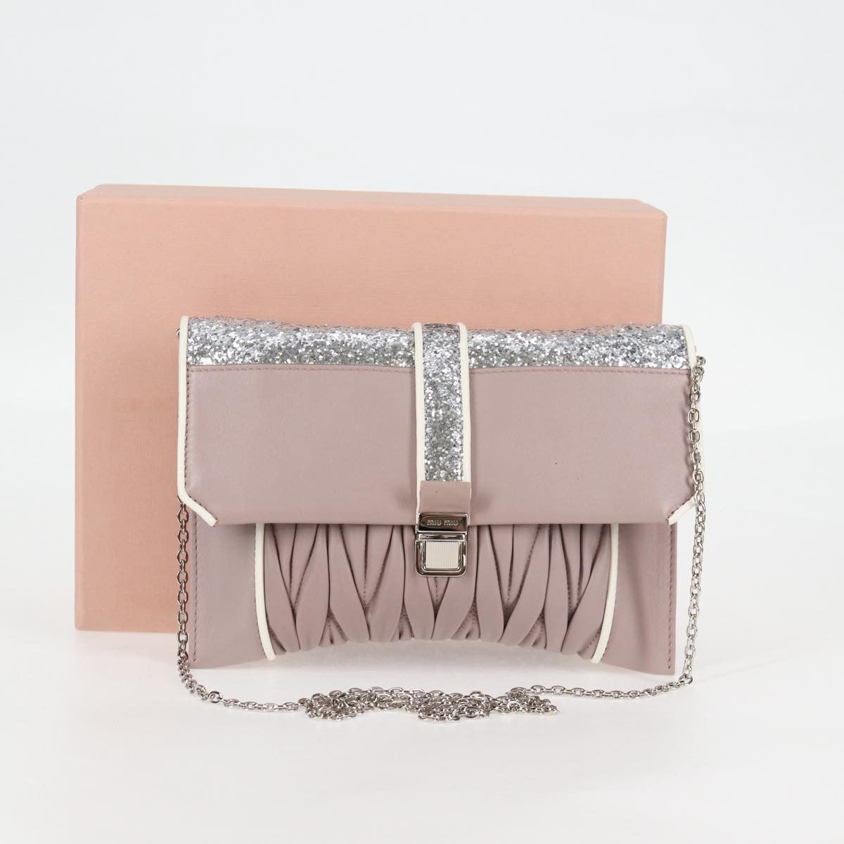 Brand : Miu Miu Model : Madras Chain Clutch Style : Matelasse Leather with Glitter Serial number : 53 Inclusions : Box