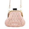 Miu Miu Belle Mini clutch in powder pink matelassé nappa leather, detailed with a gold hinge frame, kiss-lock clasp, and chain strap for crossbody wear.