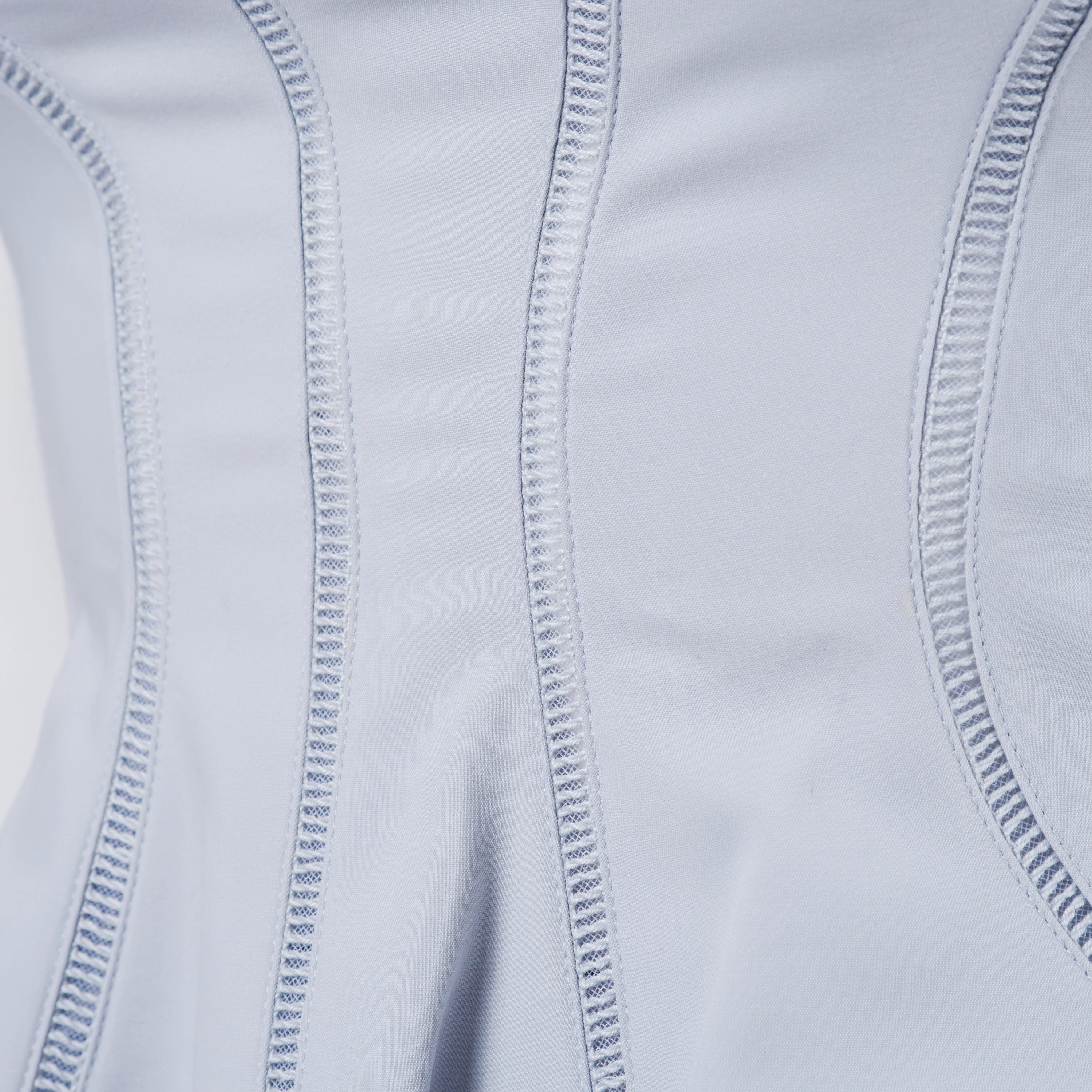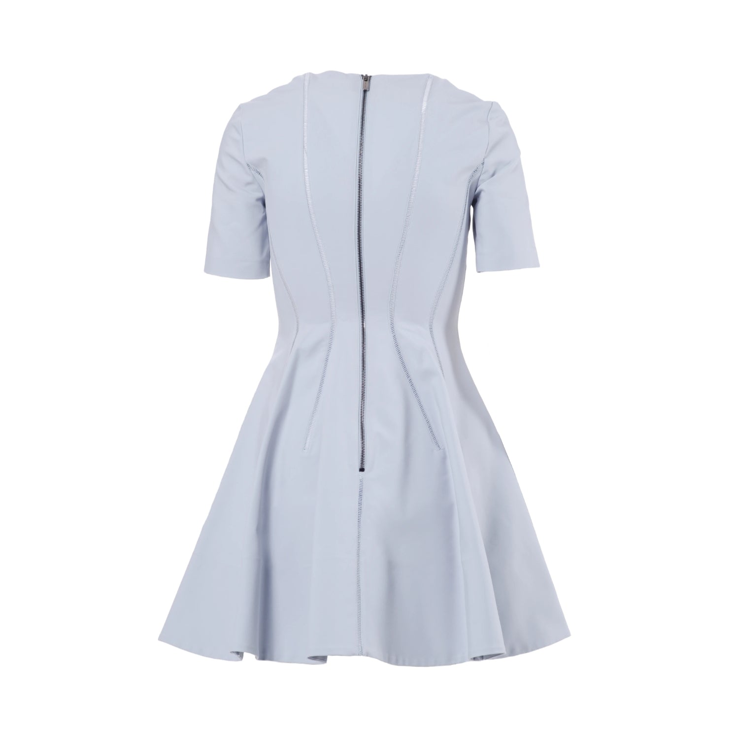 Structured Miu Miu dress crafted in a soft light blue hue, defined by a clean architectural silhouette and refined tailoring. The design features a square neckline, short sleeves and sculpting vertical seams that enhance the waist and flow into a subtly flared skirt.