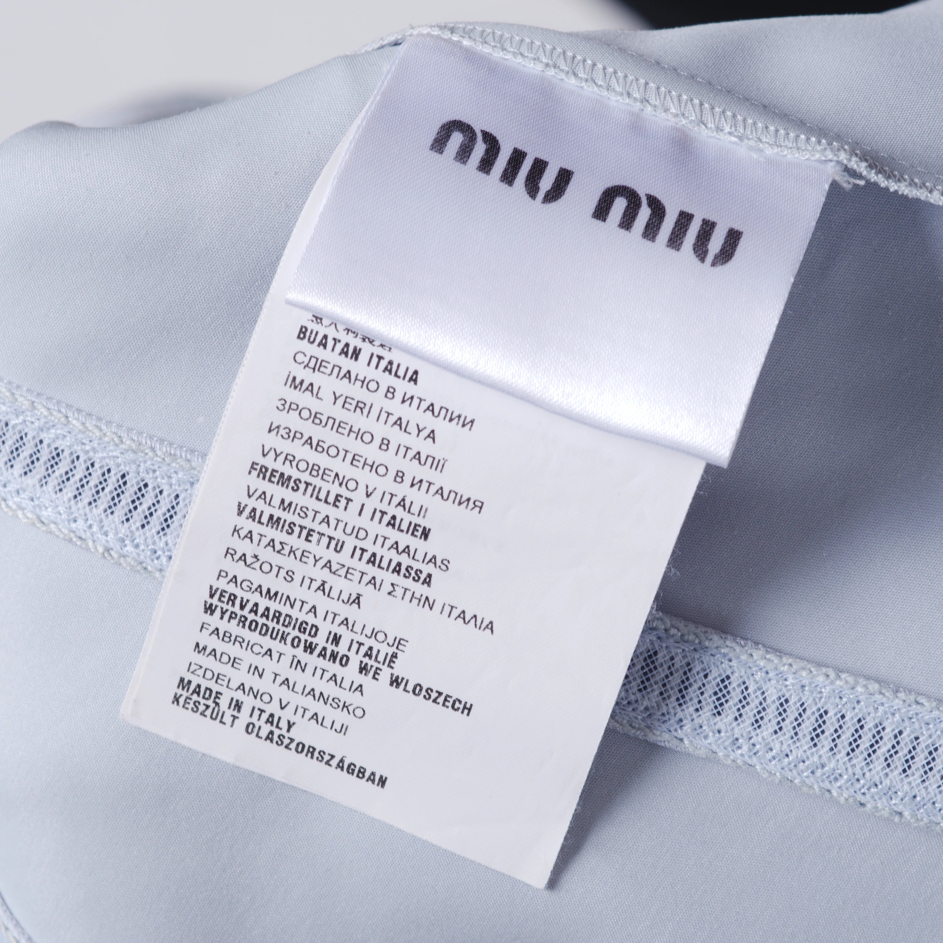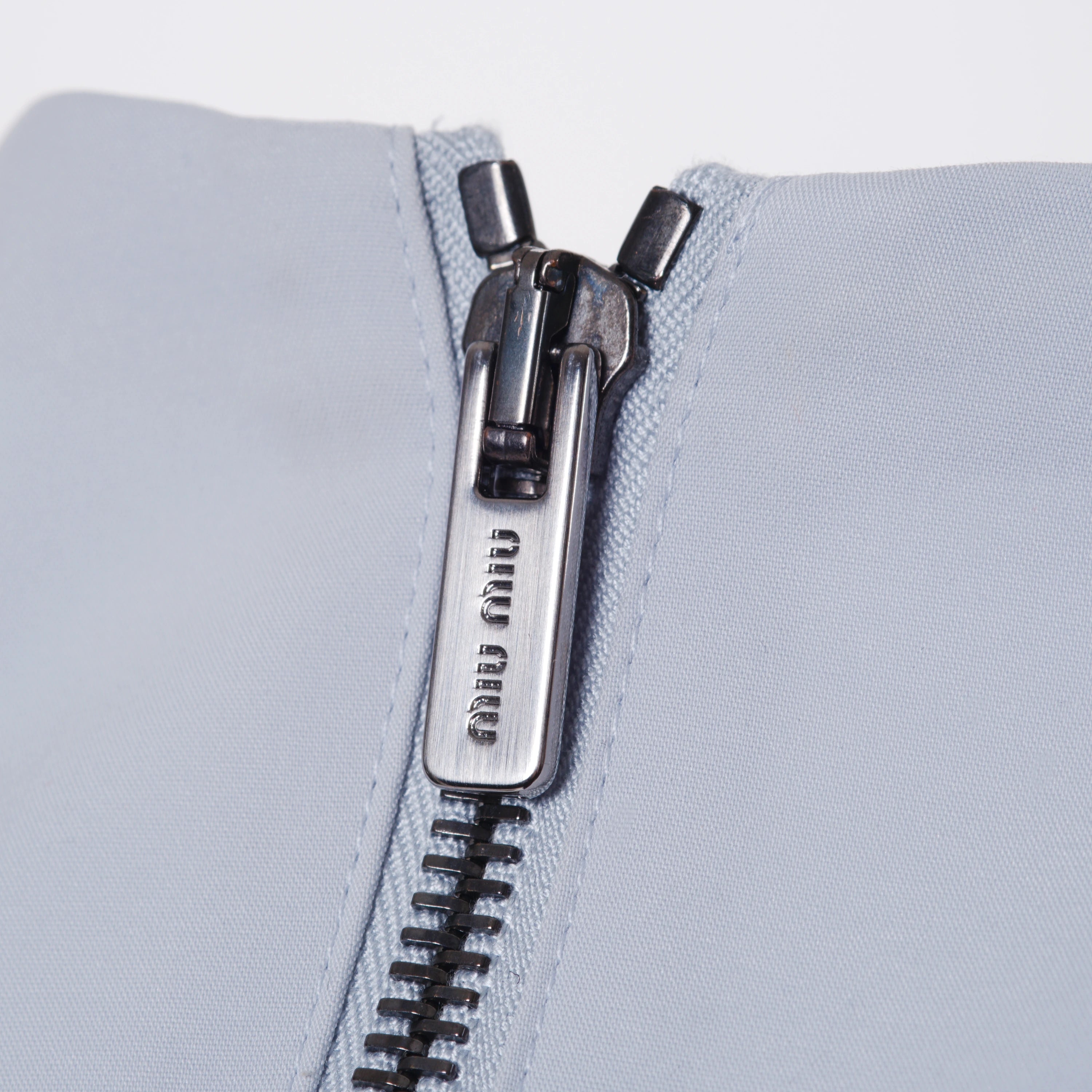 Finished with a signature Miu Miu metal zip closure at the back, the visible stitching adds a modern, couture-inspired touch while maintaining a timeless elegance. A versatile piece that transitions effortlessly from daytime wear to more polished occasions, embodying the sophisticated yet playful spirit of the maison.