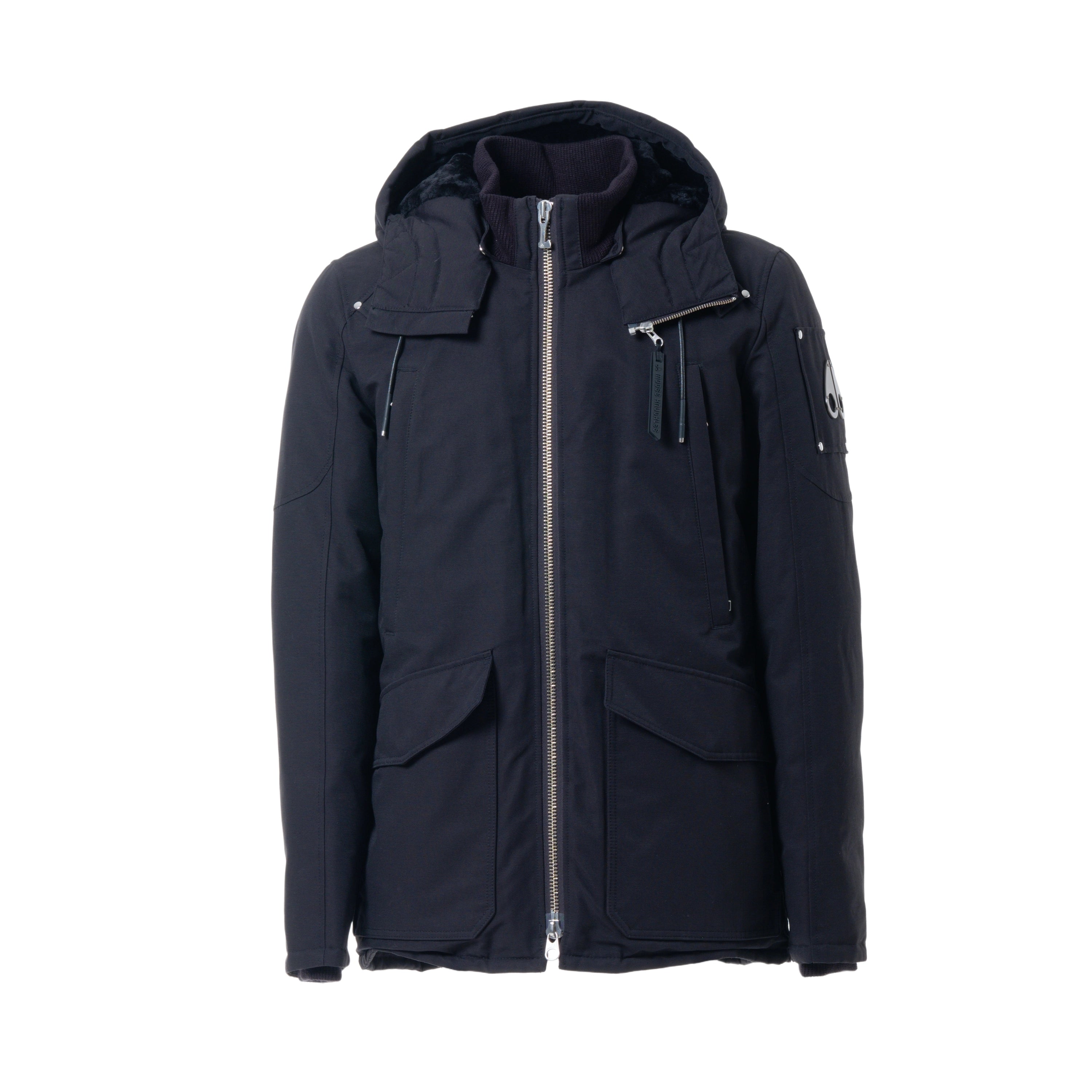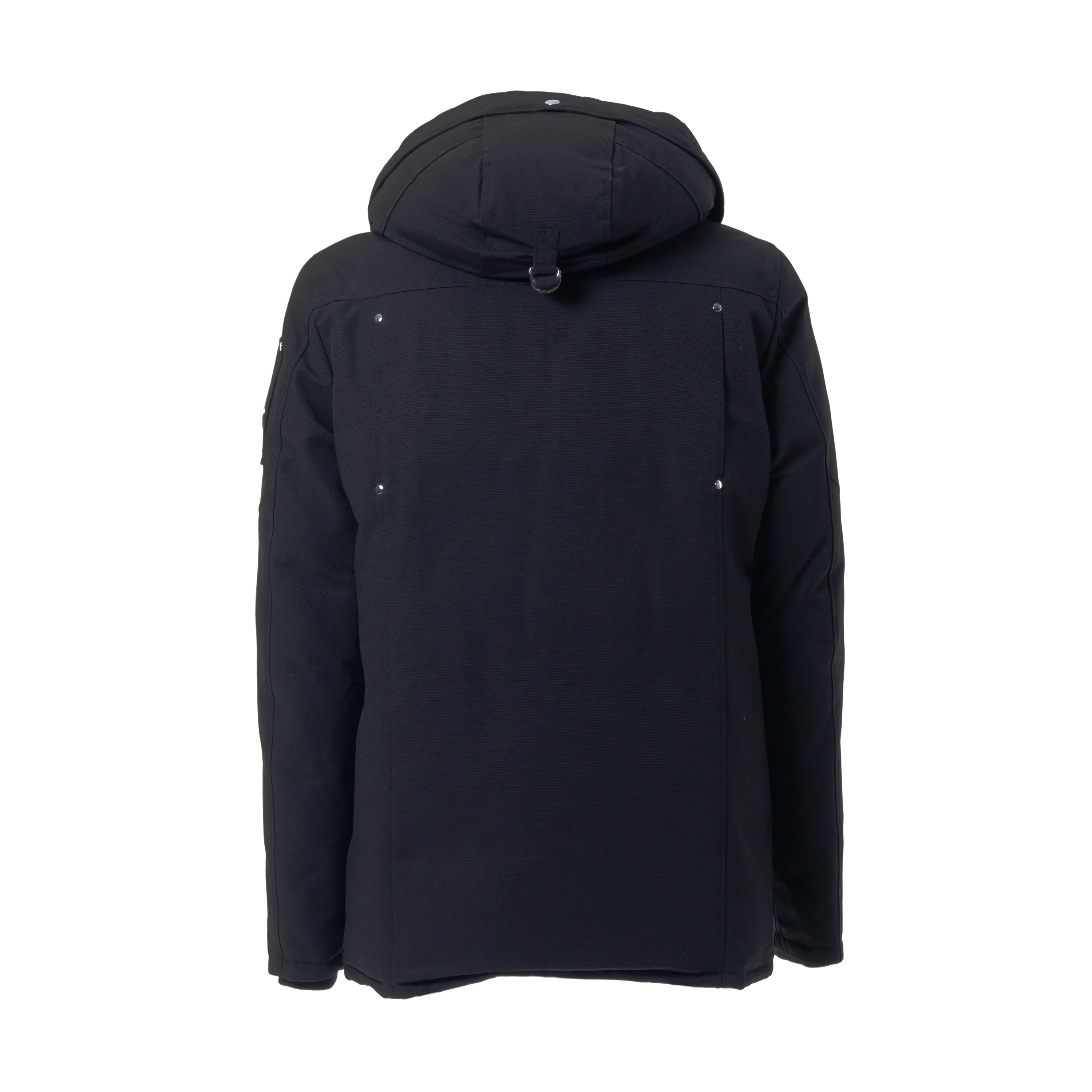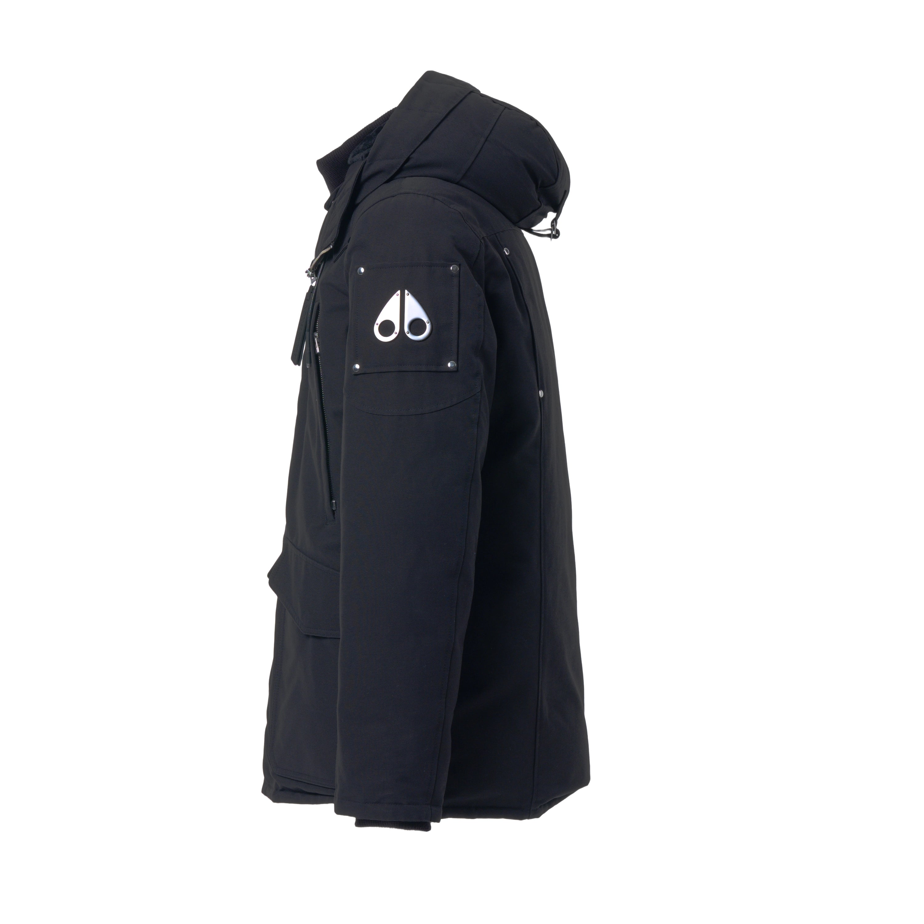 A classic black down parka by Moose Knuckles, designed for warmth and durability. The shell is made from a cotton-nylon blend, with a full nylon lining and an 80/20 down and waterfowl feather fill for insulation. It features a double-zip front closure, multiple pockets, and the brand’s signature metal logo on the sleeve. The hood is adjustable and includes a metal ring detail.