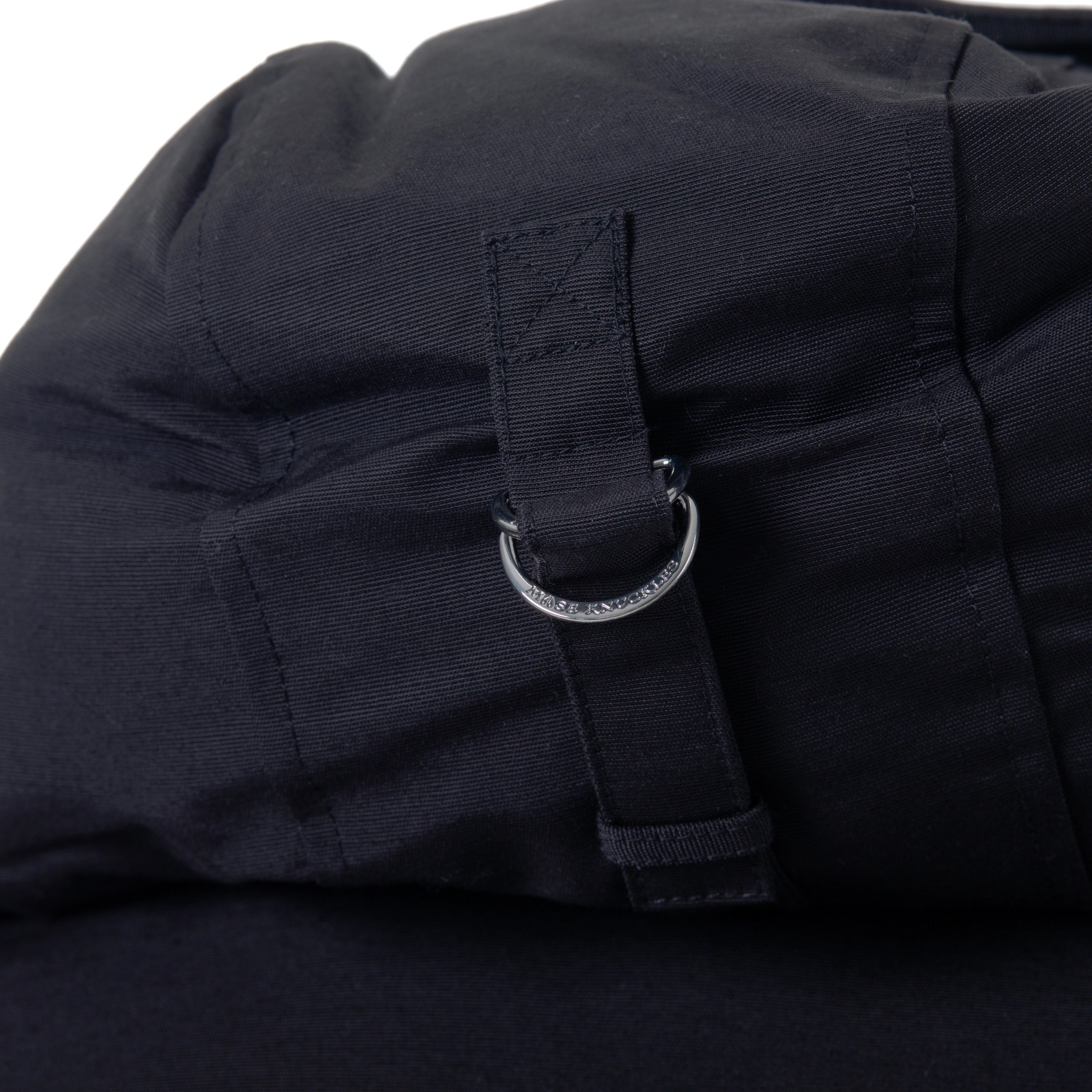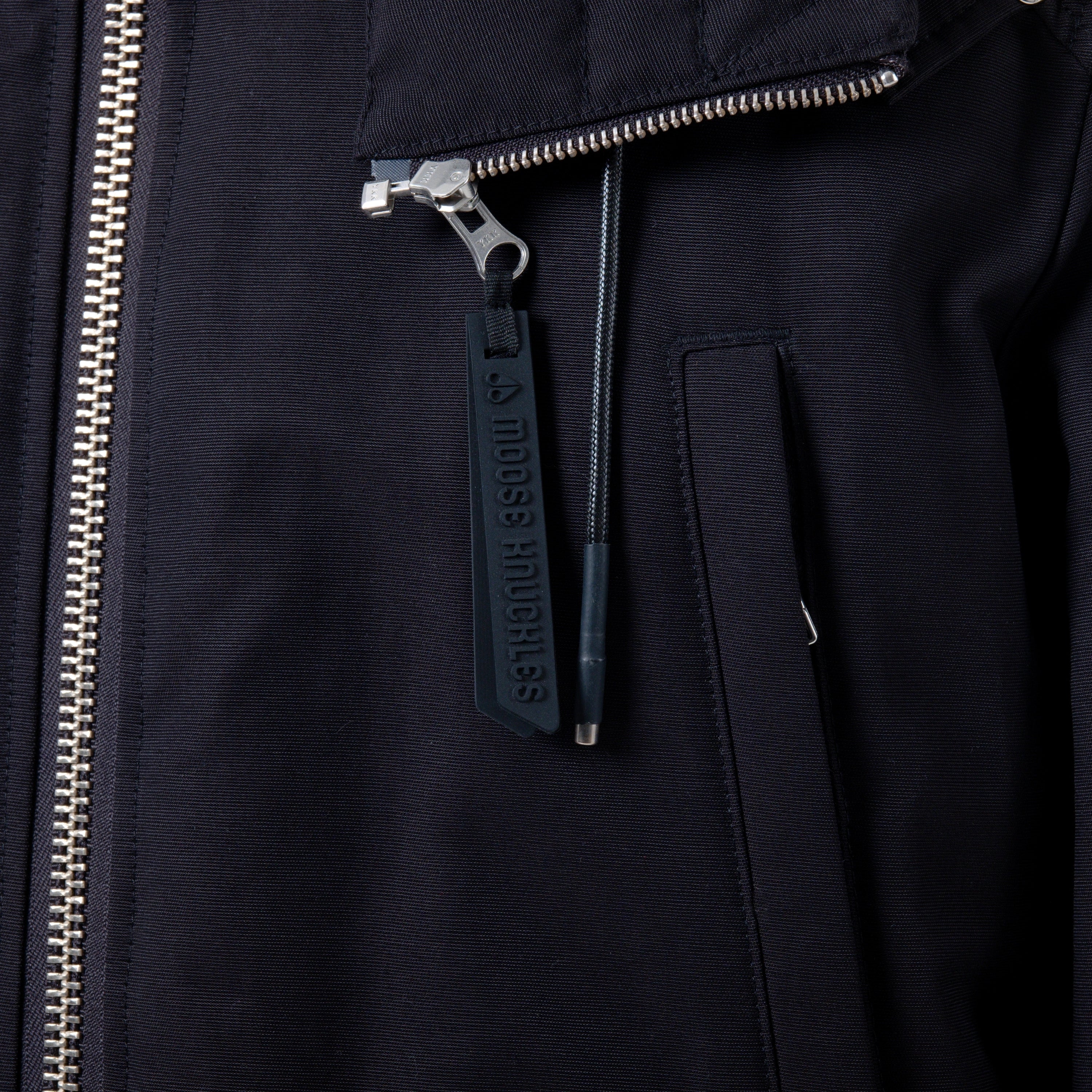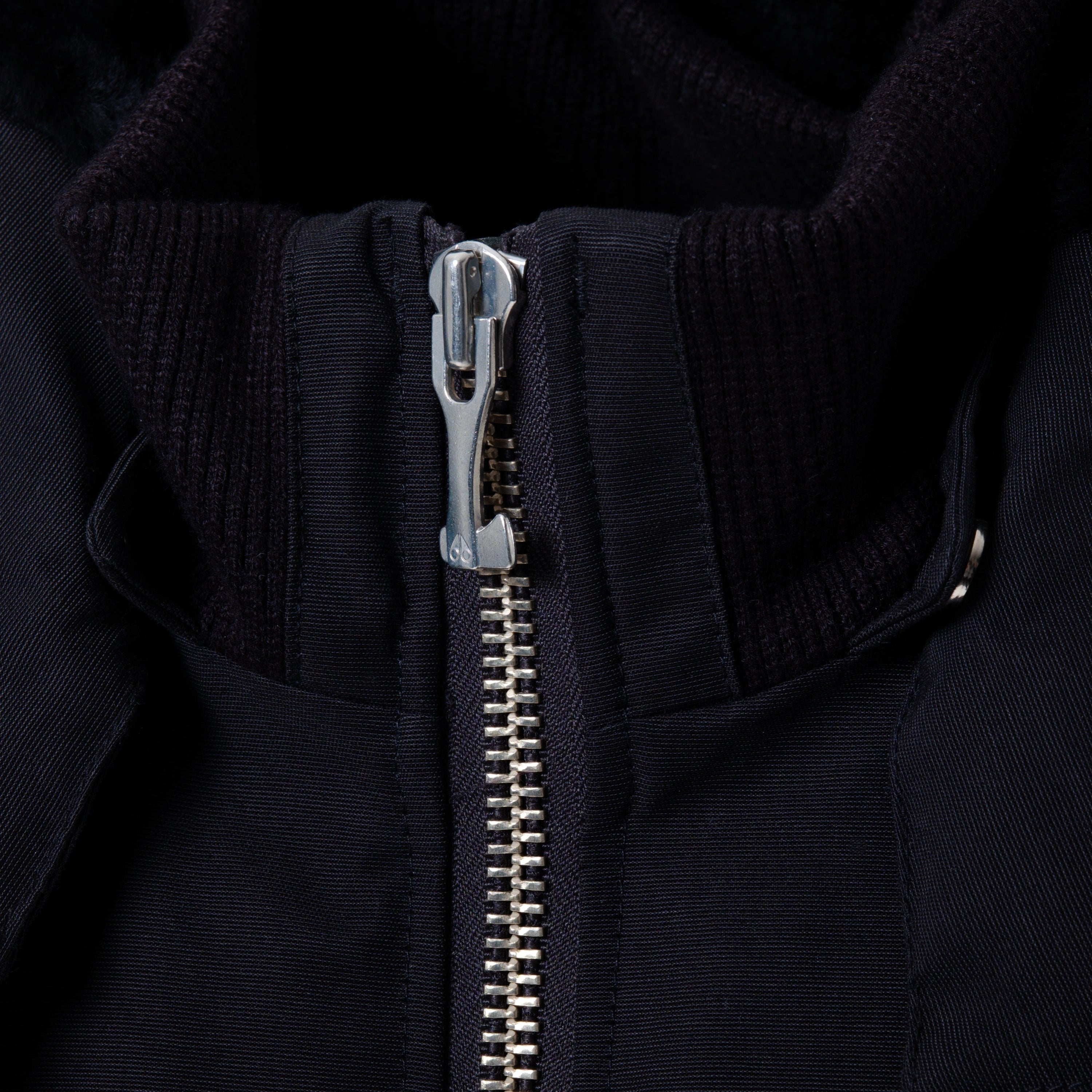 A classic black down parka by Moose Knuckles, designed for warmth and durability. The shell is made from a cotton-nylon blend, with a full nylon lining and an 80/20 down and waterfowl feather fill for insulation. It features a double-zip front closure, multiple pockets, and the brand’s signature metal logo on the sleeve. The hood is adjustable and includes a metal ring detail.