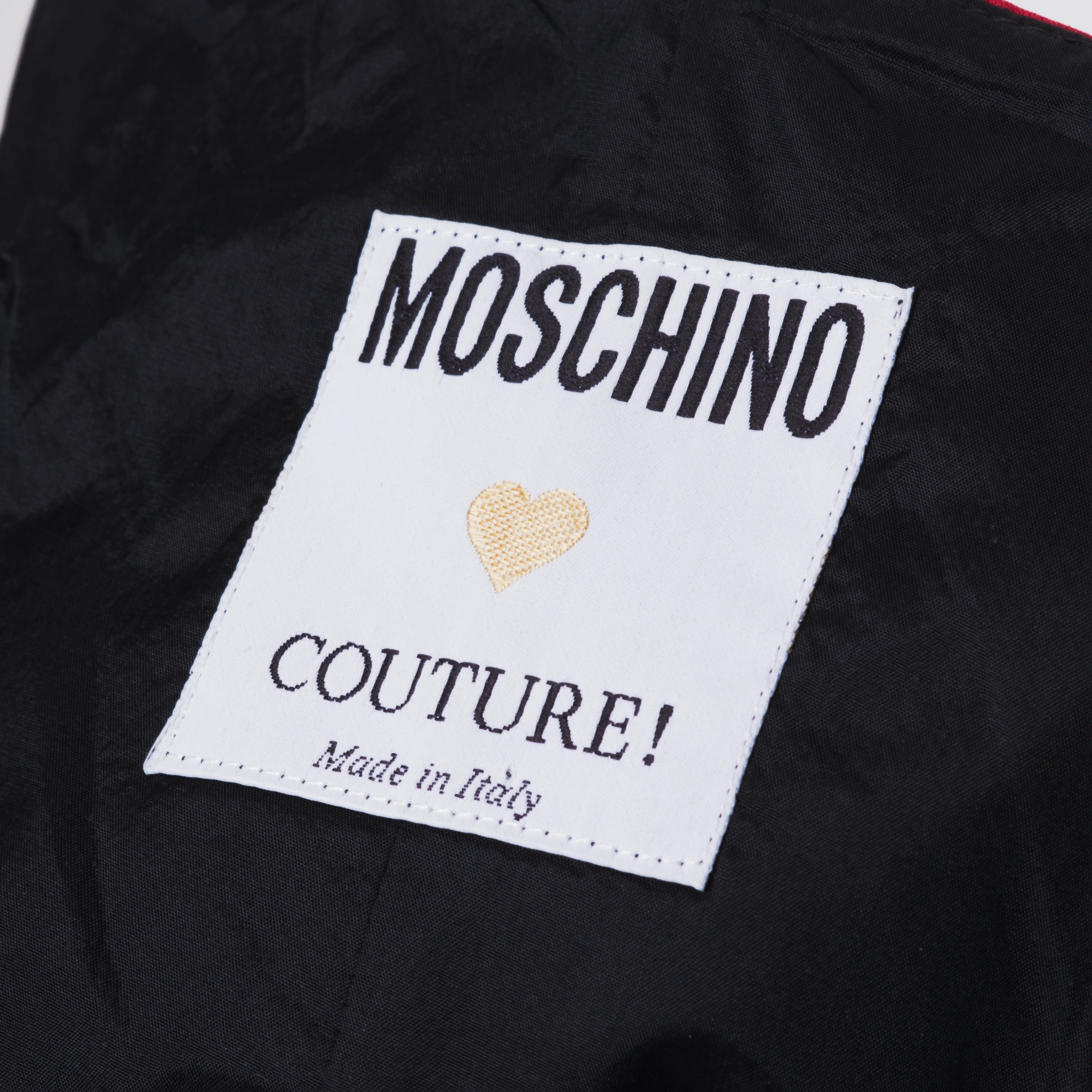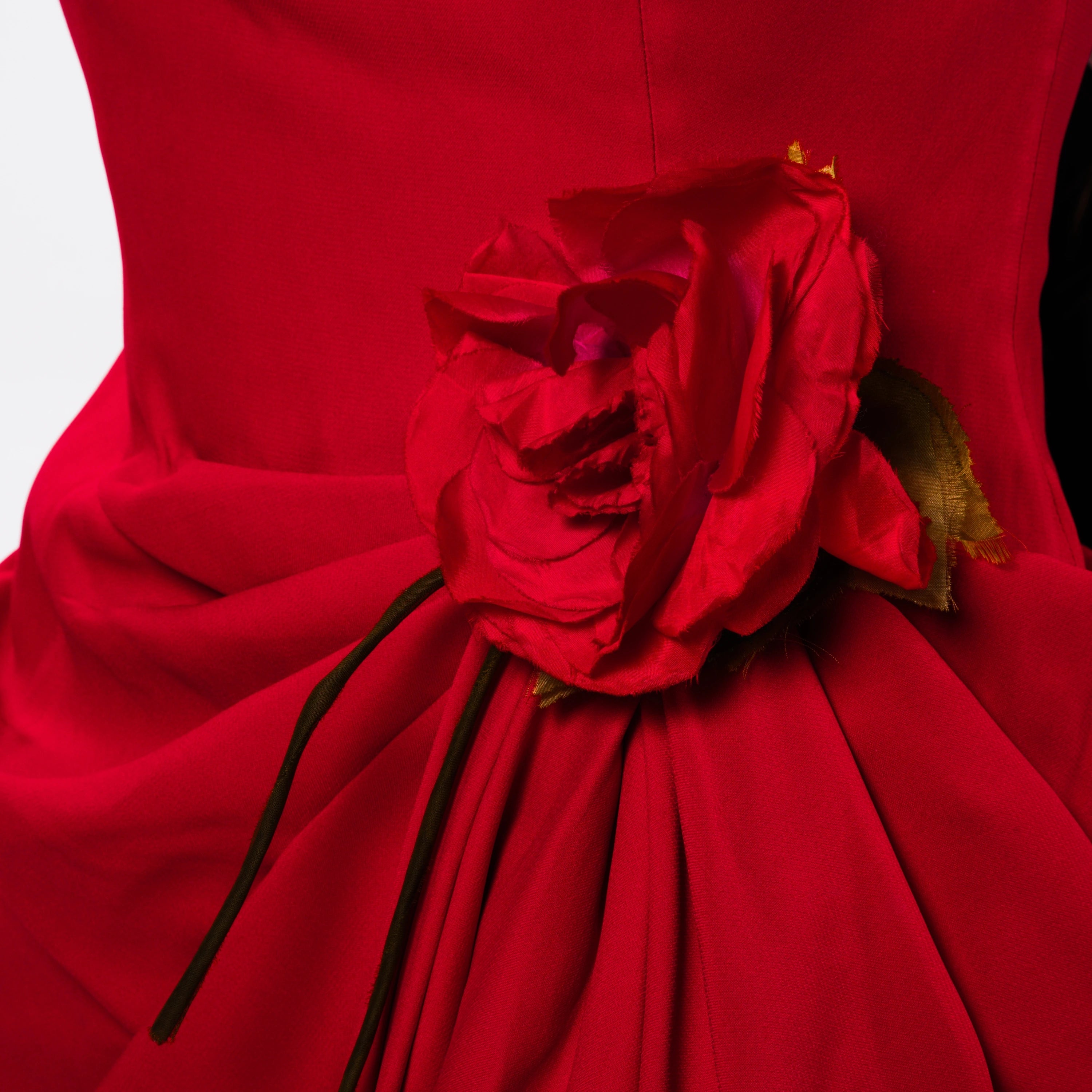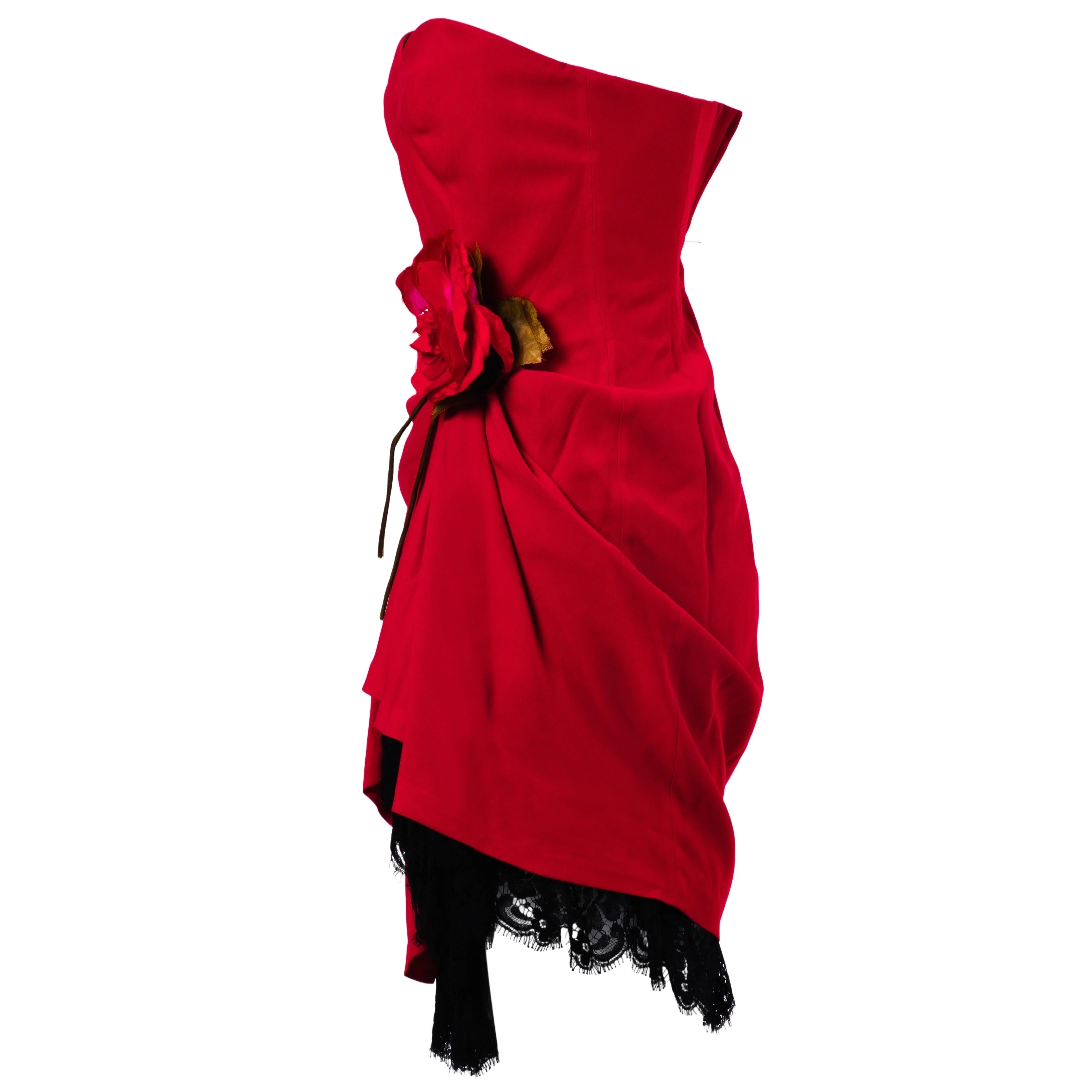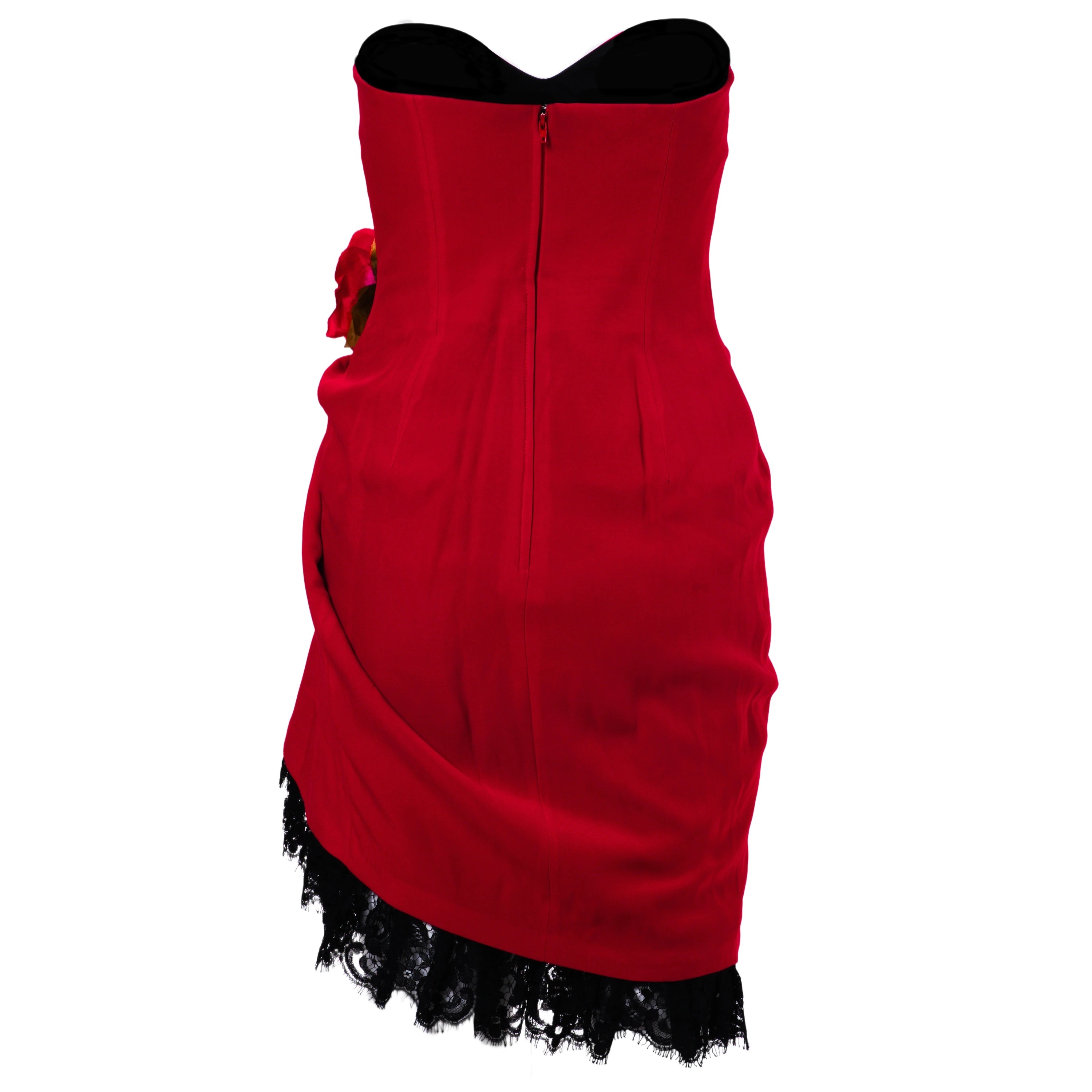 A 1991 Moschino Couture strapless dress crafted in vibrant red fabric, featuring a sculpted boned bodice and soft draping that enhances the silhouette. The design is distinguished by a statement rosette detail at the side waist and finished with black lace trim at the hem, evoking a sensual, lingerie-inspired aesthetic. Fully lined and made in Italy, this vintage Moschino dress captures the brand’s iconic early-1990s couture style, making it a collectible statement piece for eveningwear and special occasions.