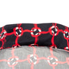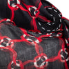 This Moschino shirt features a semi sheer silk material, with a beautiful red and white knot pattern over black. Complete with a tie knot at the neck and cuffs at the sleeve hem, this shirt is perfect for adding a touch of sophistication to any outfit.