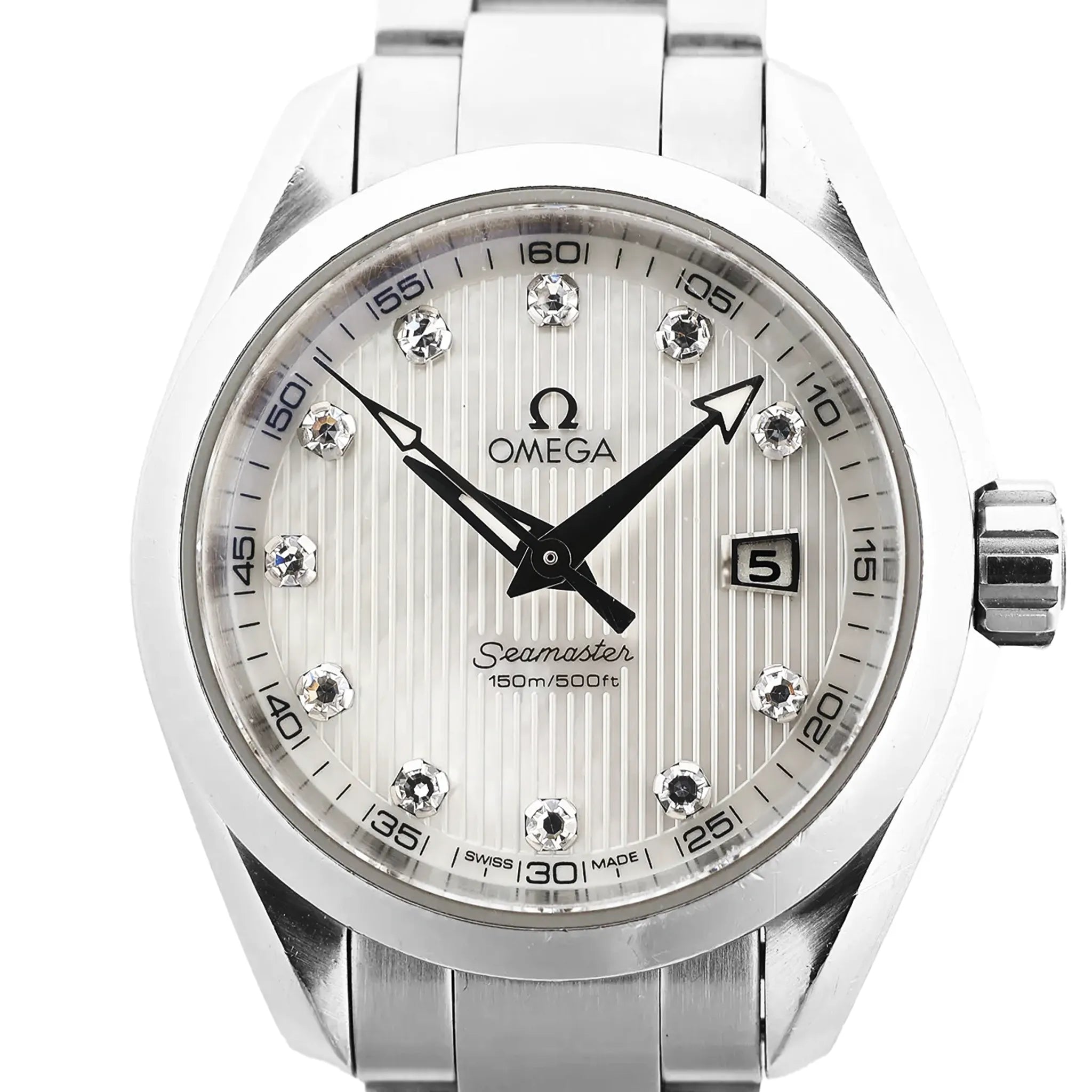The Omega Seamaster Aqua Terra 231.10.30.60.55.001 dazzles with a mother-of-pearl dial and diamond hour markers. Housed in stainless steel with quartz precision, it's a luxurious and sporty timepiece built for elegance and performance.