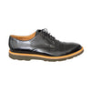 Polished black leather Oxford shoes by Paul Smith, featuring a cap toe, marbled sole, lace-up design, and a contrast green embossed leather tongue.