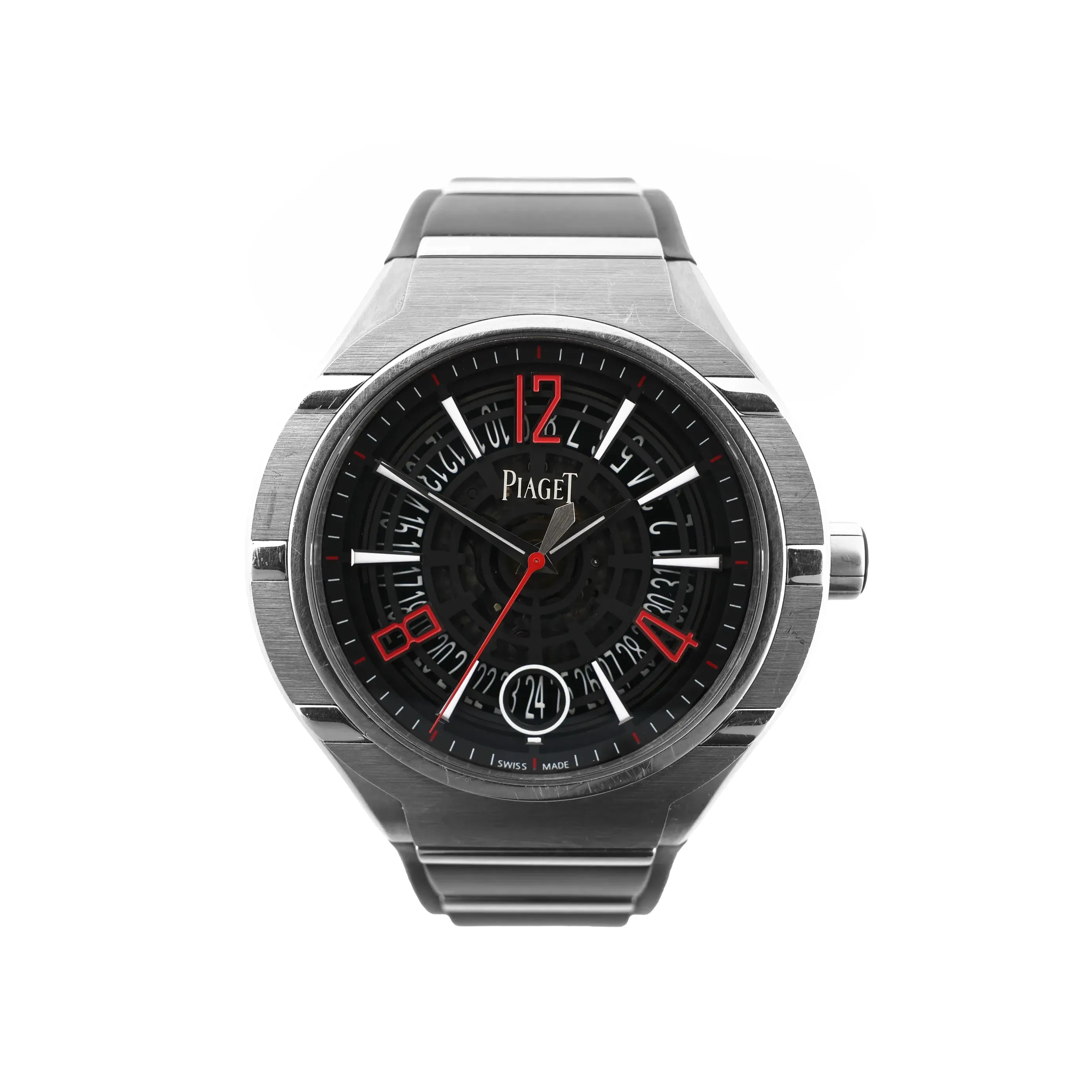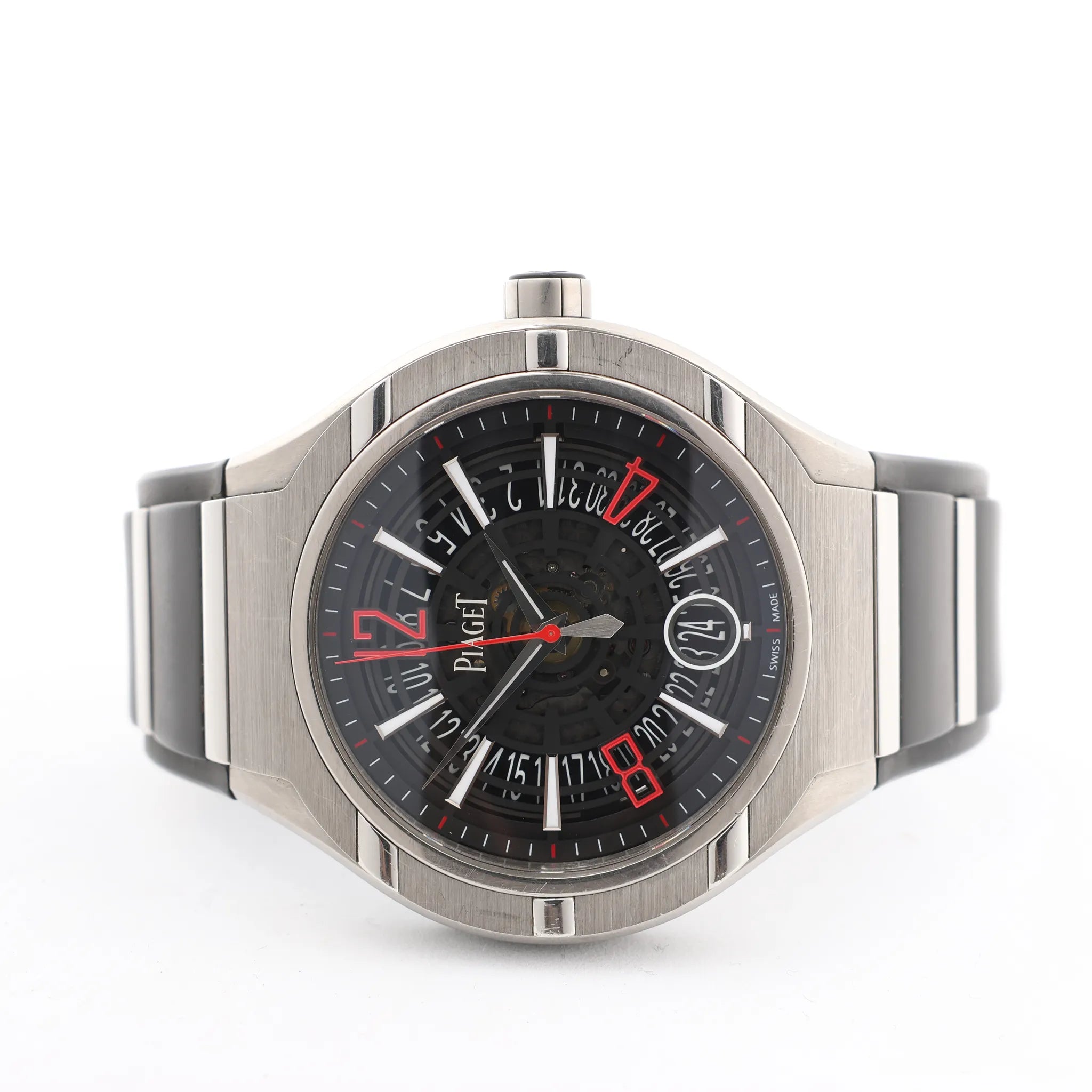Bold and sporty, the Piaget Polo FortyFive G0A35010 blends stainless steel and titanium with a rubber strap. Model 1032140 features an automatic movement and striking skeleton dial for a modern luxury look.