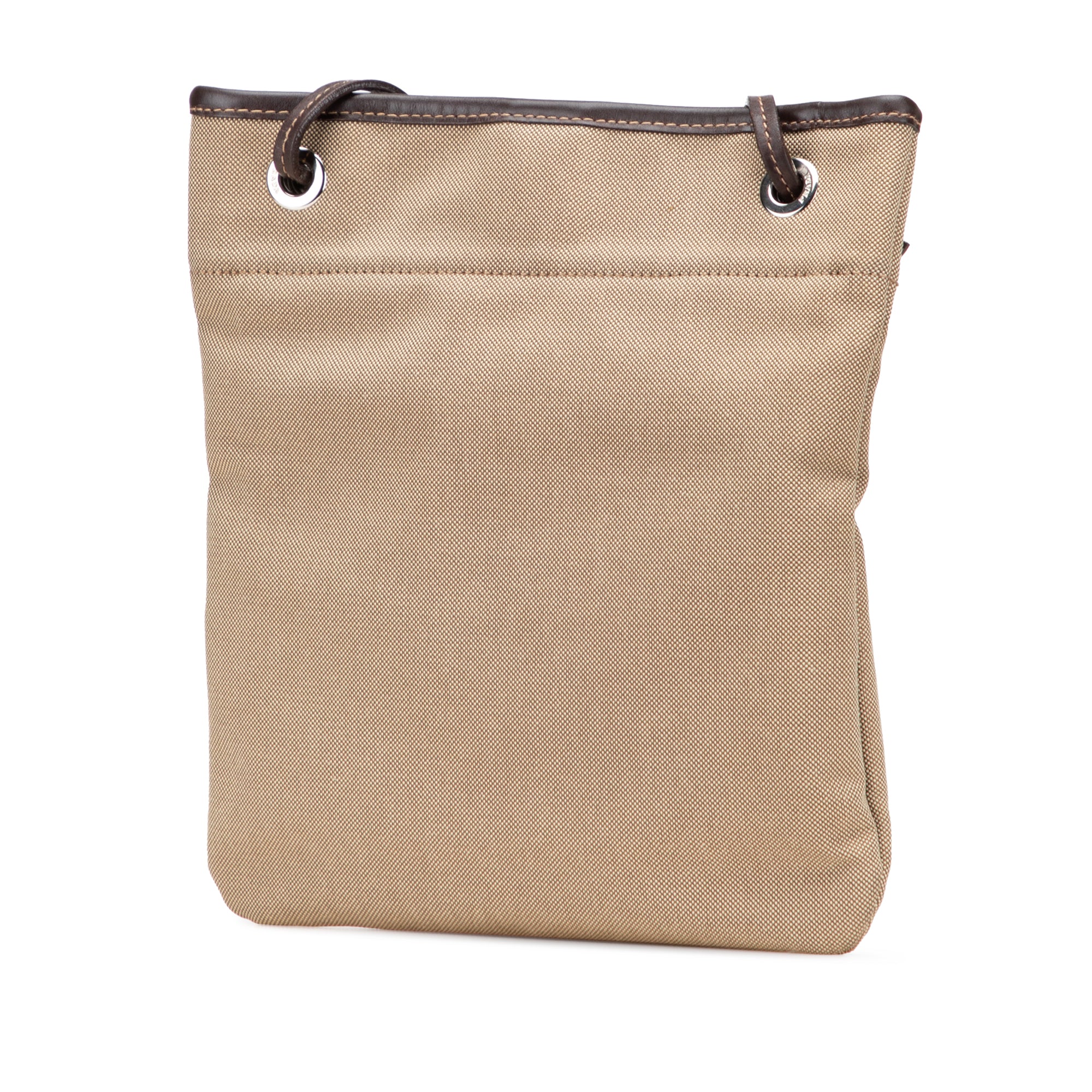 This crossbody bag features a canvas body with leather trim, a flat adjustable strap, an open top with magnetic snap closure, and an interior zip pocket. Retail Price: 600.00
