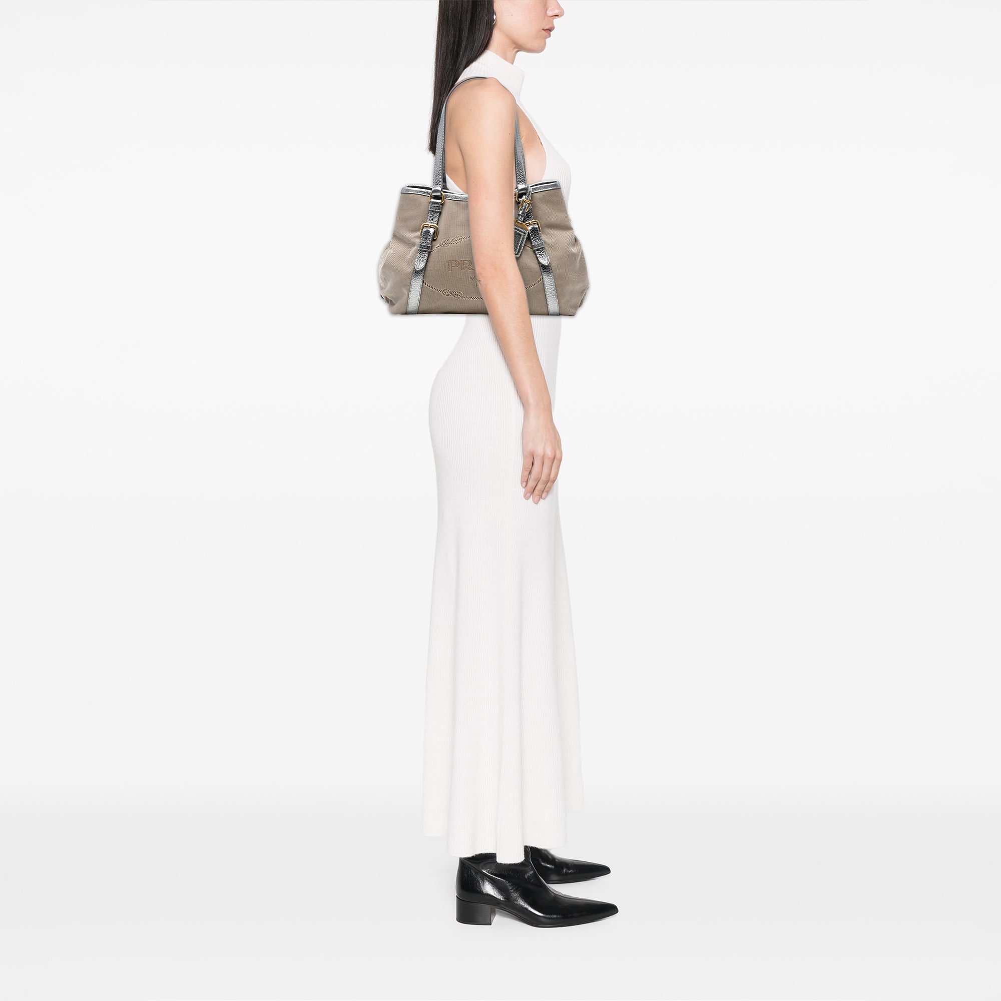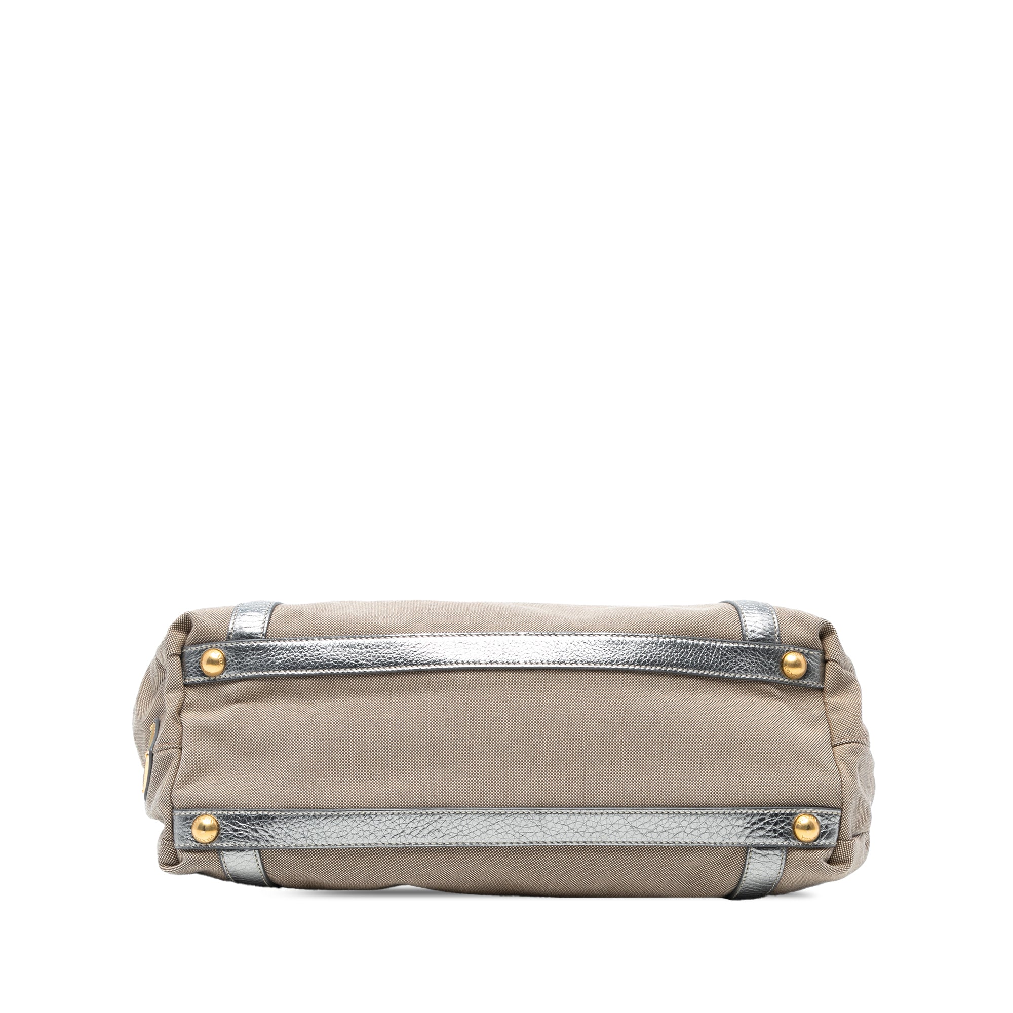 This tote features a canvas body with leather trim, flat leather straps, an open top with snap closure, and interior zip and slip pockets. Retail Price: 1030.00