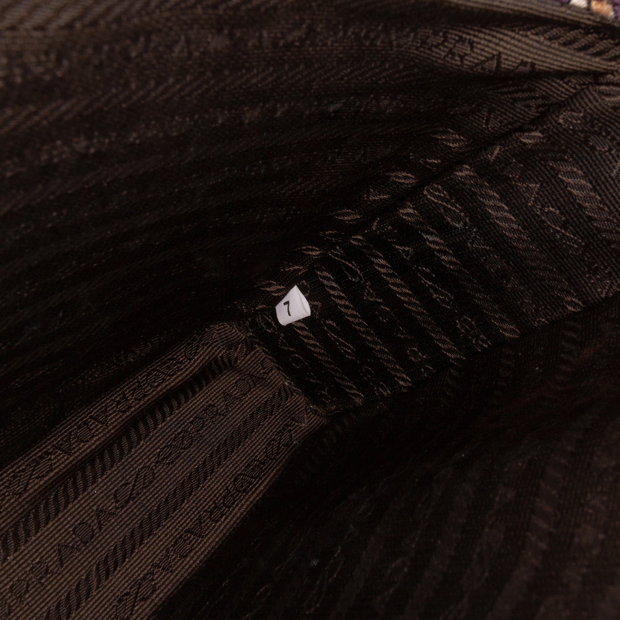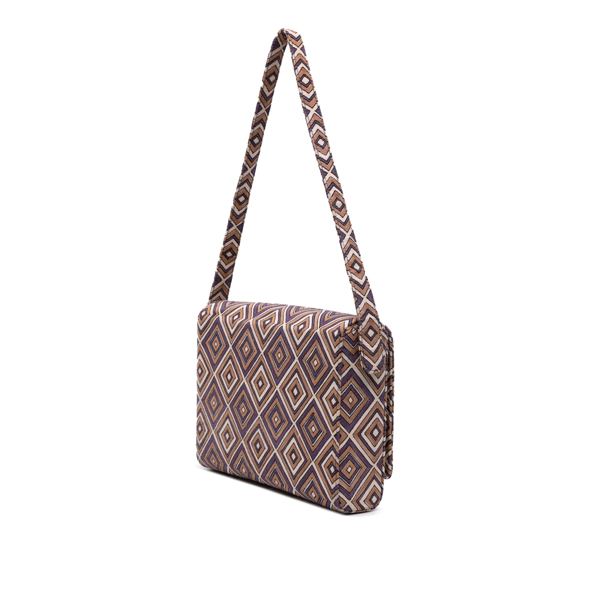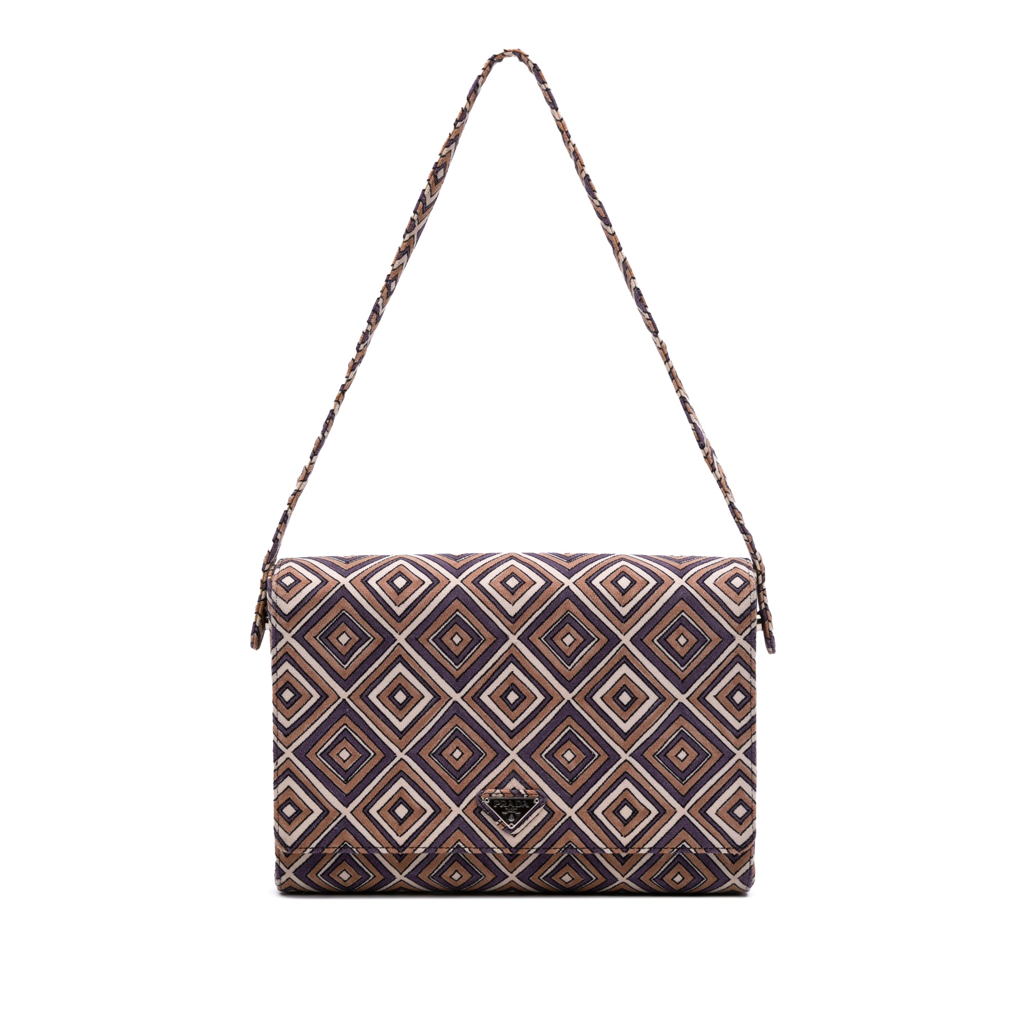 This shoulder bag features a printed canvas body, a flat shoulder strap, and front flap with magnetic snap closure. Retail Price: 1250.00