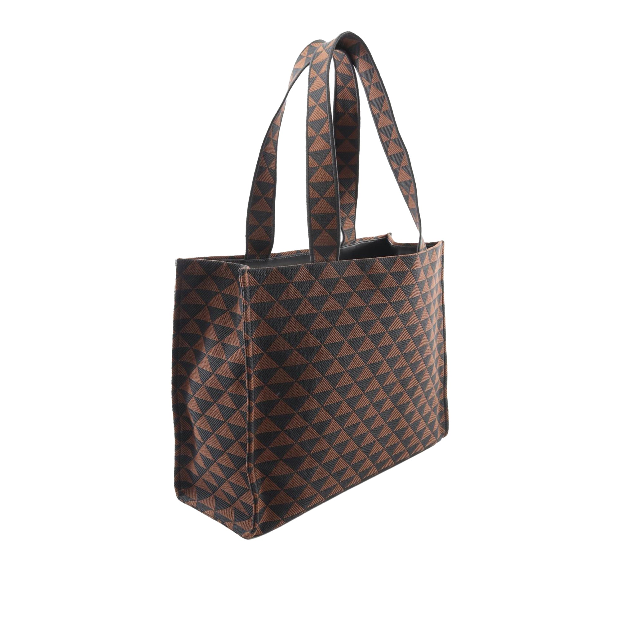 The Triangolo Symbole tote features an embroidered canvas body with saffiano leather trim, flat fabric handles, an open top, and interior zip and slip pockets. Inclusion: Dust bag. Retail Price: 3950.00