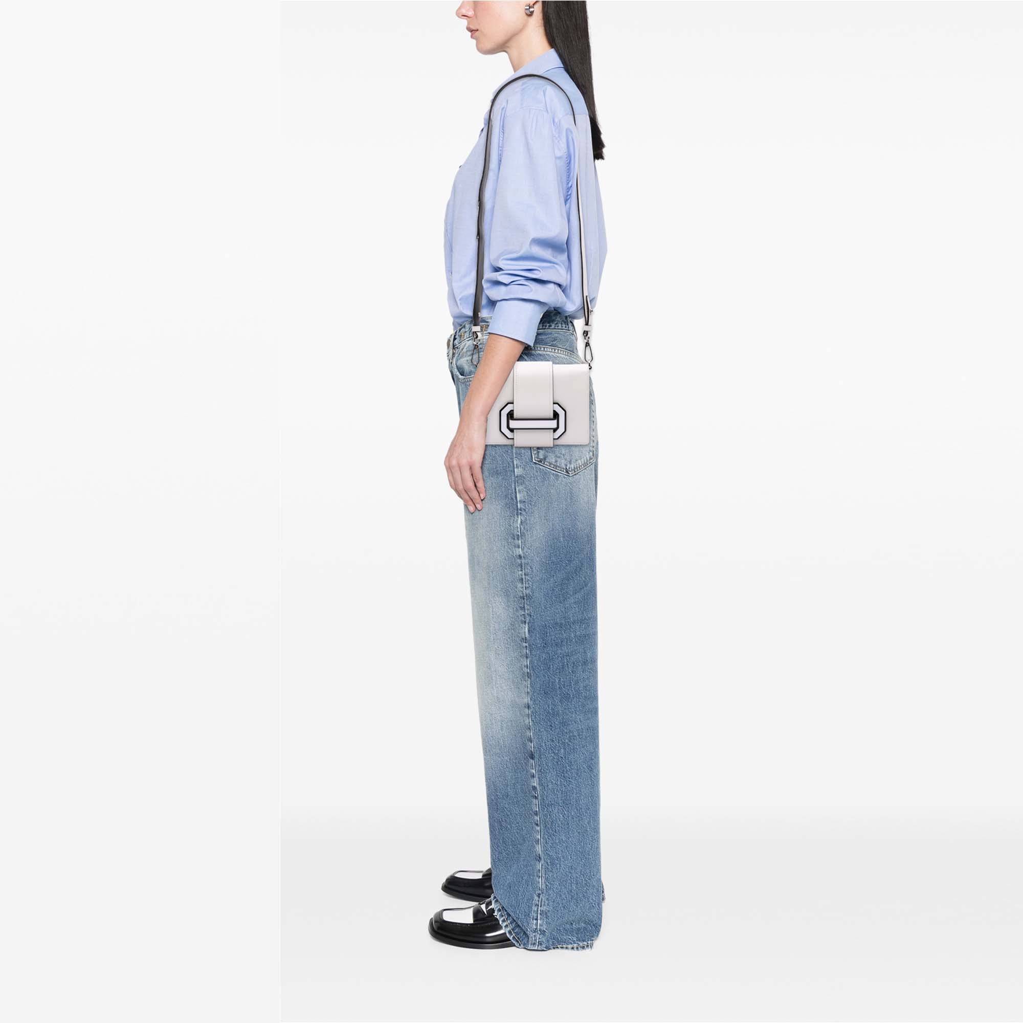 This crossbody bag features a leather body, a flat leather strap, a front flap with pull-through closure, and interior slip pockets. Retail Price: 1245.00