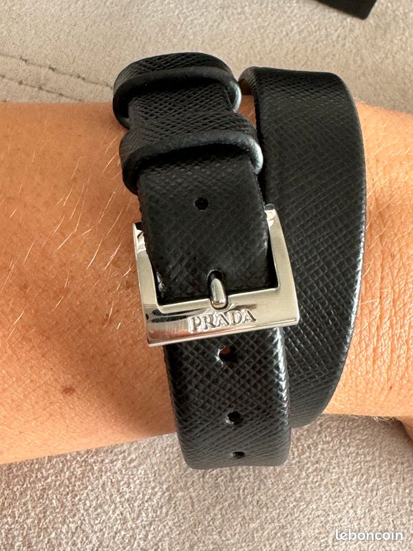 Prada double-wrap bracelet in black Saffiano leather with a silver buckle by Prada. Adjustable length from 31 to 41cm for double wrap wear. Never worn. With box and overbox