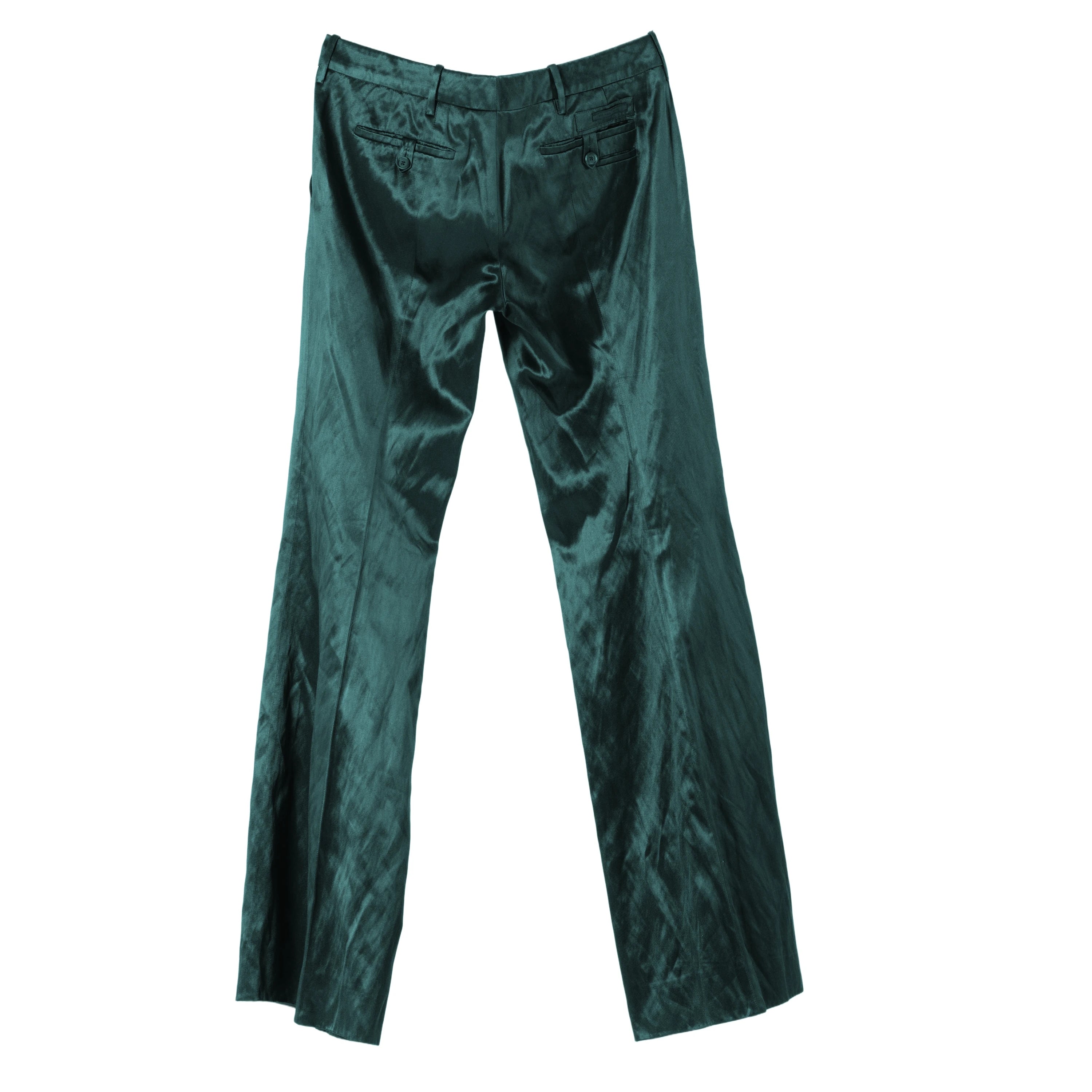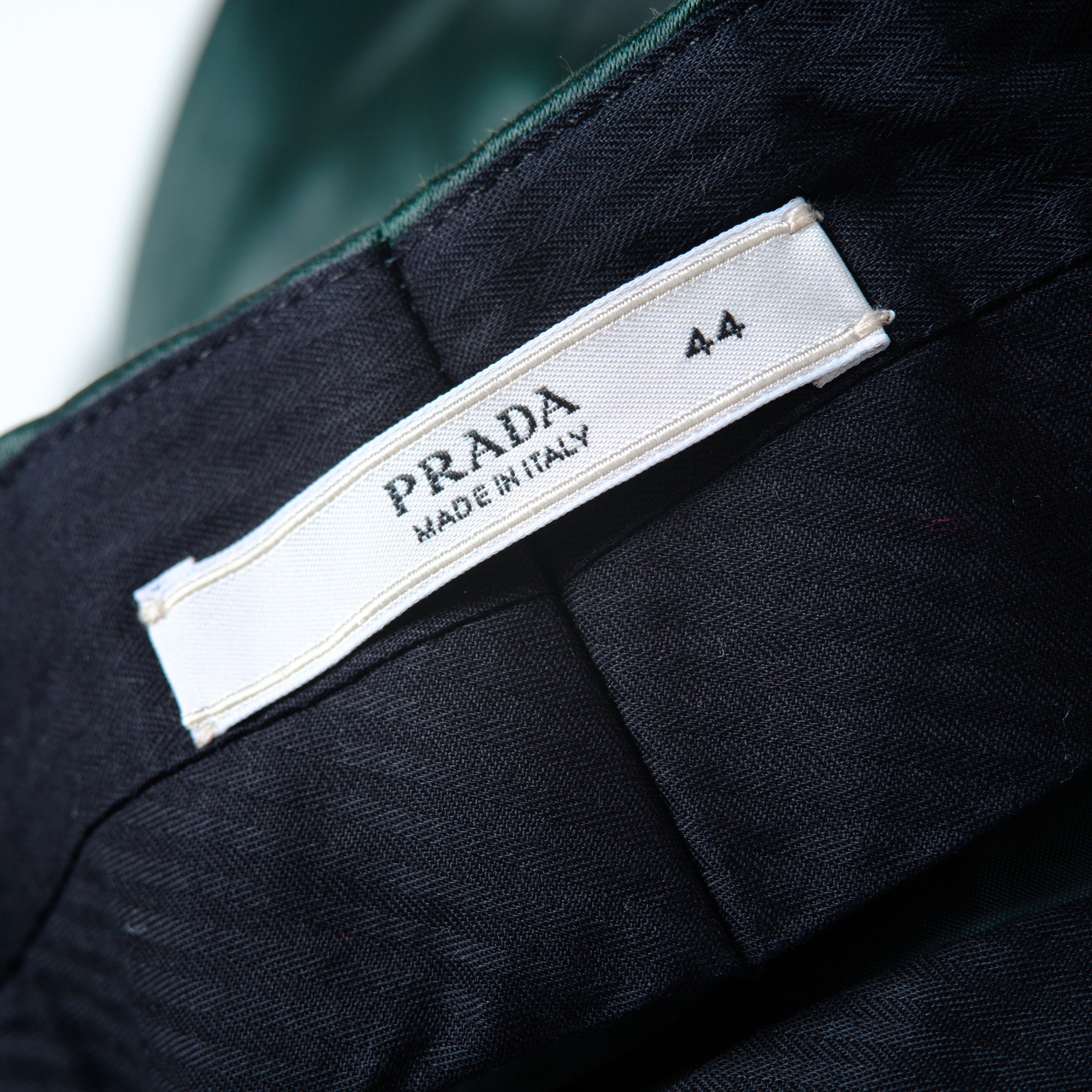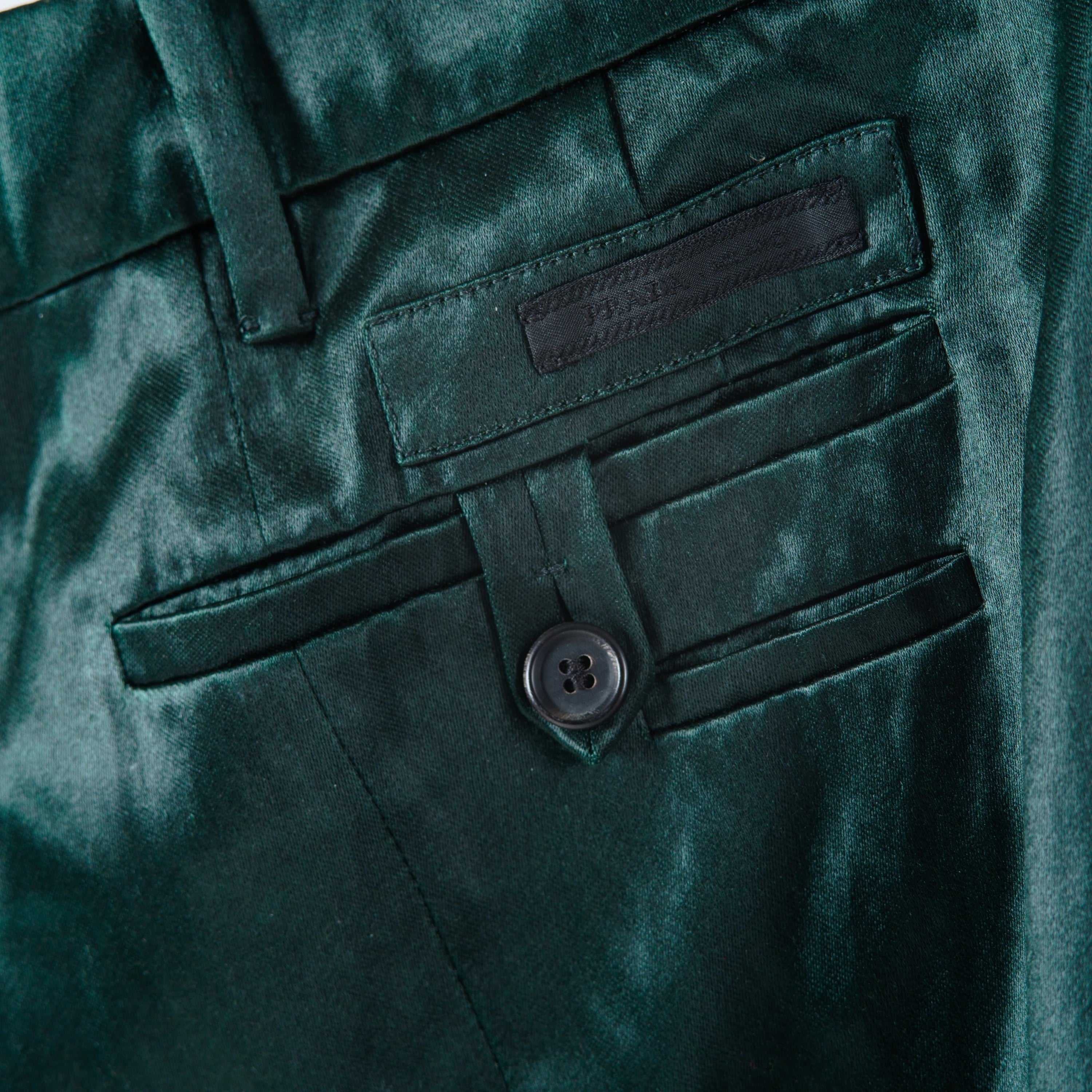 Elevate your wardrobe with these Prada tailored trousers, crafted in Italy from a luxurious silk-cotton blend with a rich emerald satin finish. Designed with a mid-rise waist and a straight, elongated leg, they offer a refined silhouette with subtle fluidity. Side and back pockets add practical elegance, while the glossy sheen enhances their sophisticated character.