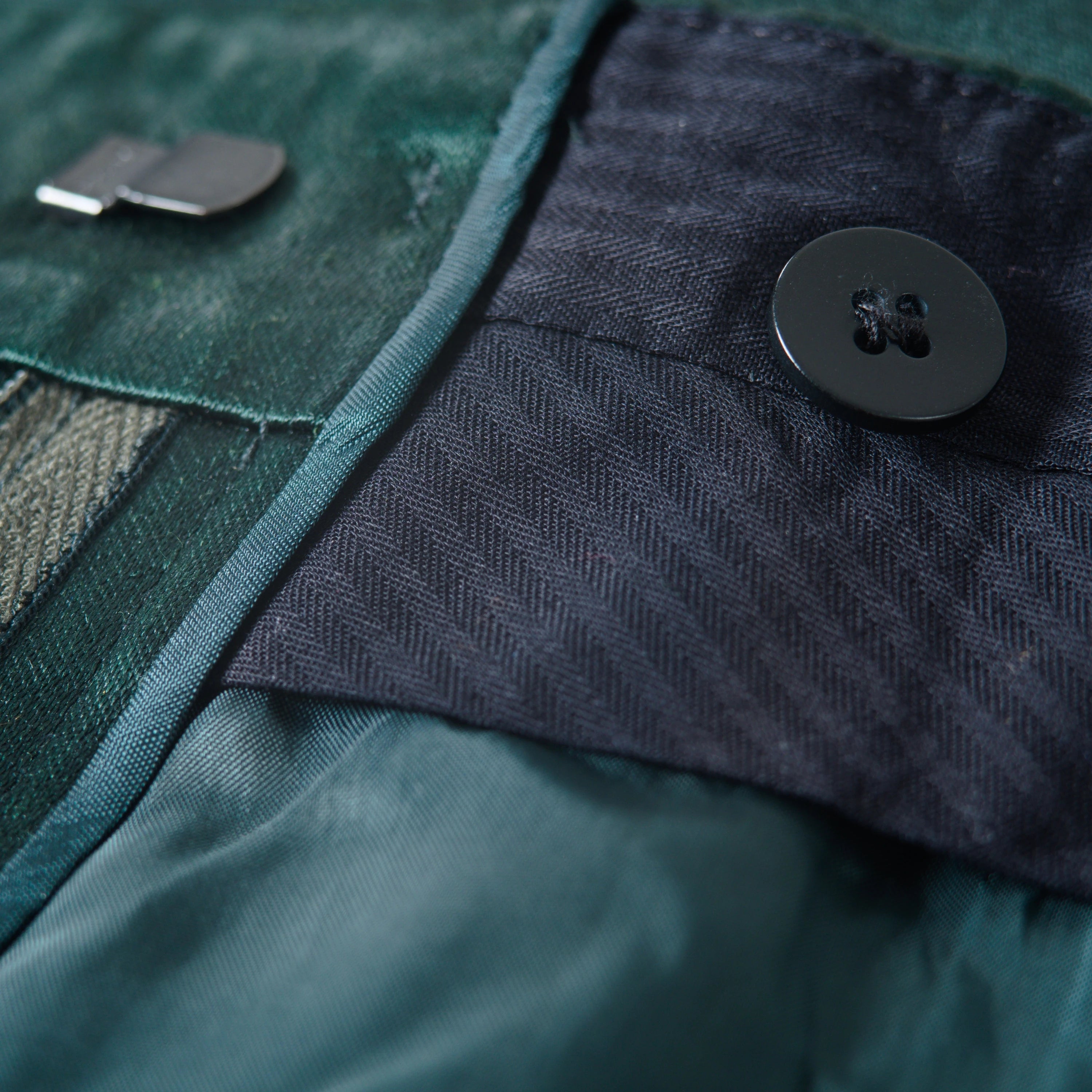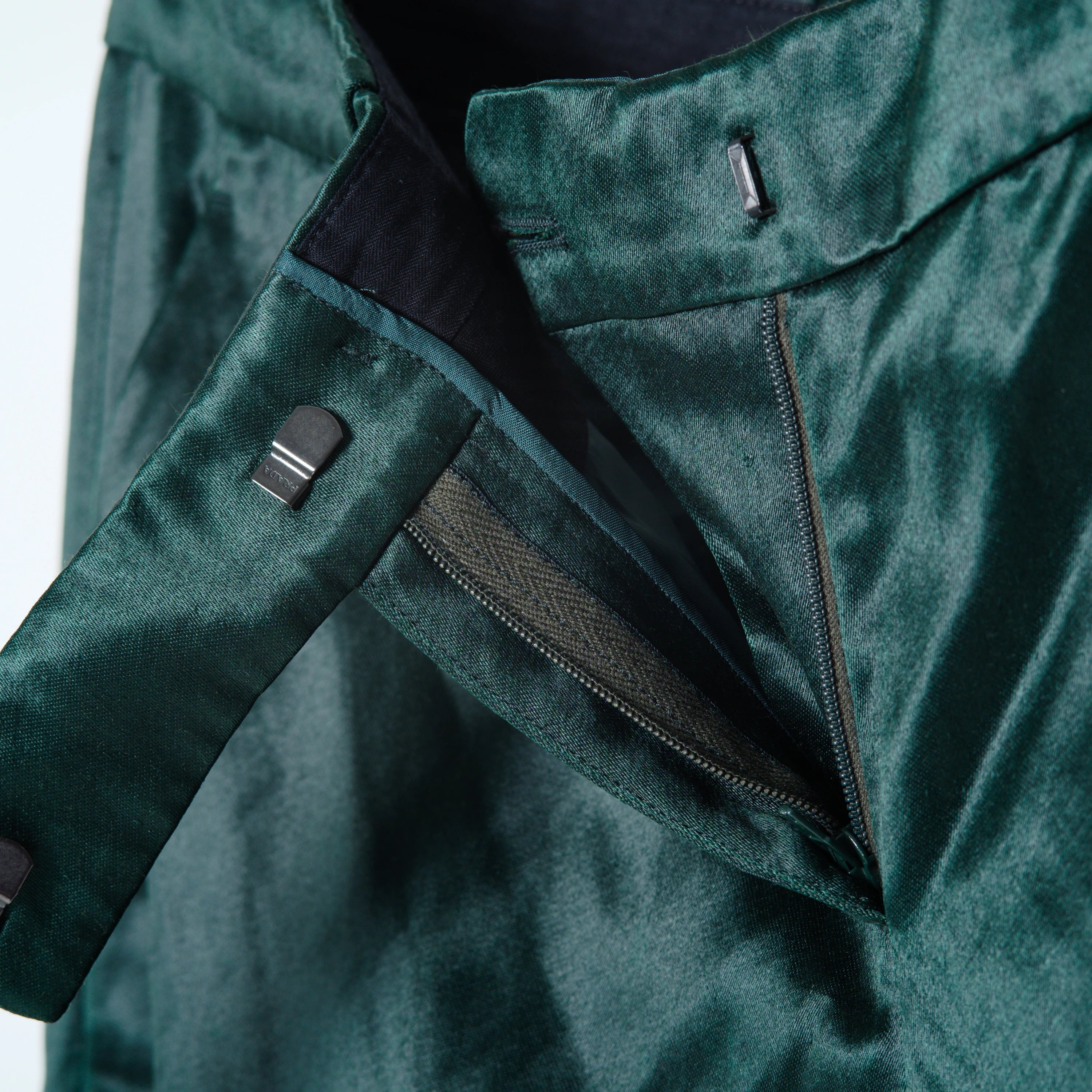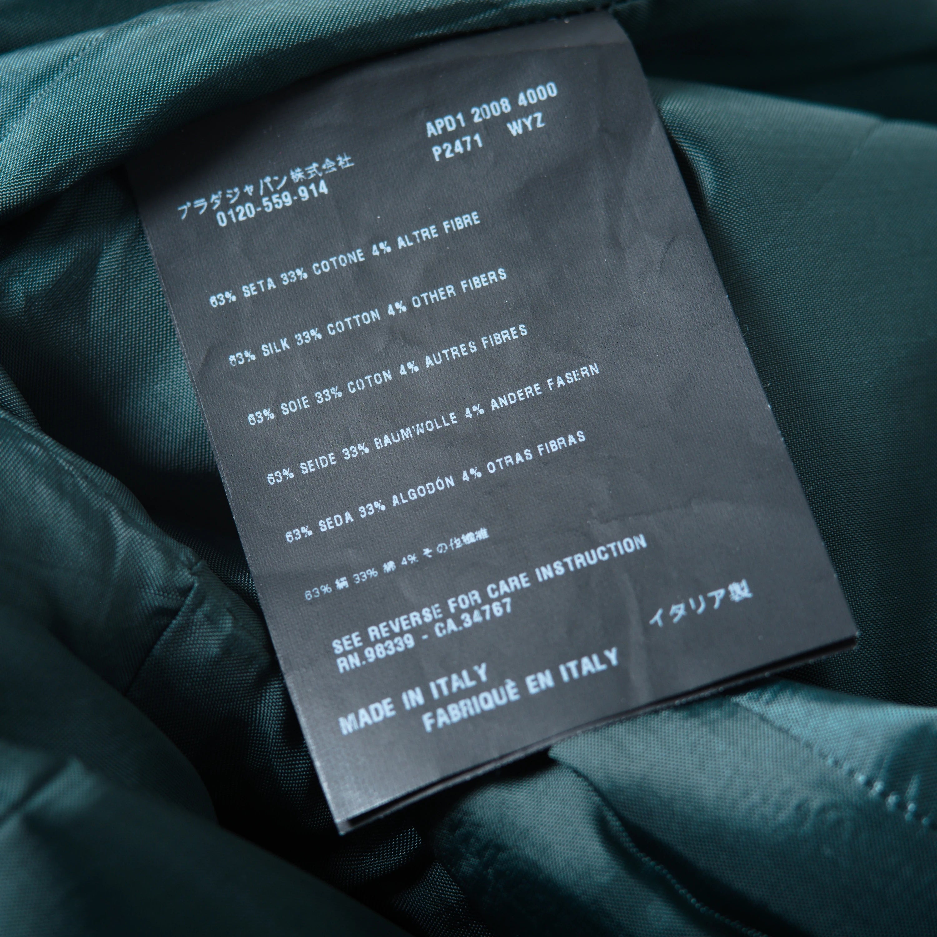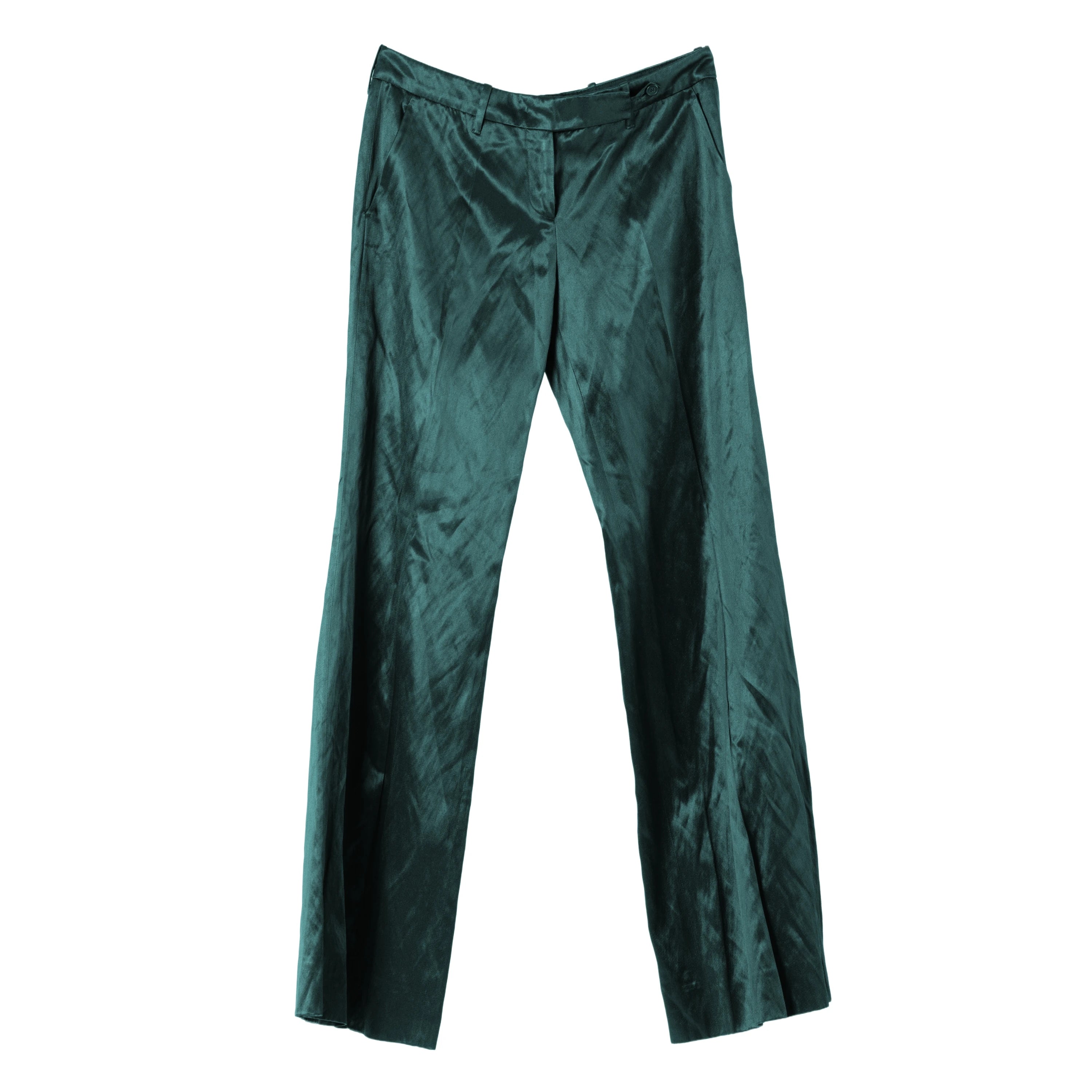 Elevate your wardrobe with these Prada tailored trousers, crafted in Italy from a luxurious silk-cotton blend with a rich emerald satin finish. Designed with a mid-rise waist and a straight, elongated leg, they offer a refined silhouette with subtle fluidity. Side and back pockets add practical elegance, while the glossy sheen enhances their sophisticated character.
