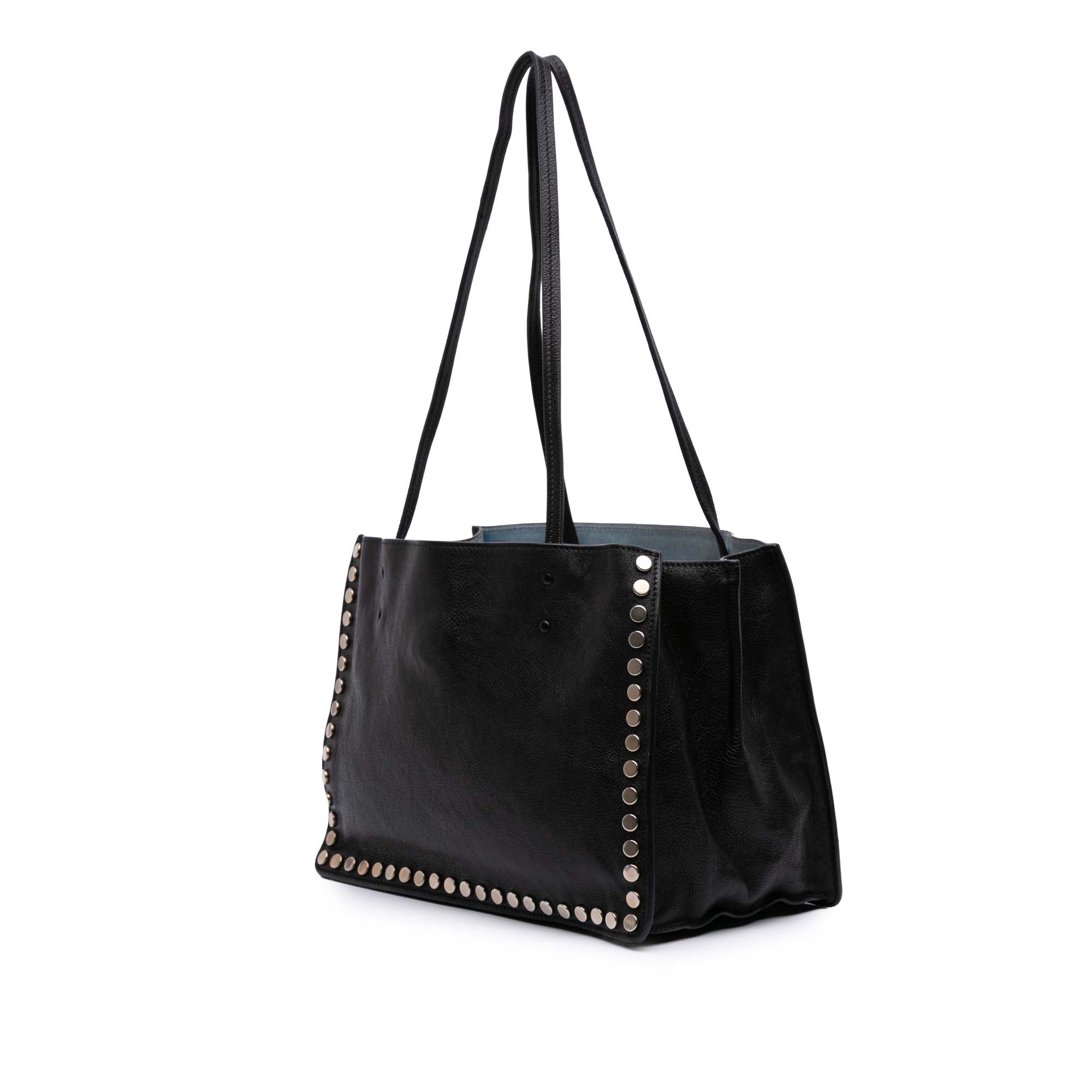 The Etiquette Tote bag features a studded leather body, flat leather straps, an open top, and interior zip and slip compartments. Retail Price: 1250.00