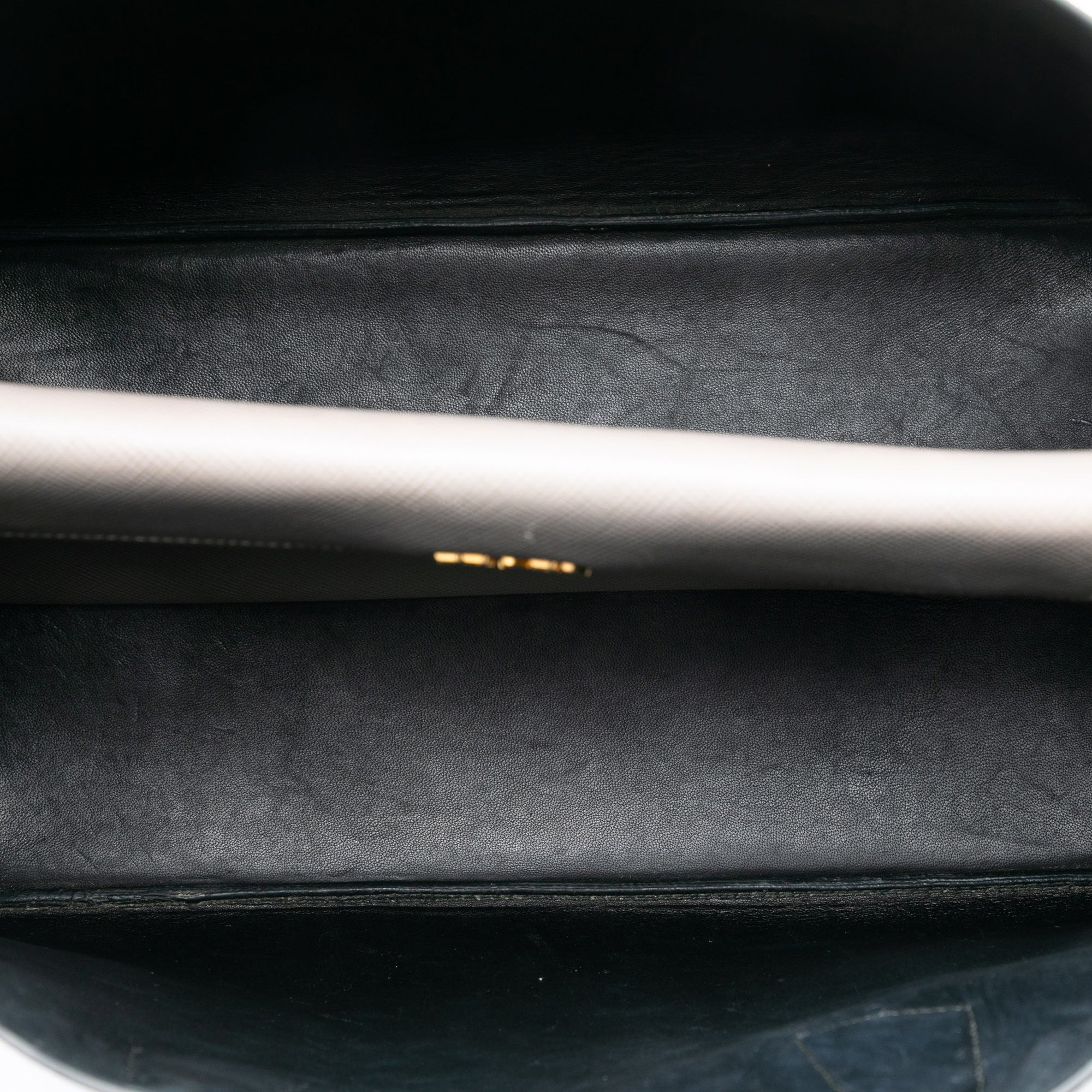 This satchel features a saffiano leather body, rolled leather handles, an open top, and an interior pocket. Retail Price: 4900.00