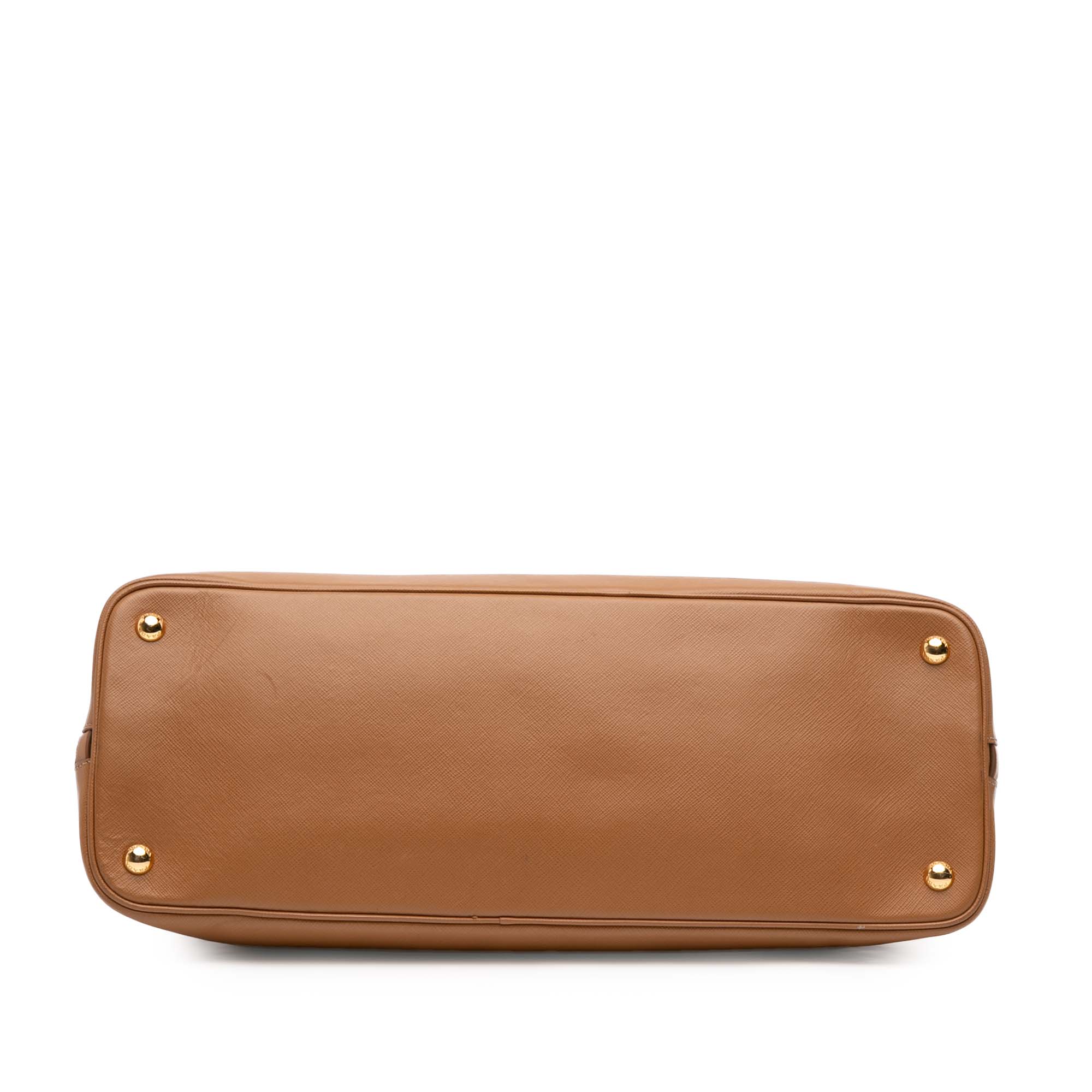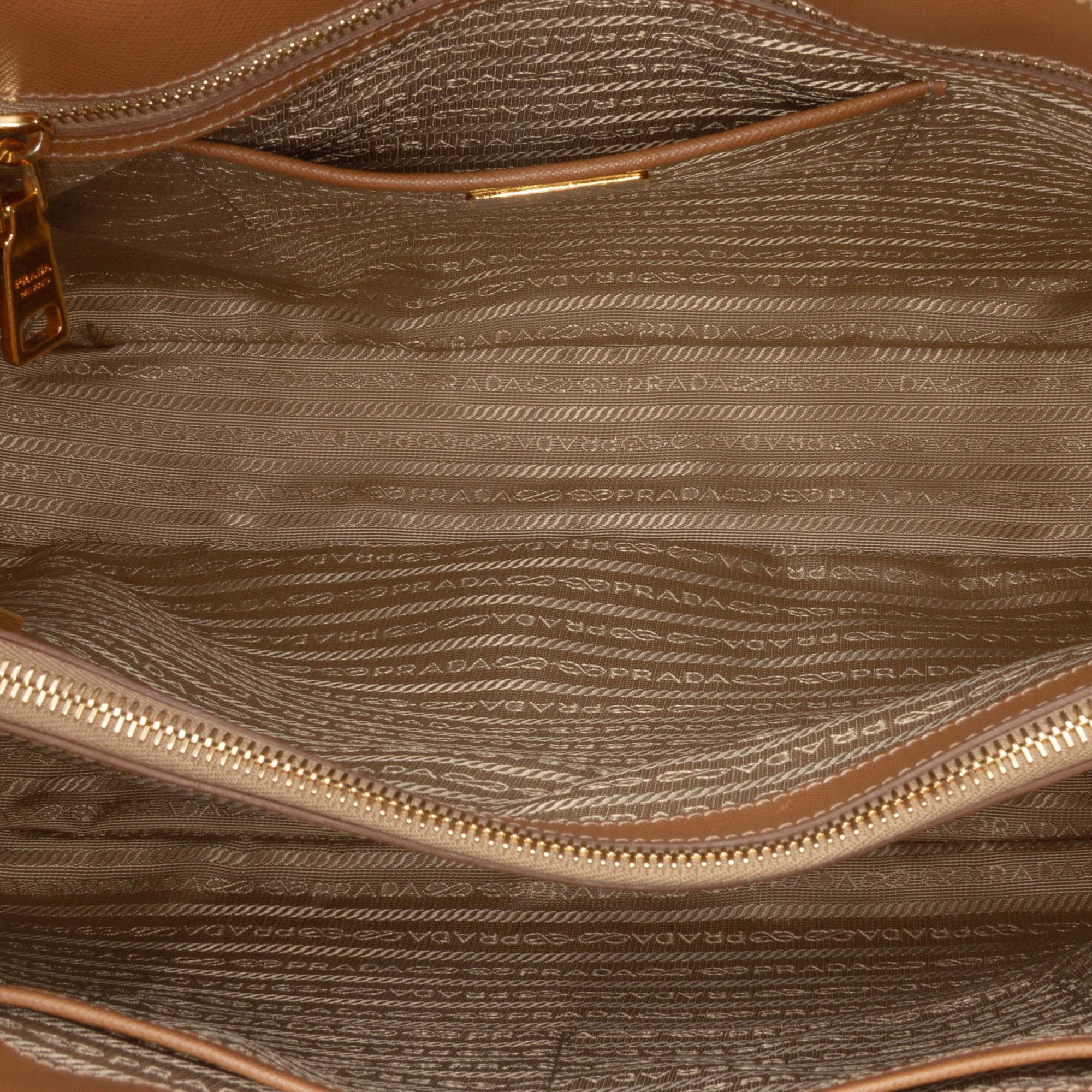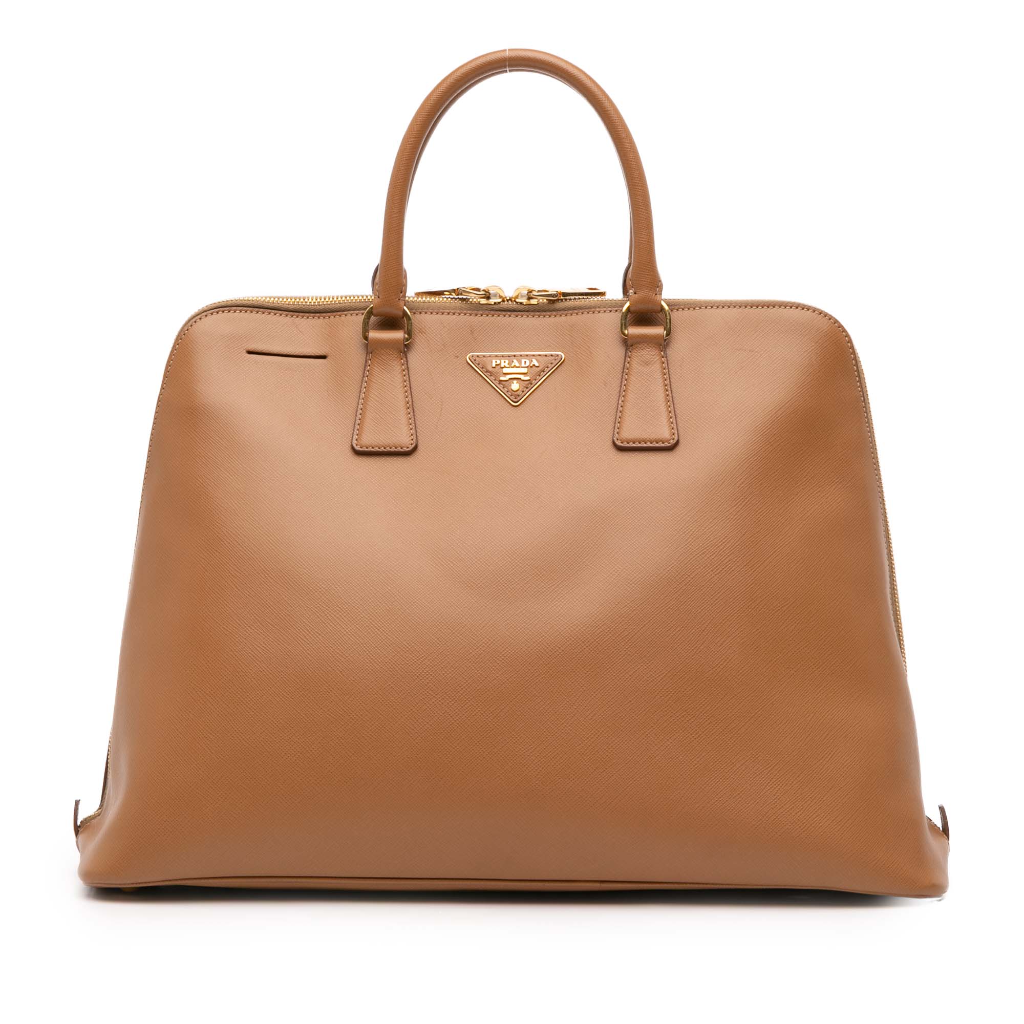 The Promenade features a saffiano leather body, rolled leather handles, a double zip around closure, an interior center zip compartment, and interior zip and slip pockets. Retail Price: 2200.00