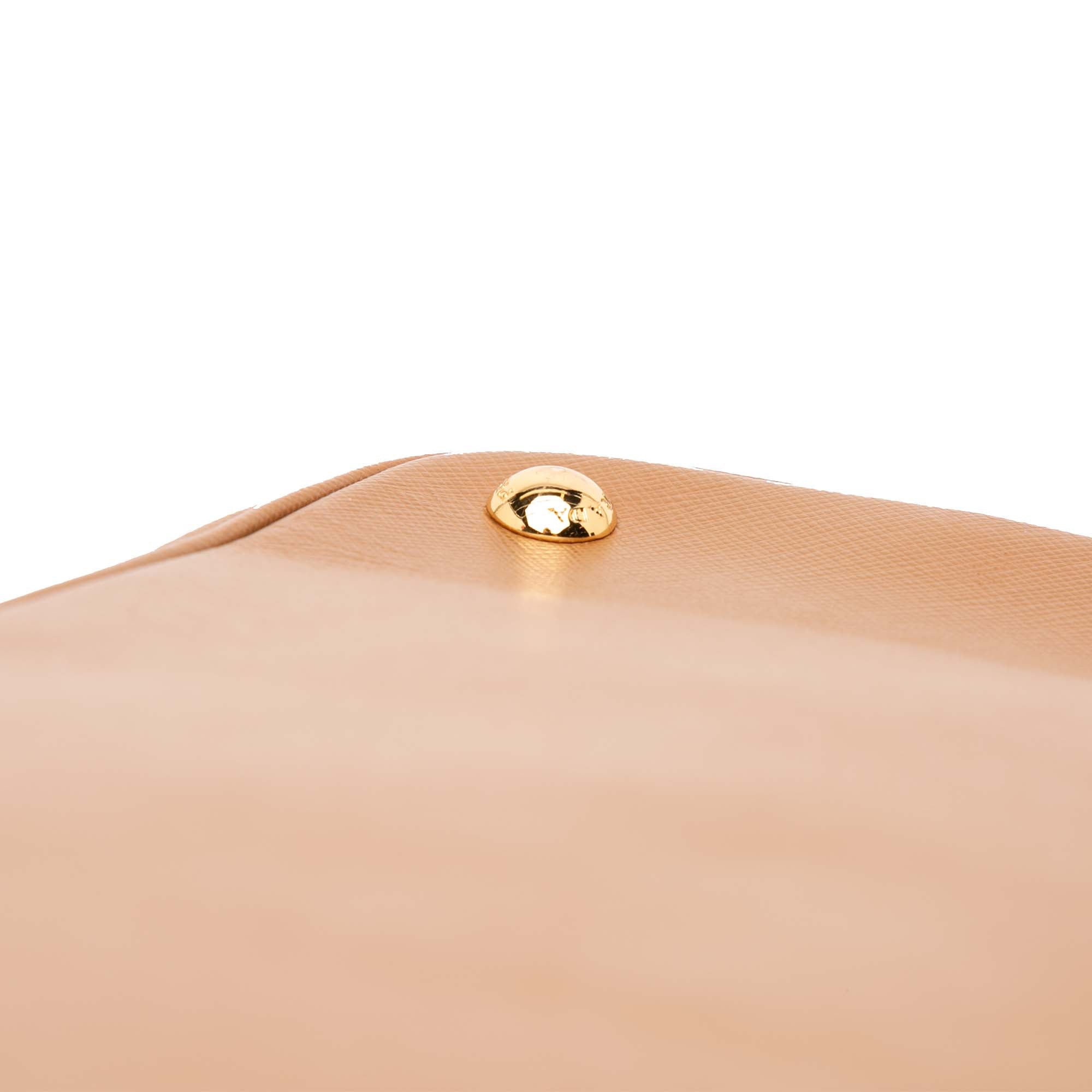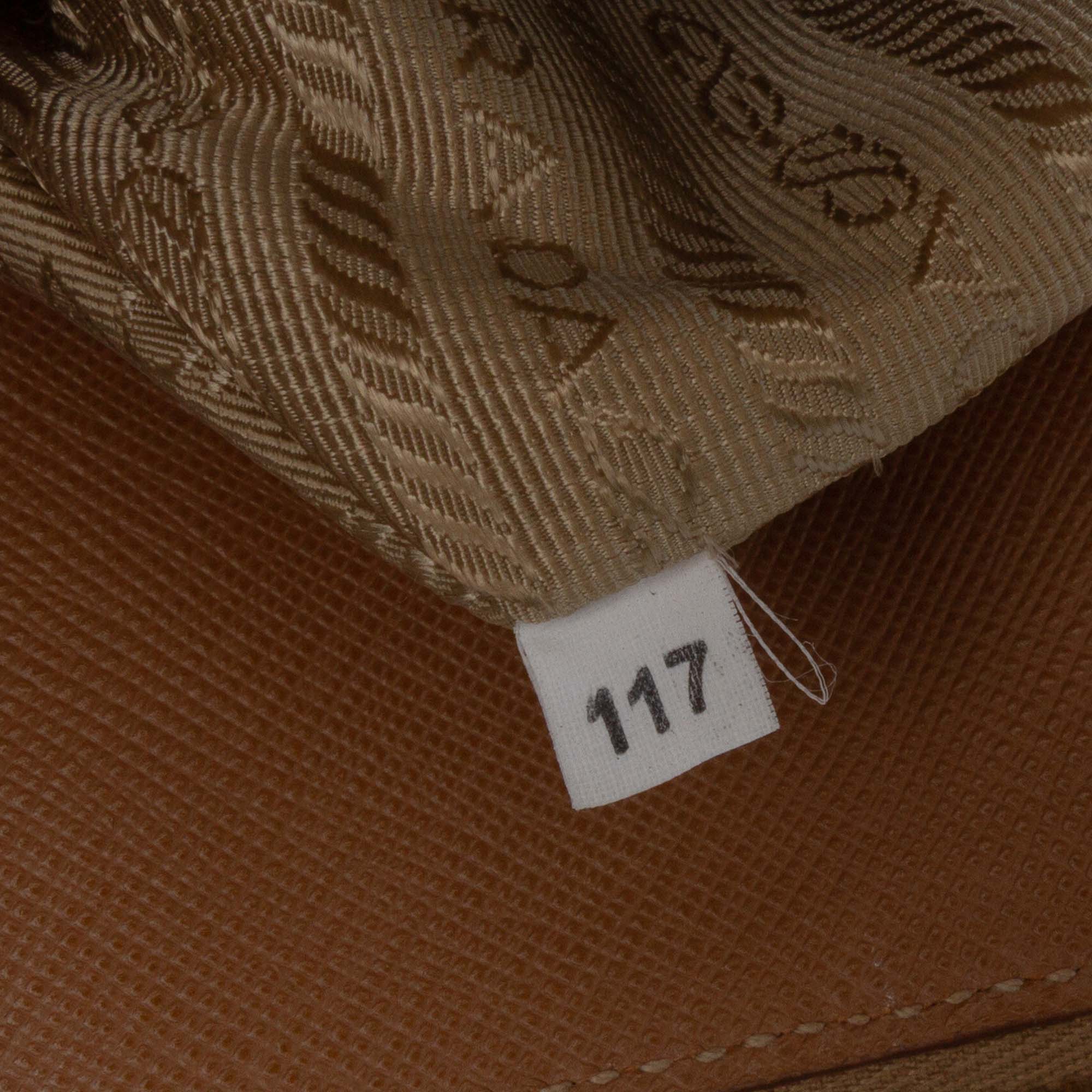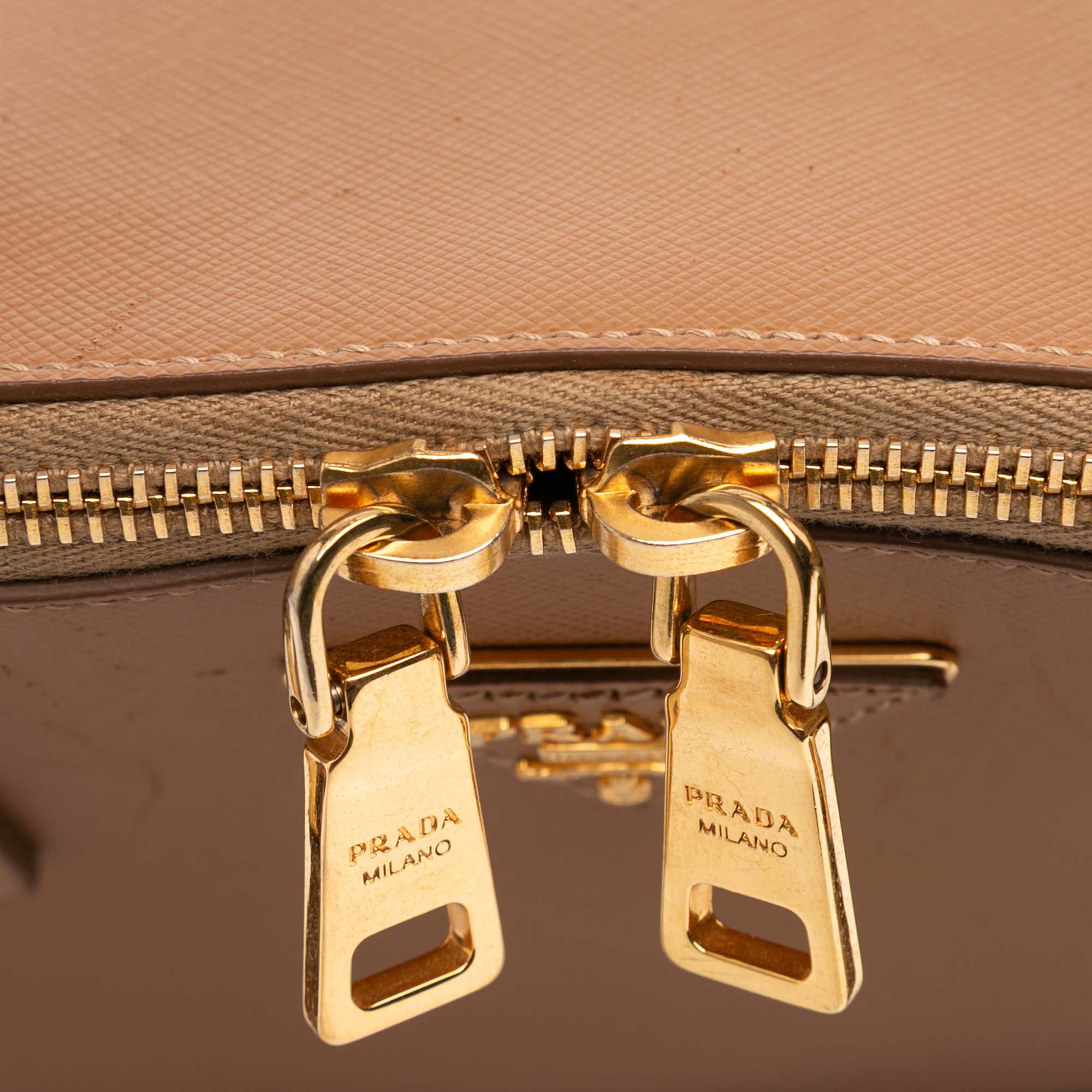 The Promenade features a saffiano leather body, rolled leather handles, a double zip around closure, an interior center zip compartment, and interior zip and slip pockets. Retail Price: 2200.00