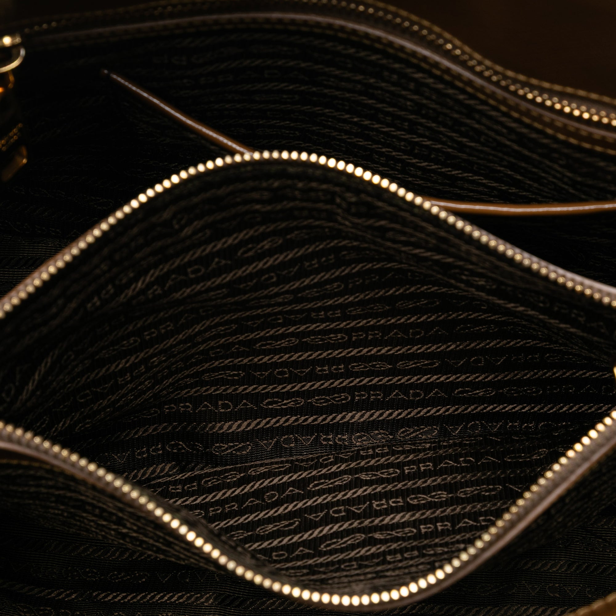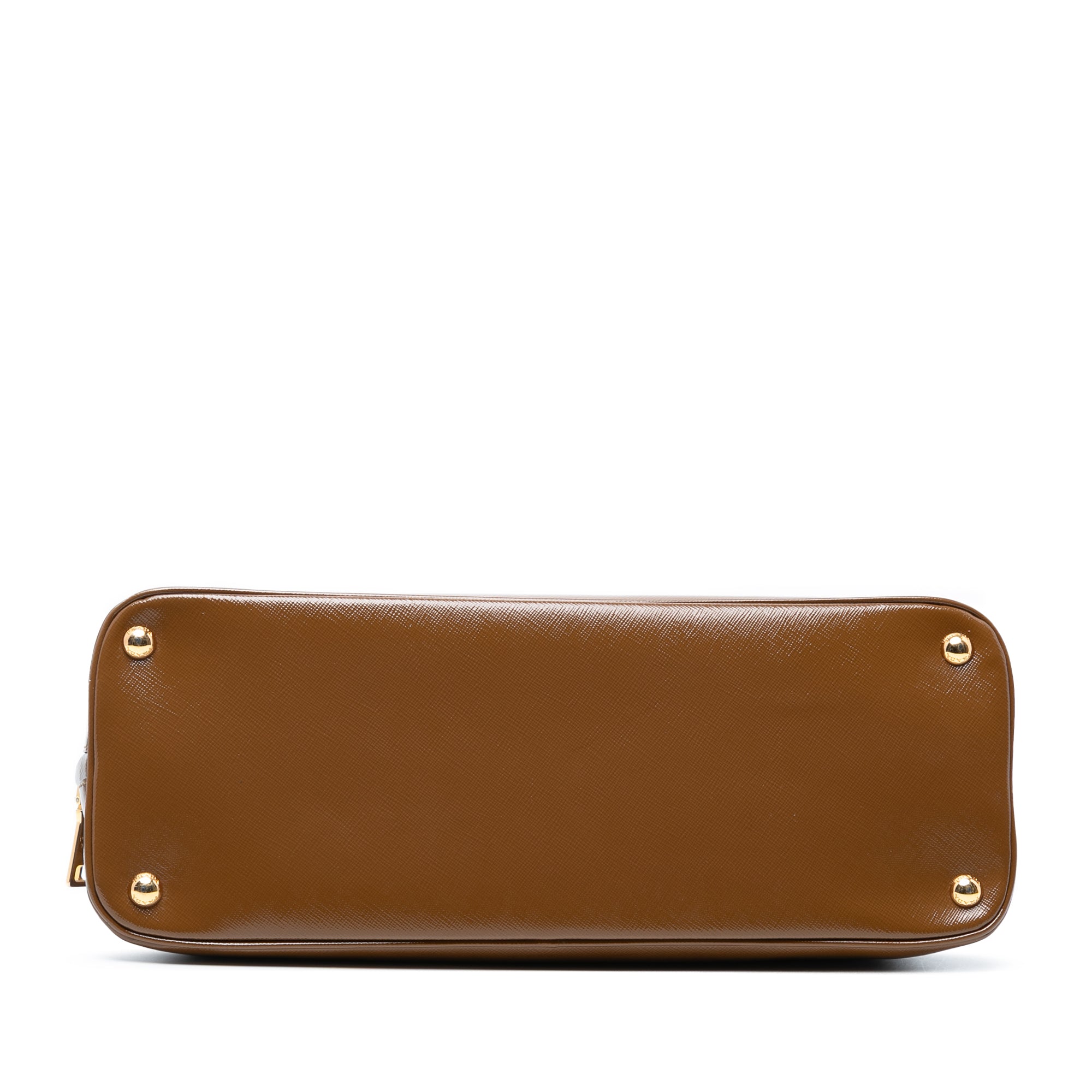 The Promenade features a saffiano vernice leather body, rolled leather handles, a two-way zip around closure, an interior center zip compartment, and interior zip and slip pockets. Retail Price: 2200.00