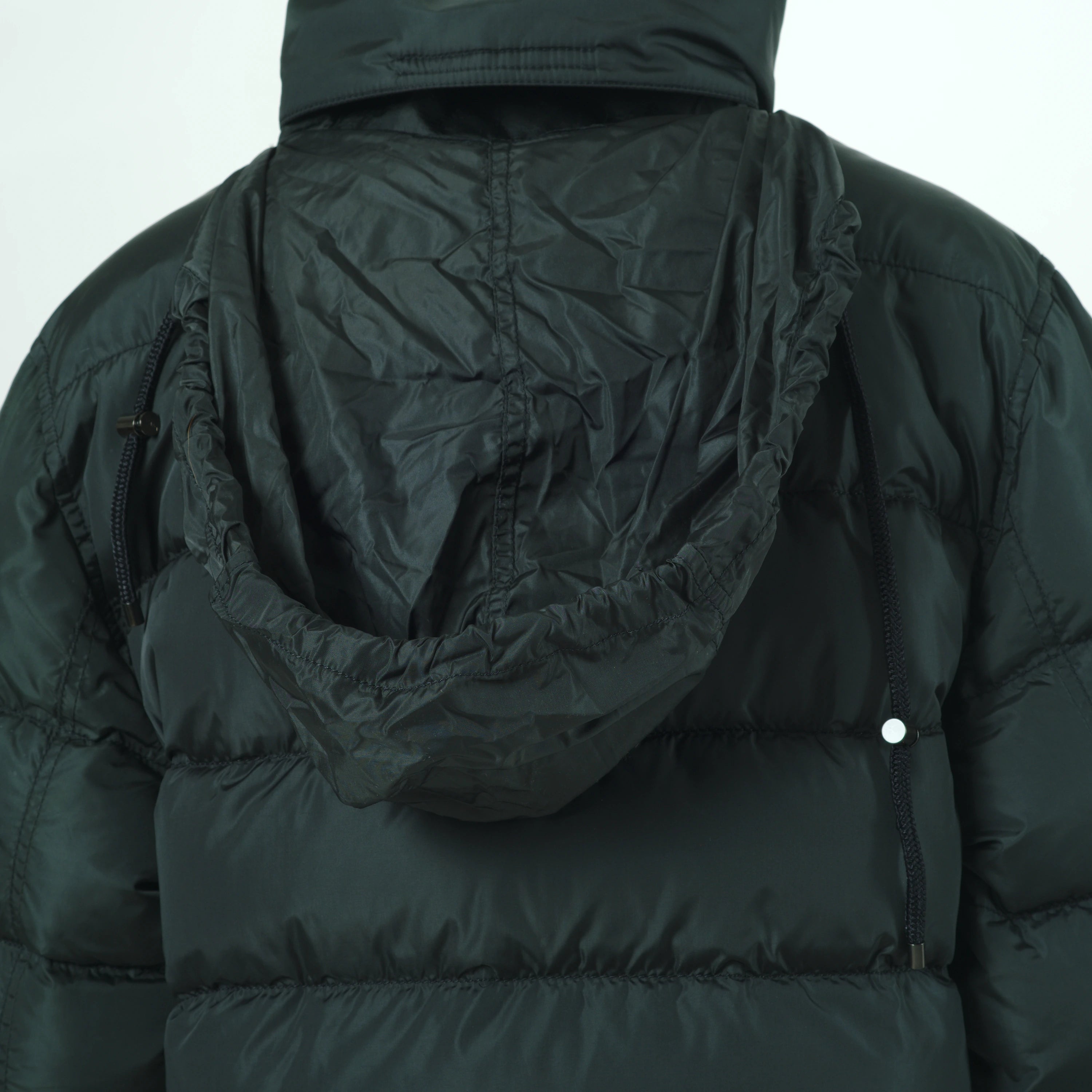 Long Prada down jacket made of high-quality technical fabric with down filling, designed to provide protection from the cold and thermal comfort. The jacket features a long cut, front zip closure, functional side pockets, and carefully crafted finishes. The hood, adjustable and detachable from the collar, offers protection against wind and light rain.