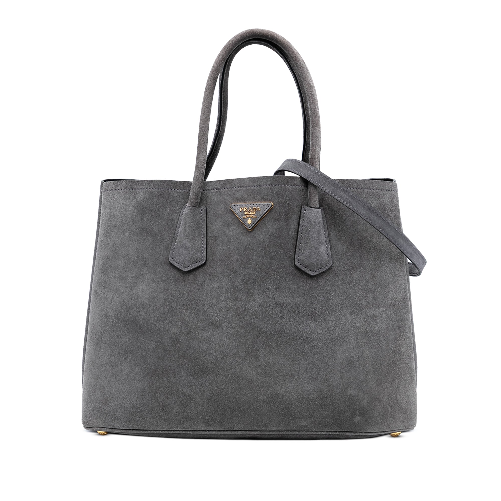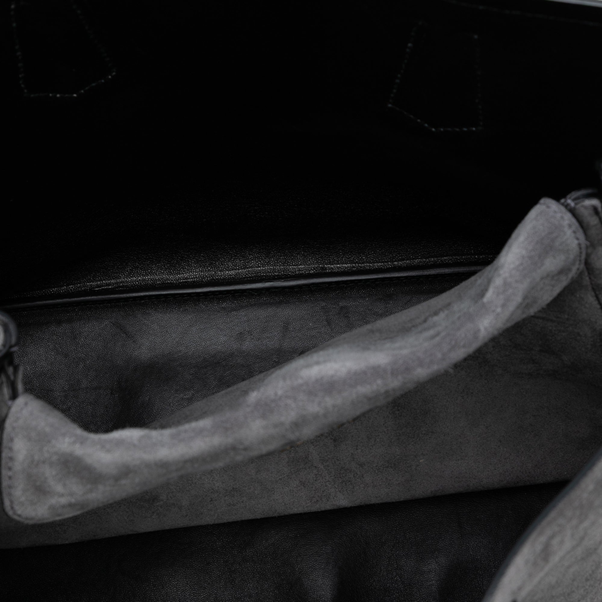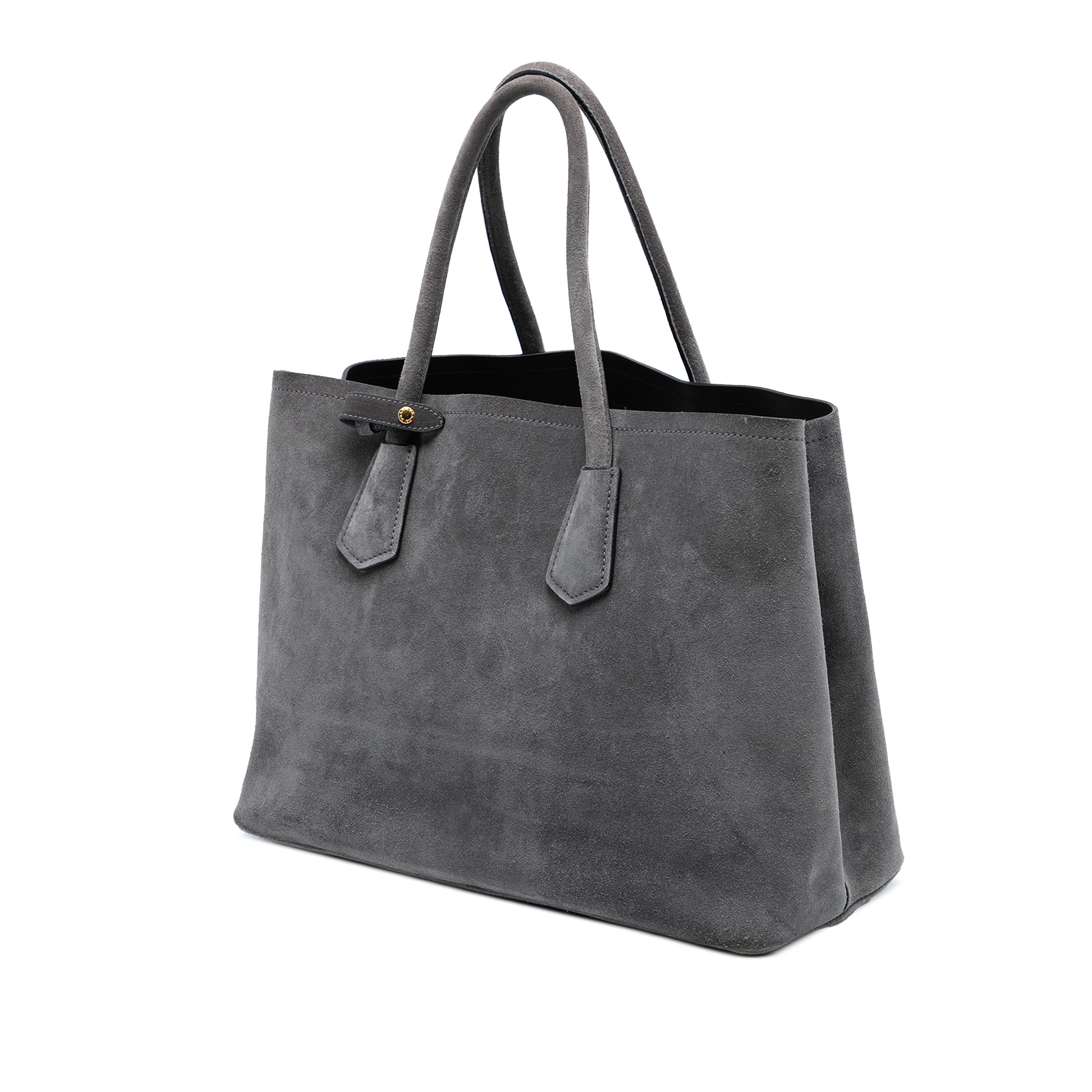 This satchel features a suede leather body, rolled leather handles, a detachable flat leather shoulder strap, an open top, and an interior flap pocket. Retail Price: 1995.00