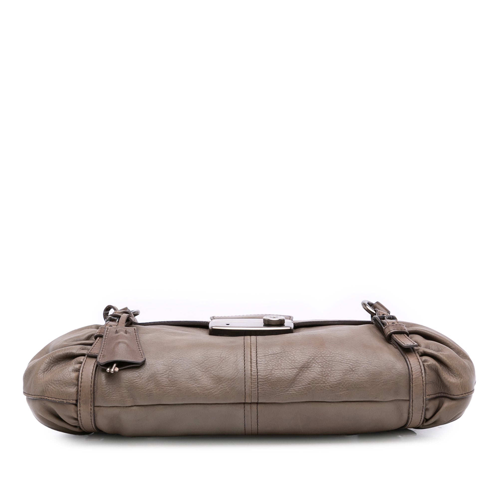 This shoulder bag features a leather body, flat leather handles, a front flap with a push lock closure, and an interior zip pocket. Retail Price: 1195.00