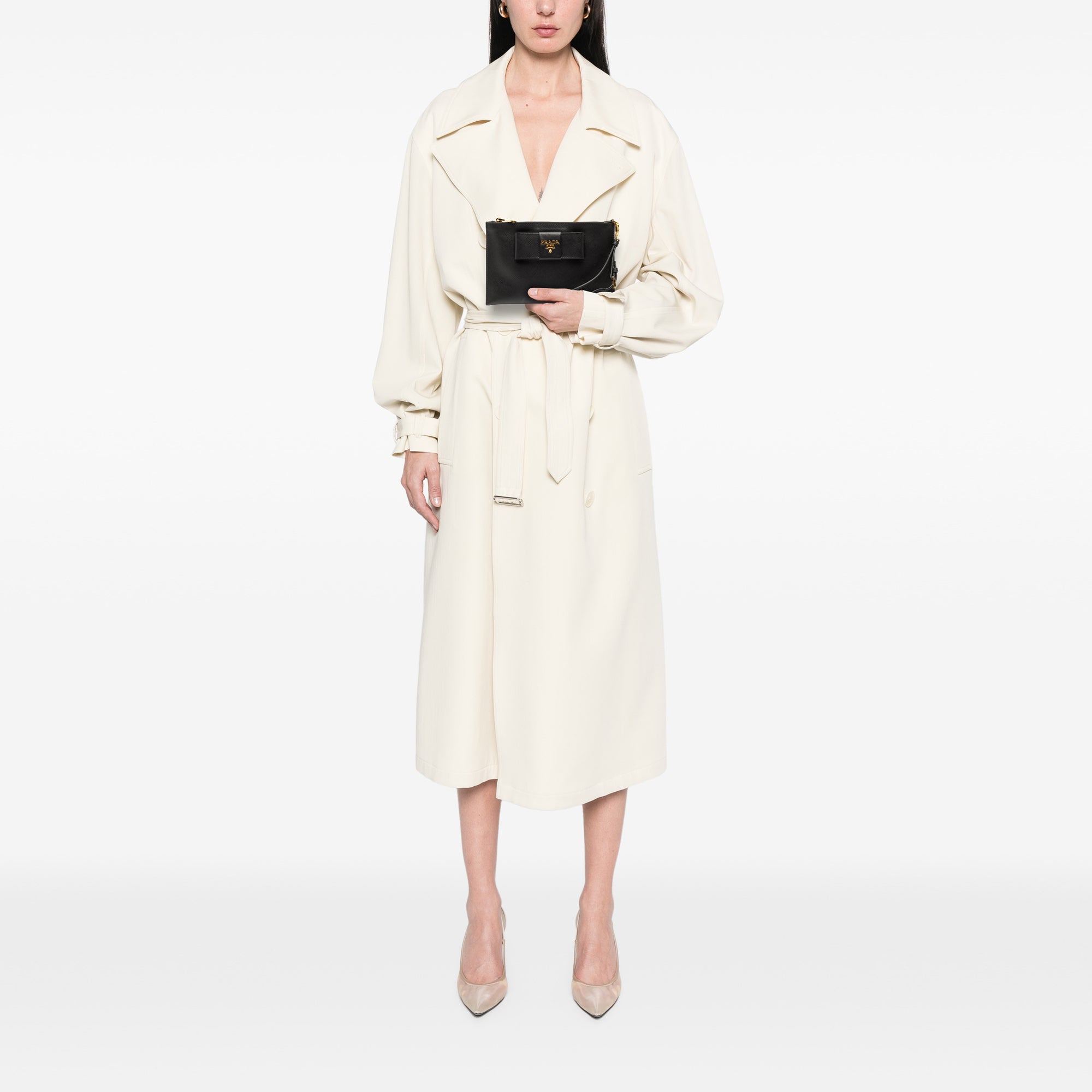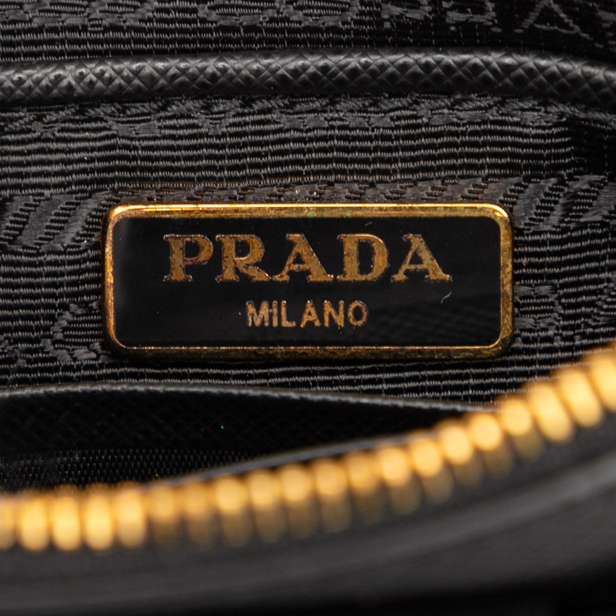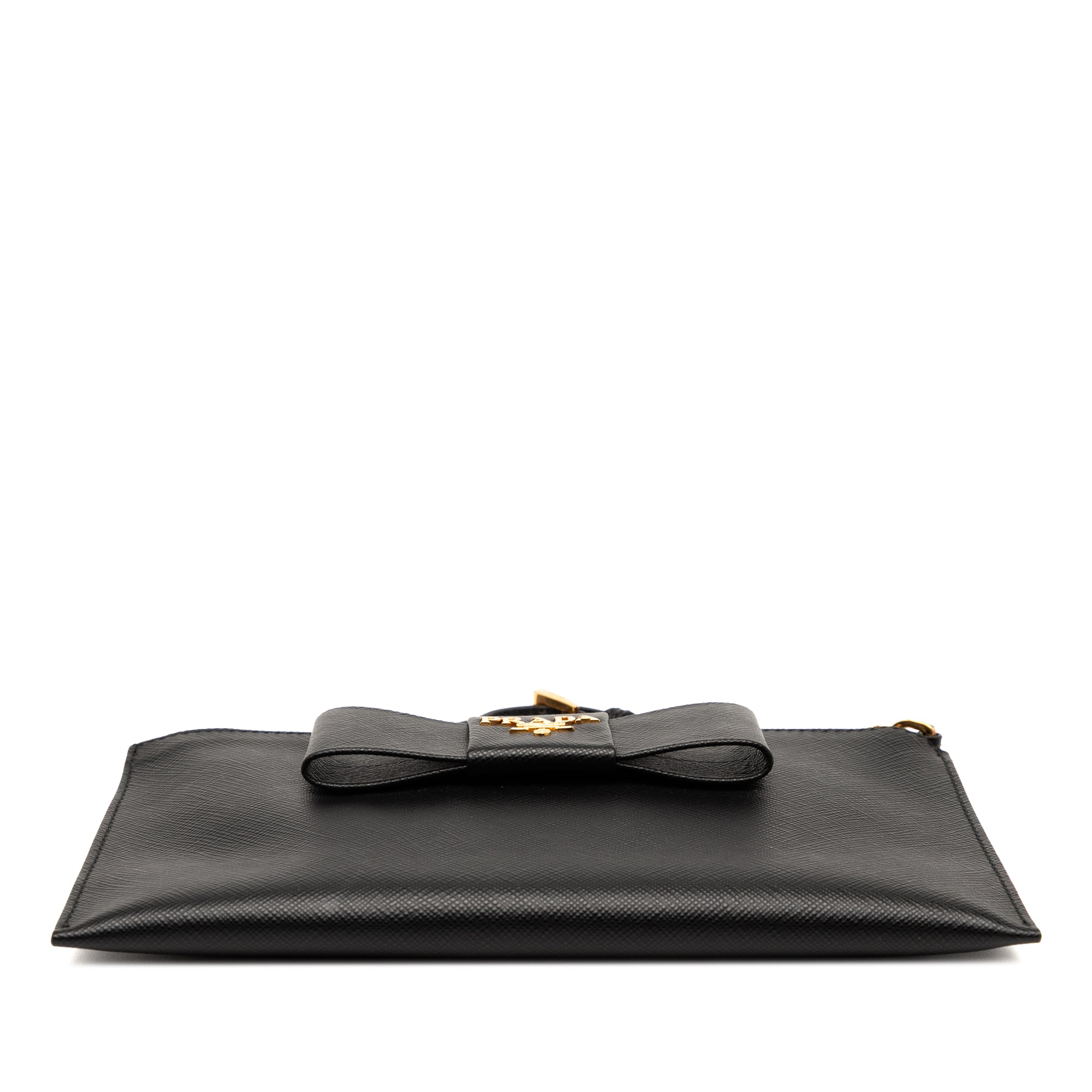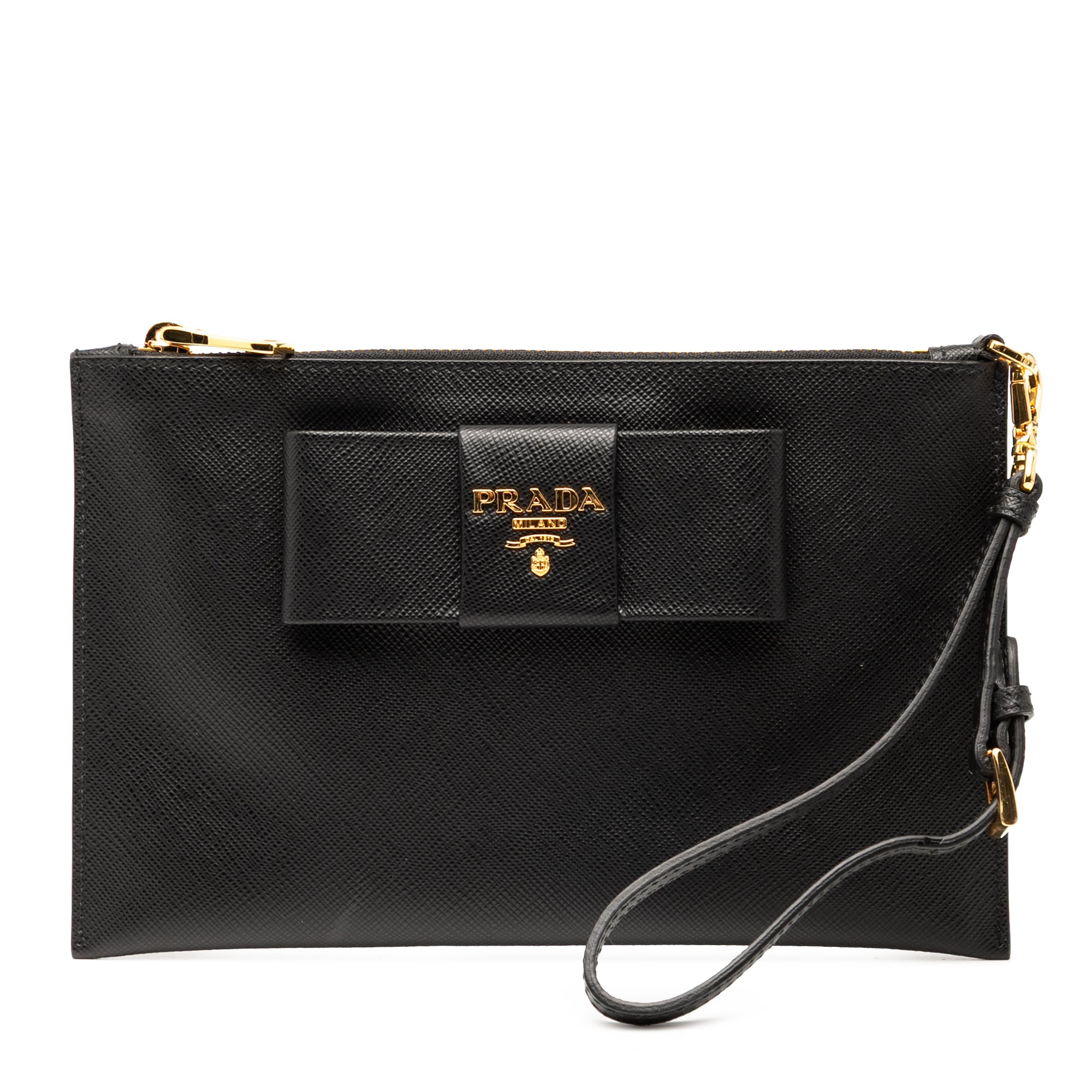 This clutch features a saffiano leather with front bow detail, a detachable flat leather wrist strap, a top zip closure, and interior slip pockets. Inclusion: Dust bag, authenticity card. Retail Price: 650.00