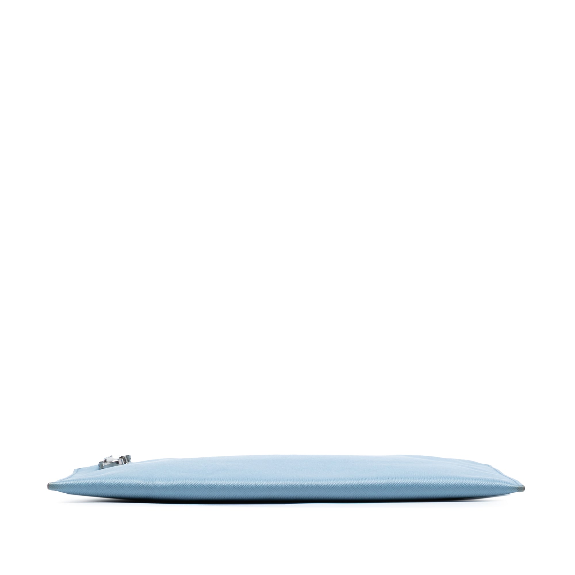 This clutch bag features a saffiano leather body, top zip closure with metal lock closure, and interior zip and slip pockets. Retail Price: 800.00